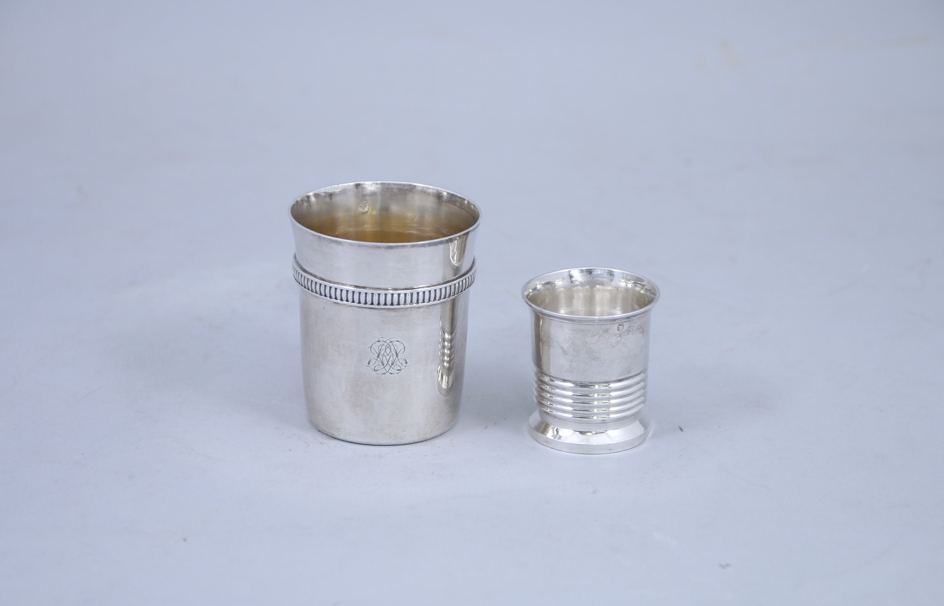 - GOBELET à LIQUEUR. Poinçon Minerve. Maître orfèvre : "L.F". Poids 20 g. Haut. 4,8 cm. (enfoncements).