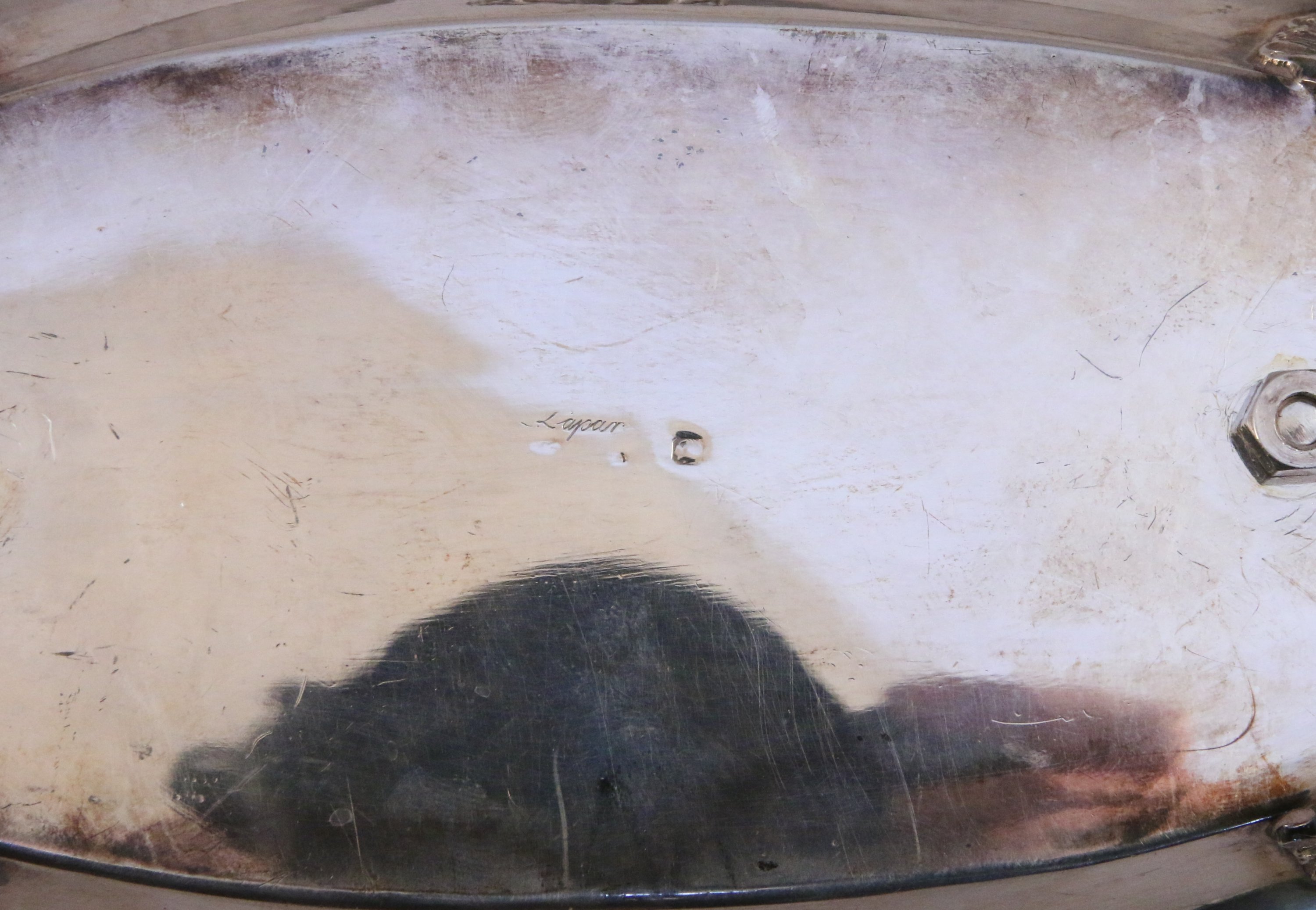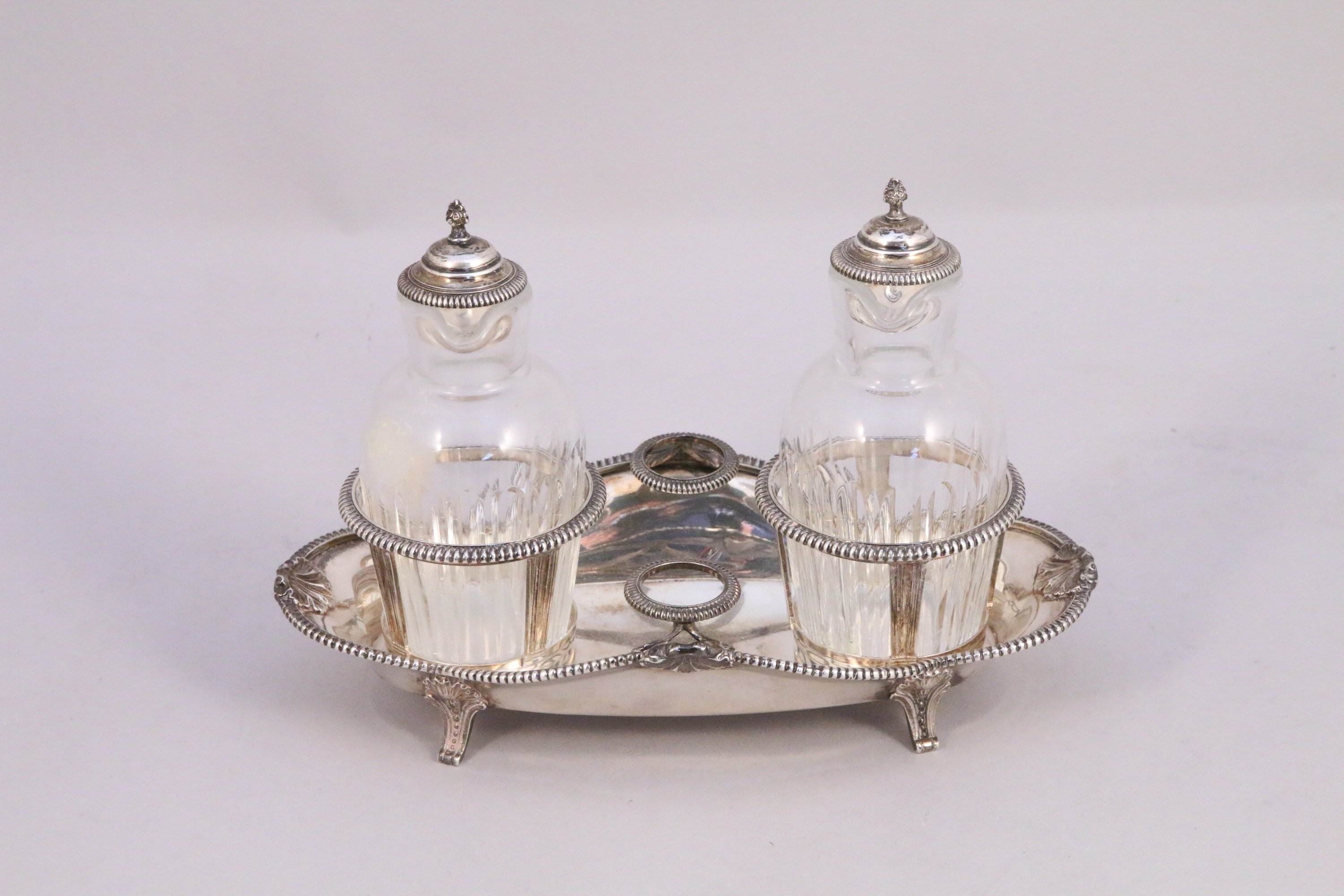 HUILIER-VINAIGRIER en argent sur patins à enroulements de coquille, plateau évasé à contours