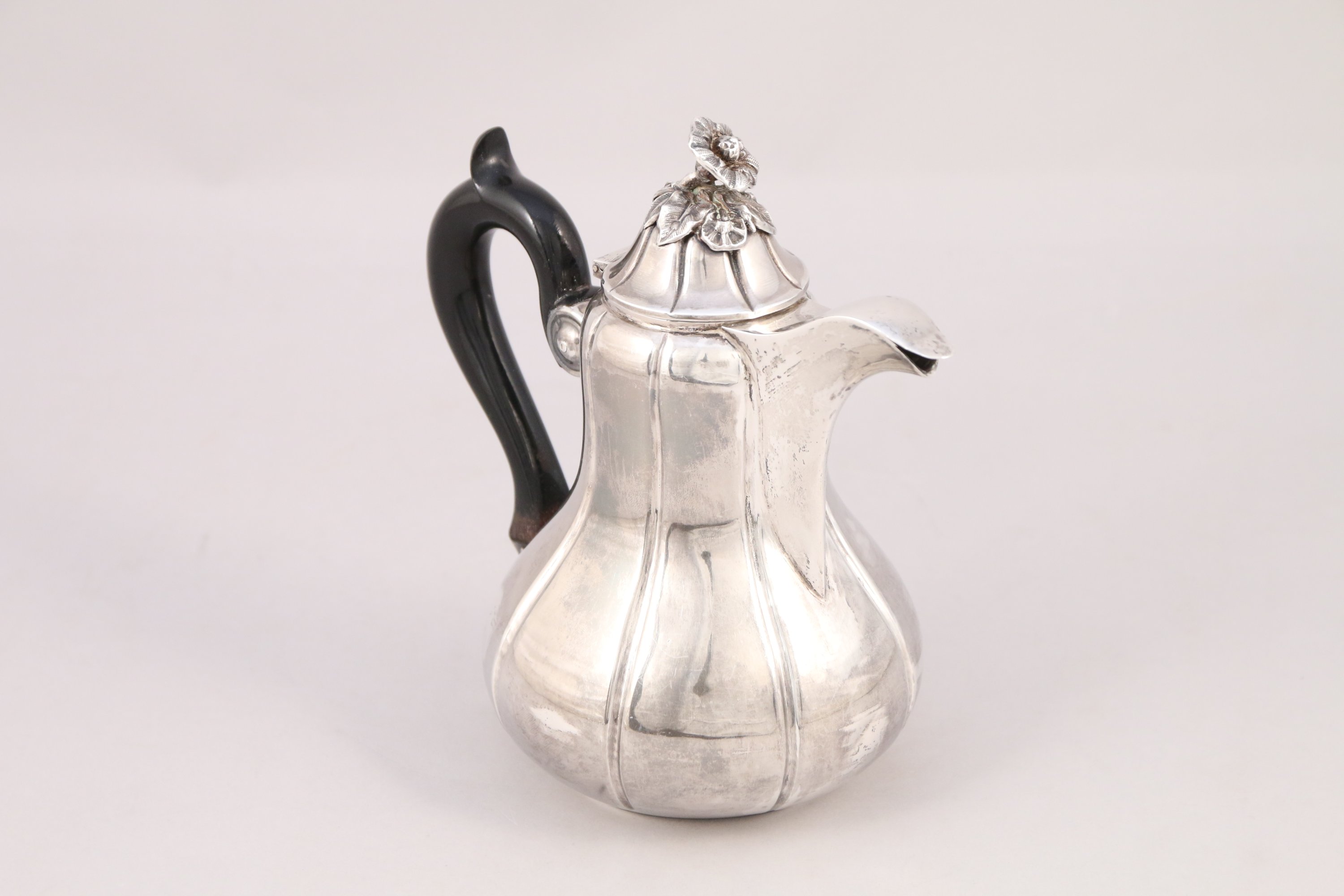 VERSEUSE en argent à la panse renflée à côtés de melon. Le fretel à décor de fleur inscrit sur une terrasse alternant fleurs et feuilles. L'anse en bois noirci.