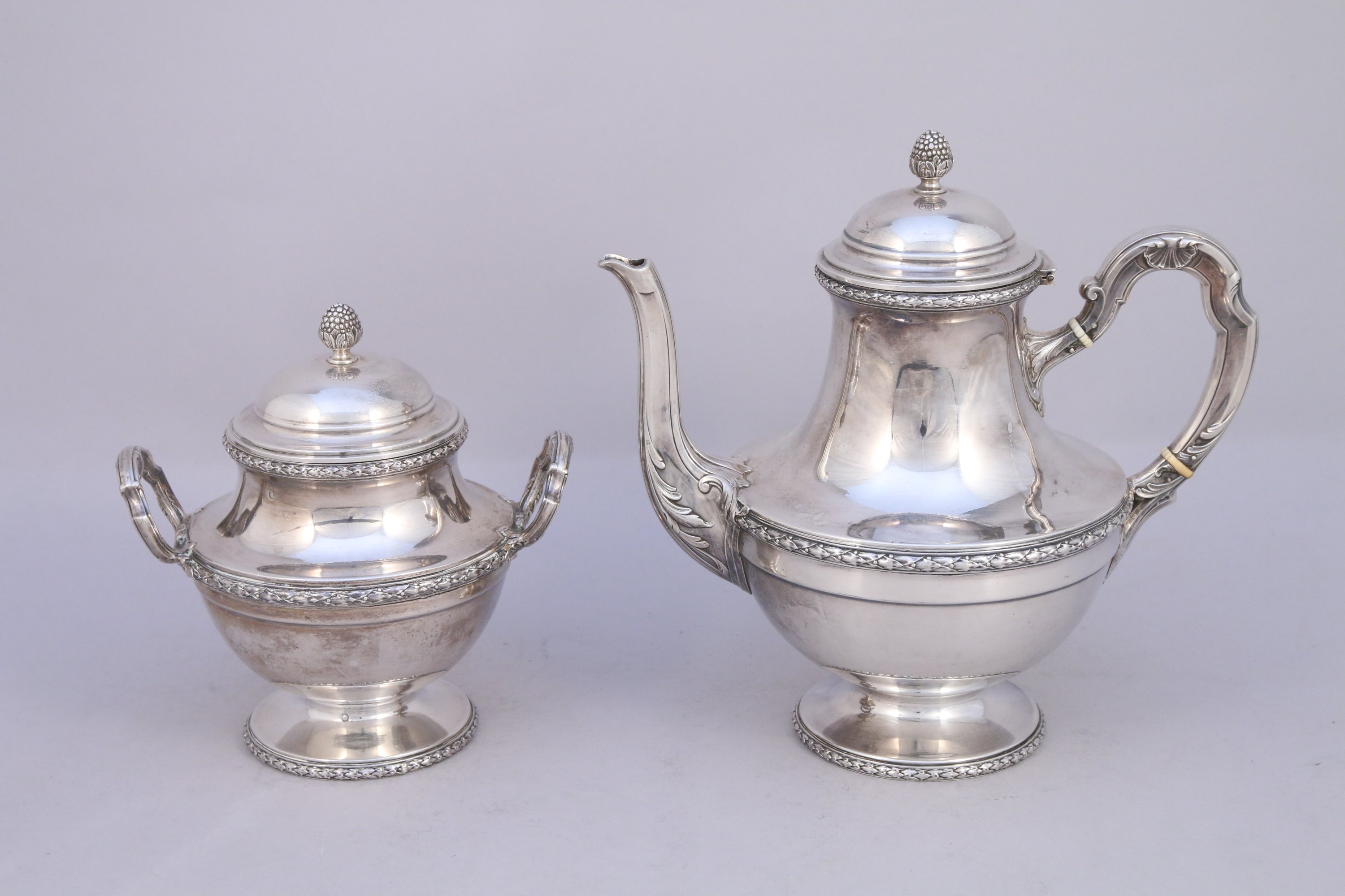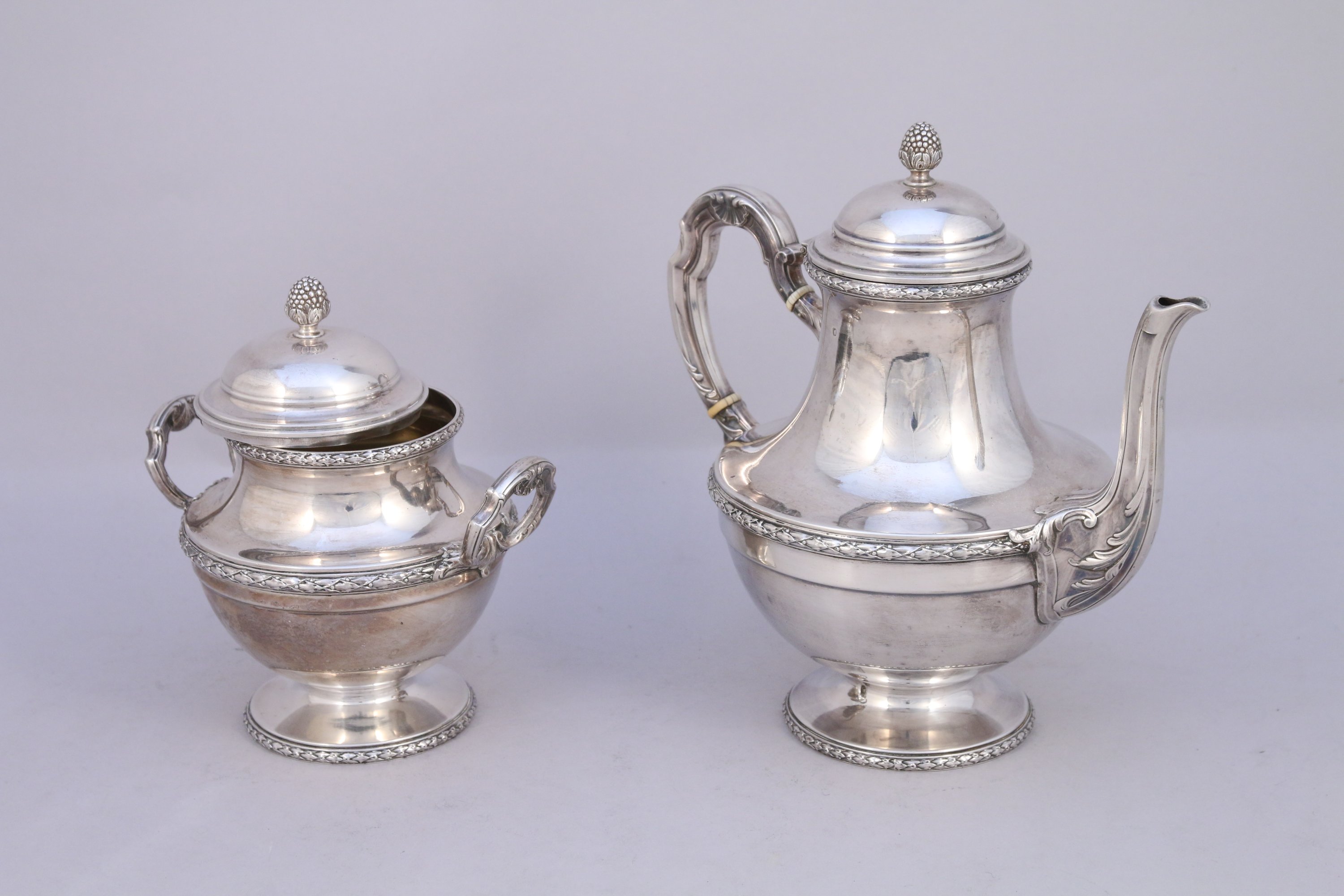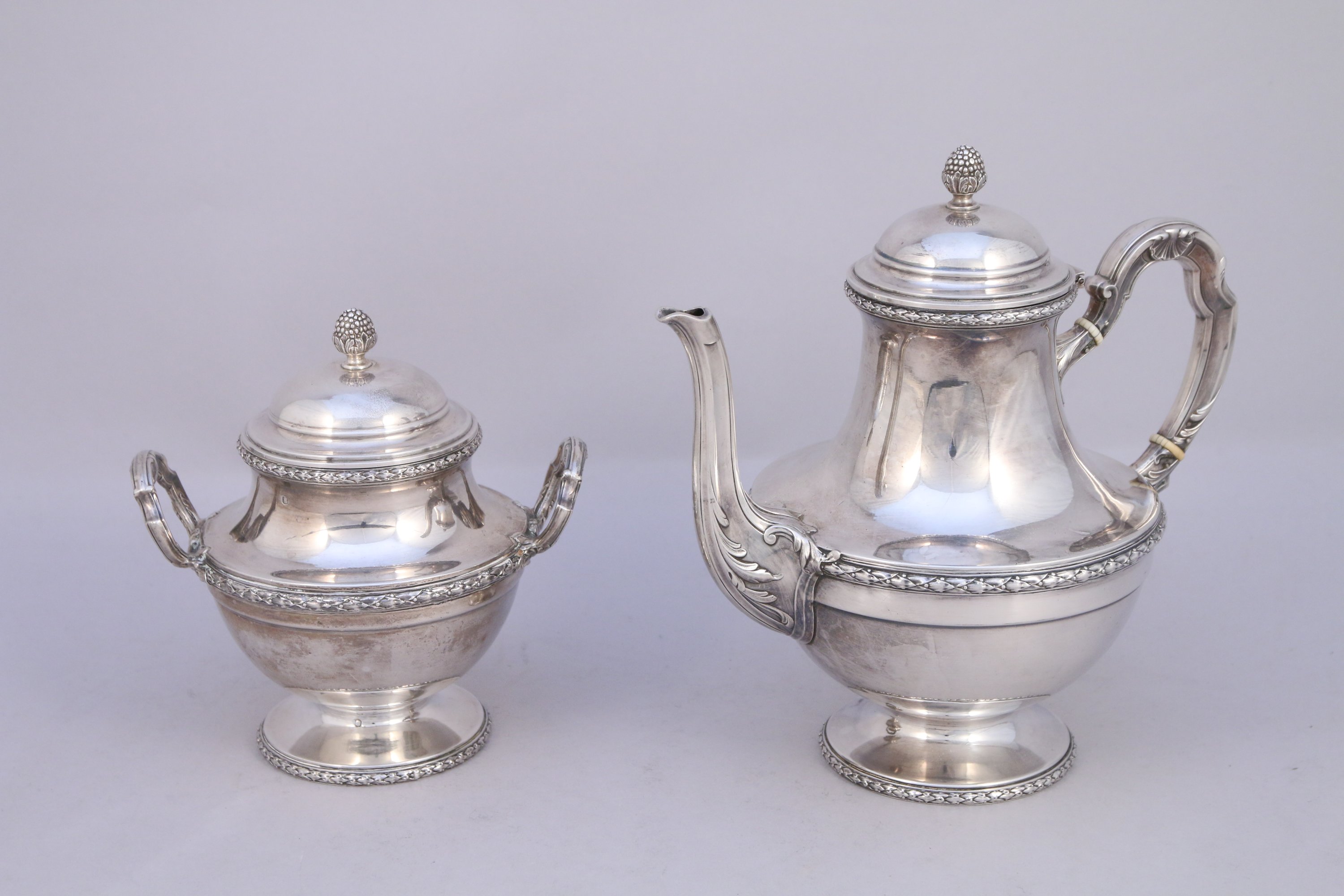 THÉIÈRE et SUCRIER en argent de forme renflée à décor sur le pourtour de frises de tors de lauriers, l'anse de la théière agrémentée de coquilles stylisées et bagues d'ivoire, couvercle surmonté d'un fretel figurant une graine. Intérieur du sucrier vermeillé.