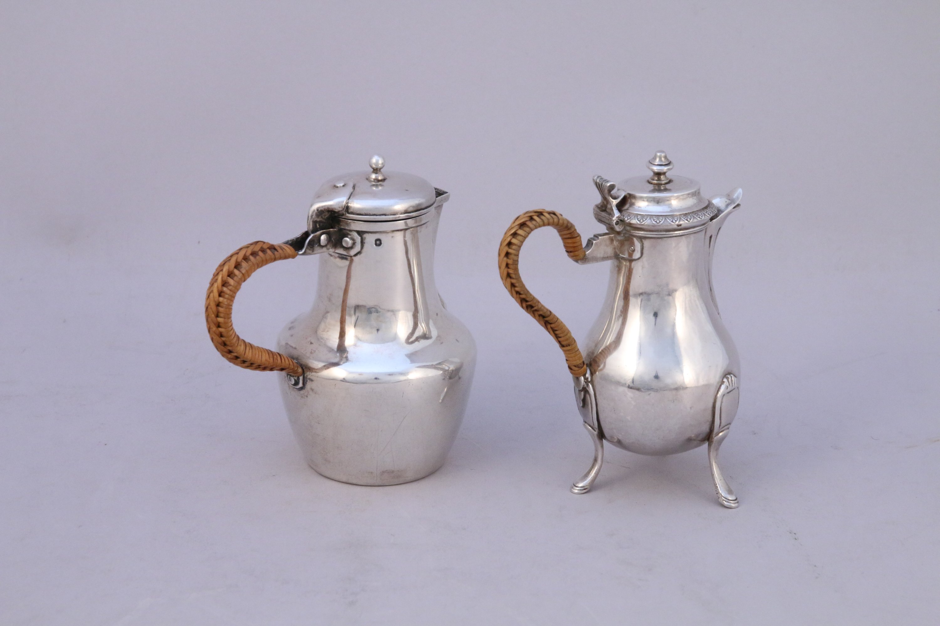 le couvercle à décor gravé d'une frise de palmettes surmonté d'un fretel en forme de toupie. Anse clissée. Poinçon Paris, Premier Coq 950 millième. Orfèvre : Antoine Henry Dubois. Haut. 13 cm. Poids 120 g.