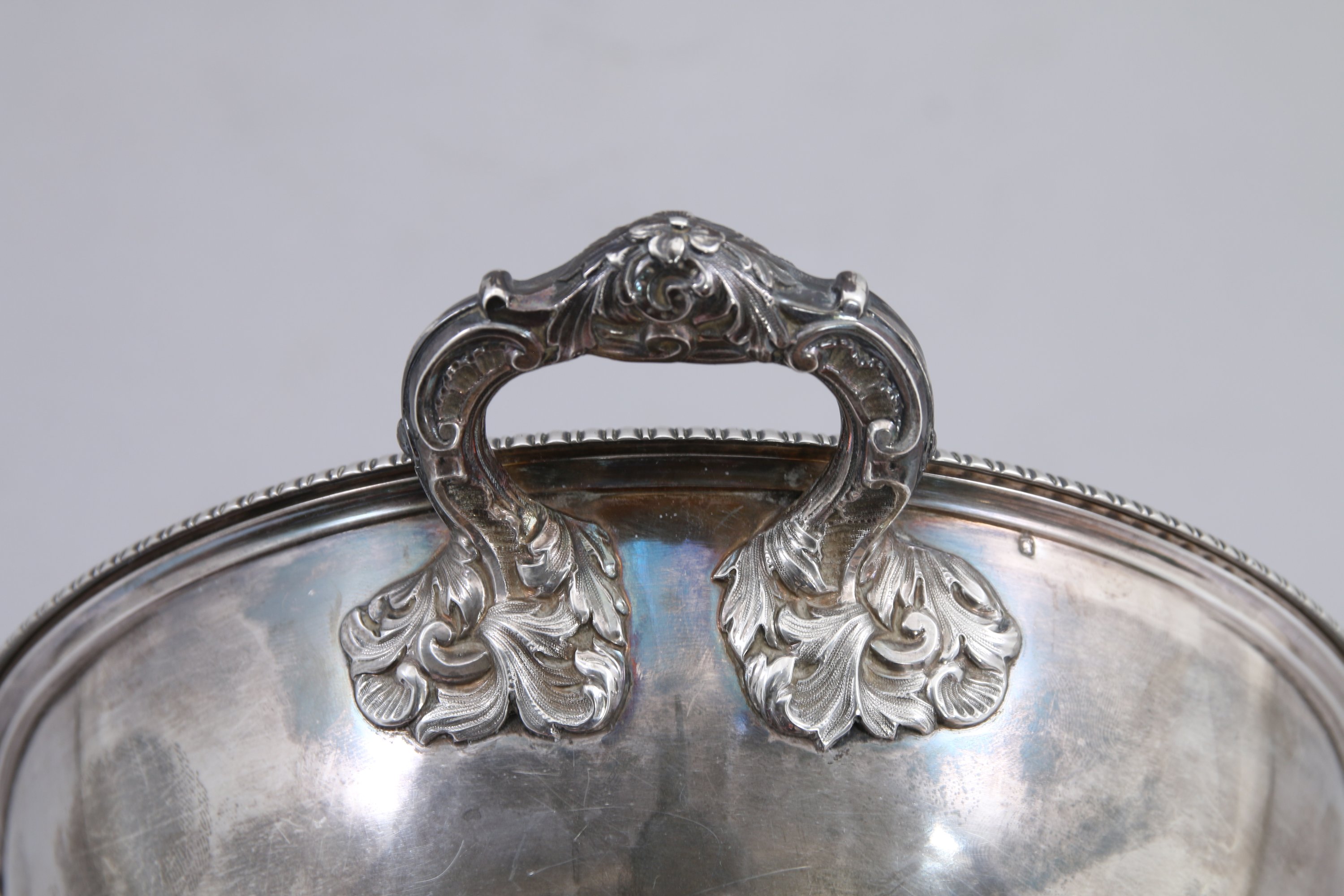 LÉGUMIER en argent aux prises ornées de feuillages et d'entrelacs. Le fretel en forme de grande fleur épanouie. Les deux parties gravées d'un blason surmonté d'un bassinet.