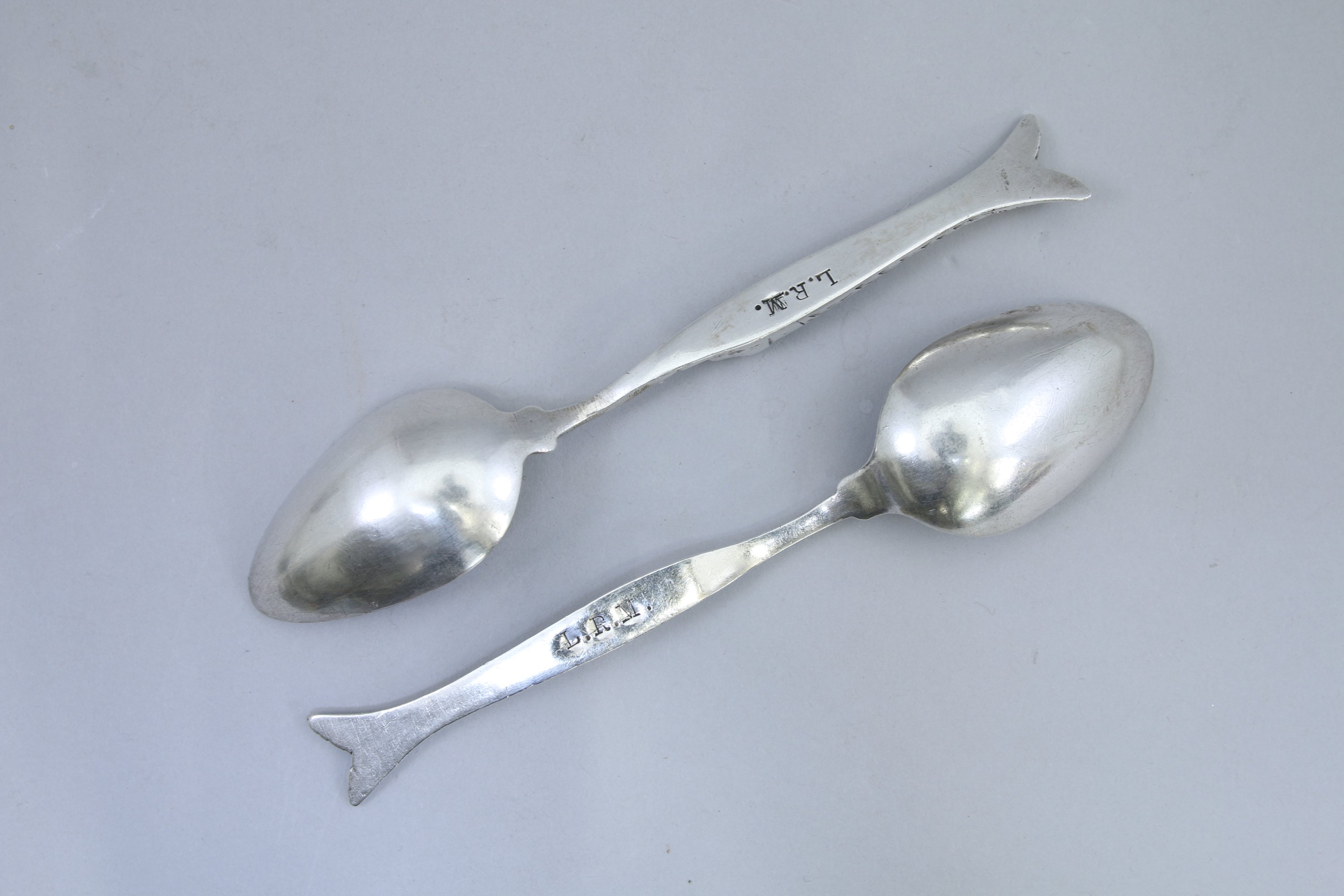 Deux CUILLERS en argent le manche prenant la forme d'un poisson sculpté. Gravé "L.R.M.". Non poinçonnées.