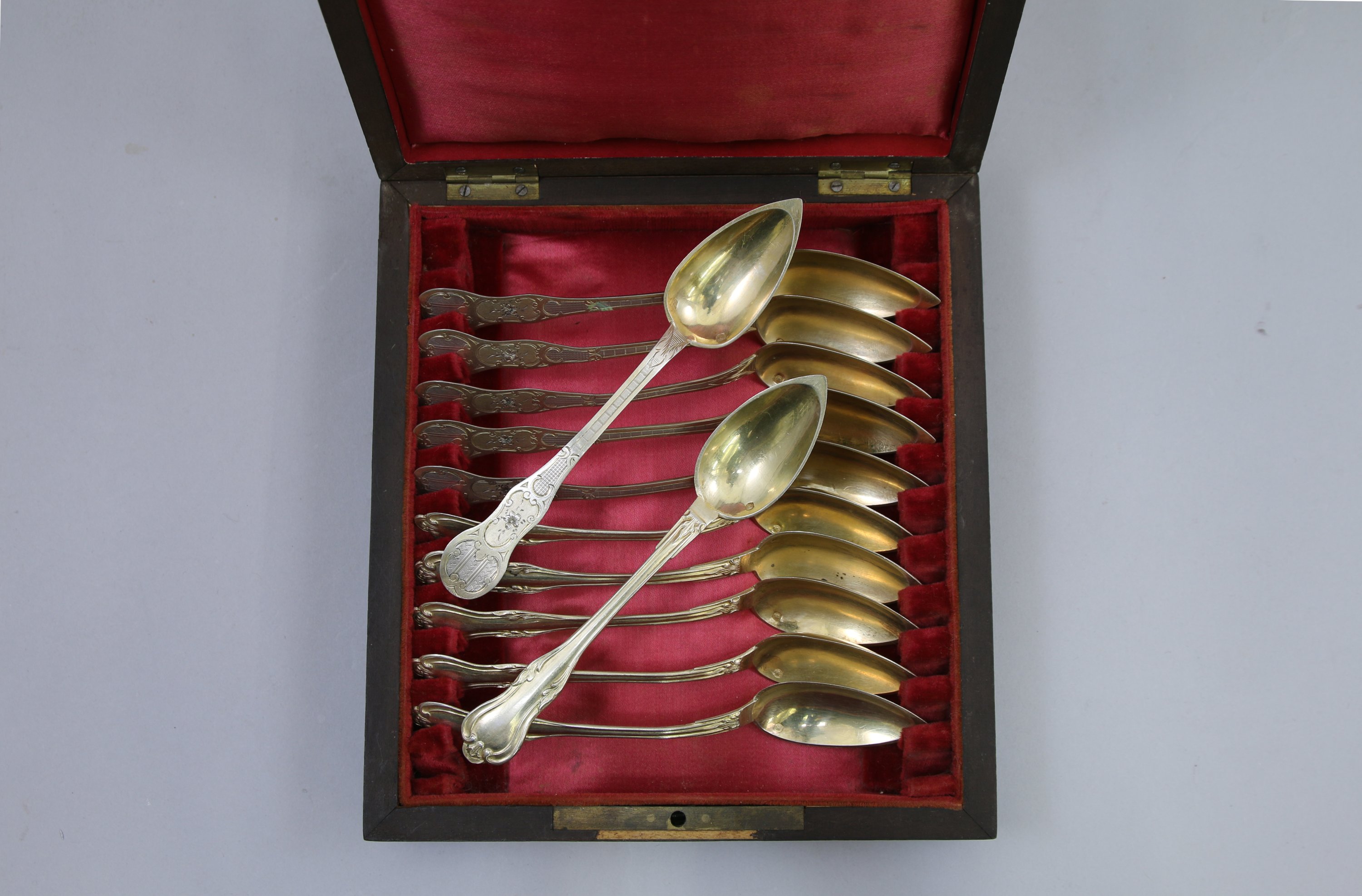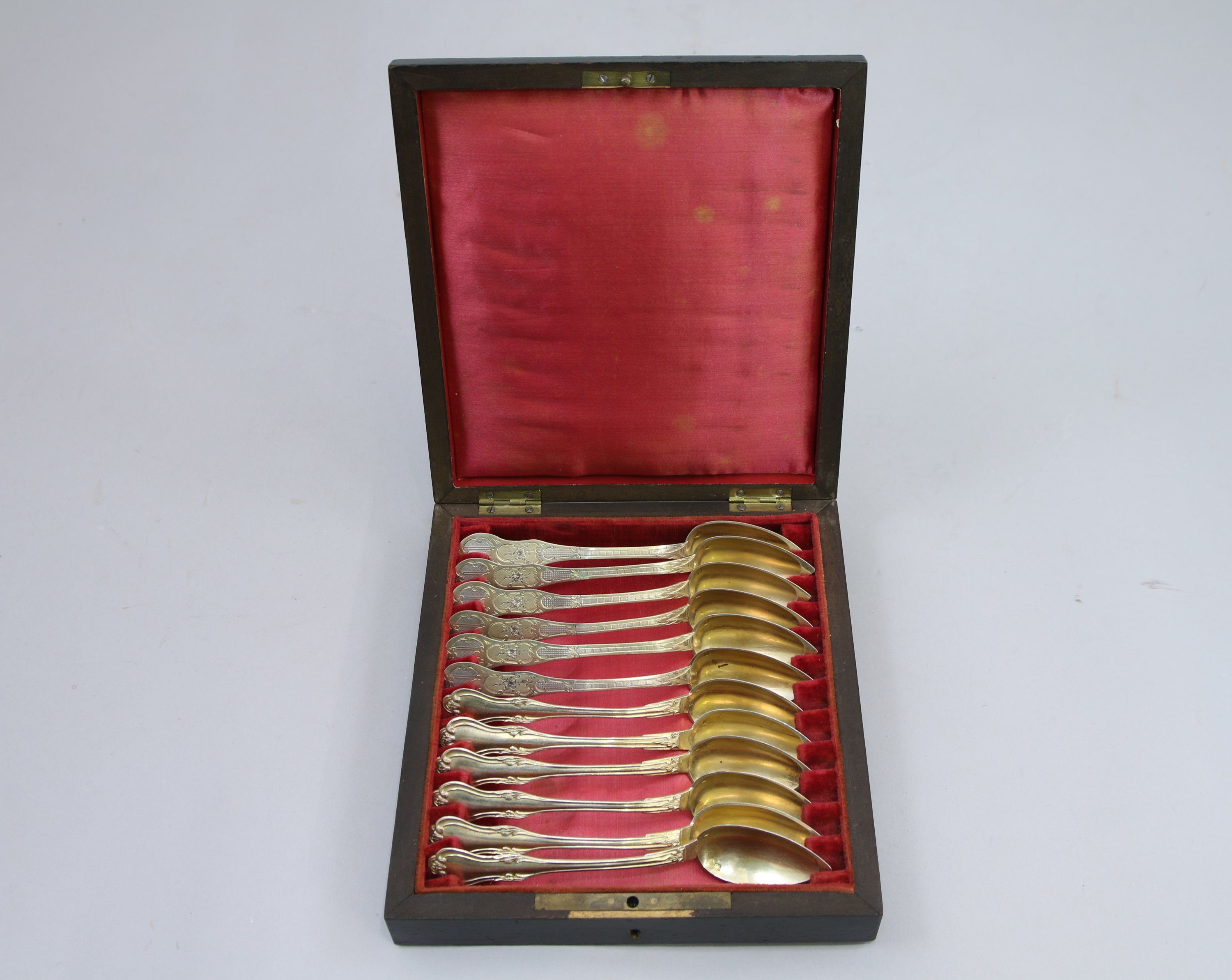 Douze CUILLERS à café en argent doré. Six d'un modèle gravé d'une fleur dans un cartouche, les six autres à filets et rinceaux.