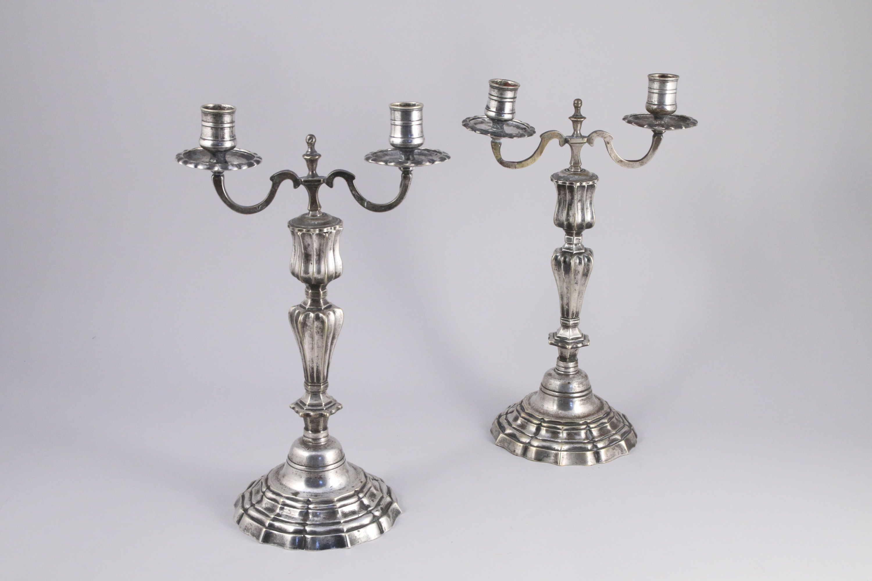 PAIRE de FLAMBEAUX à double lumière en métal argenté reposant sur une base à contours. Fût balustre, sans bobèche.