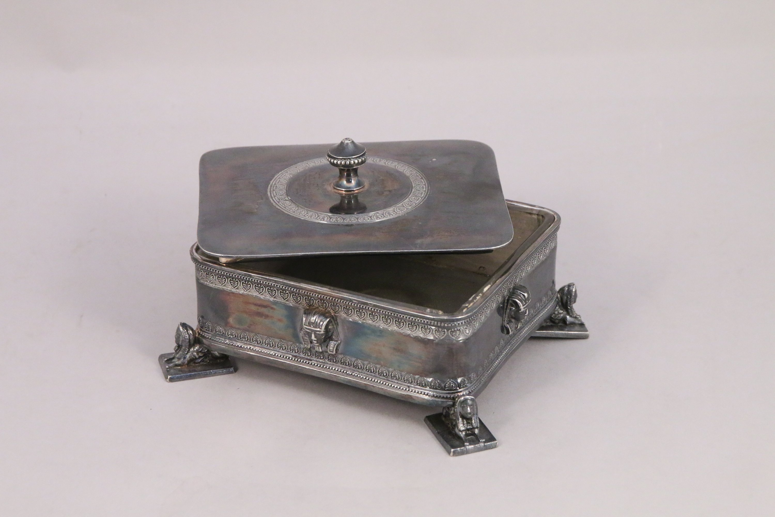 BRODEHEAD&CIE. BOÎTE en métal argenté de forme quadrangulaire, le fretel en forme de toupie, les côtés ornés de têtes de pharaon en relief et bordés de frises de feuilles de lotus et rangs de perles. Repose sur quatre pieds en forme de sphinge. Le ravier en verre fumé.