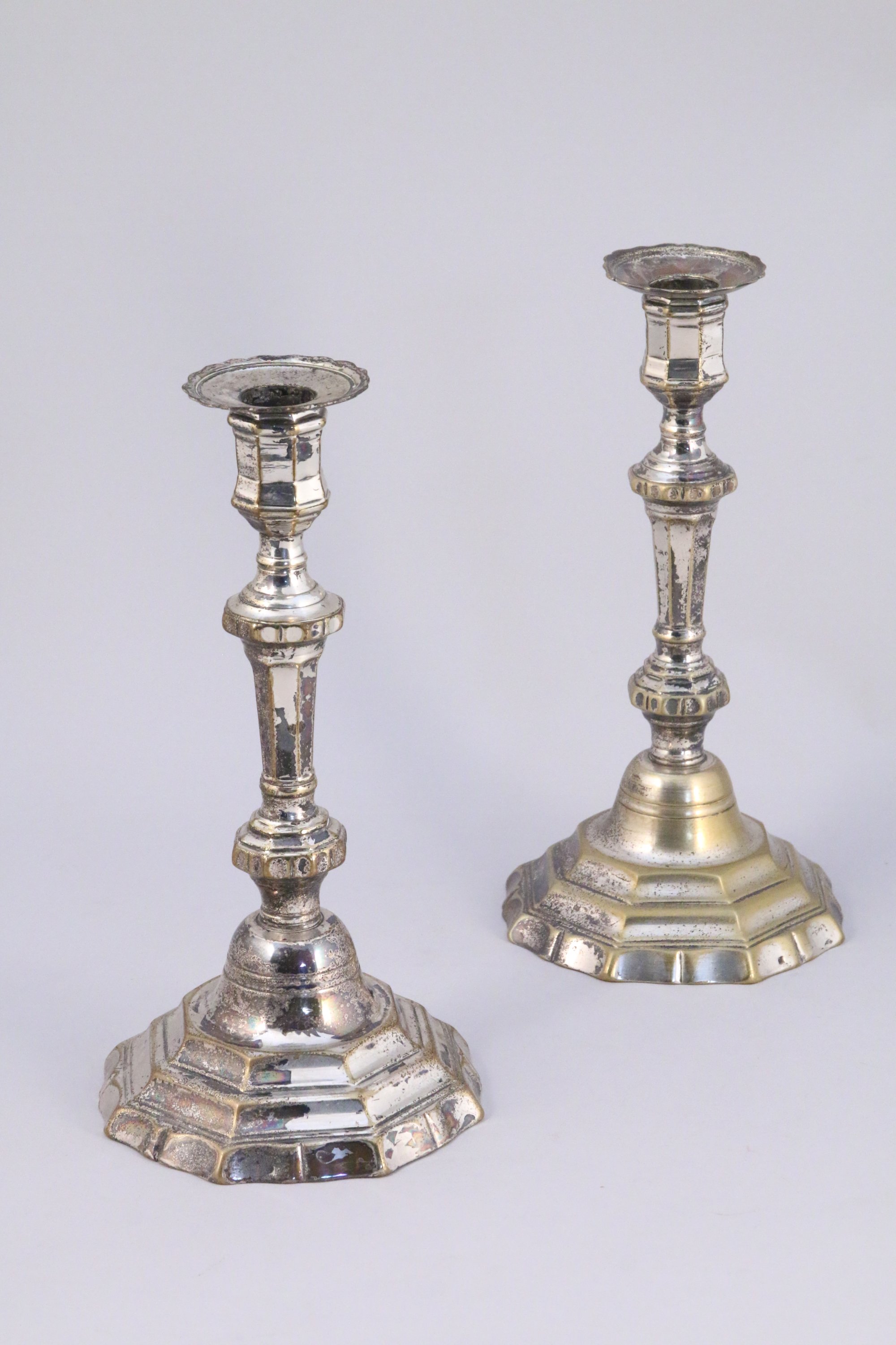 PAIRE de FLAMBEAUX en métal argenté reposant sur une base à contours, le fût à pans et moulures supportant un binet. La base gravée d'armoiries d'alliances surmontées d'une couronne de marquis. Bobèches.