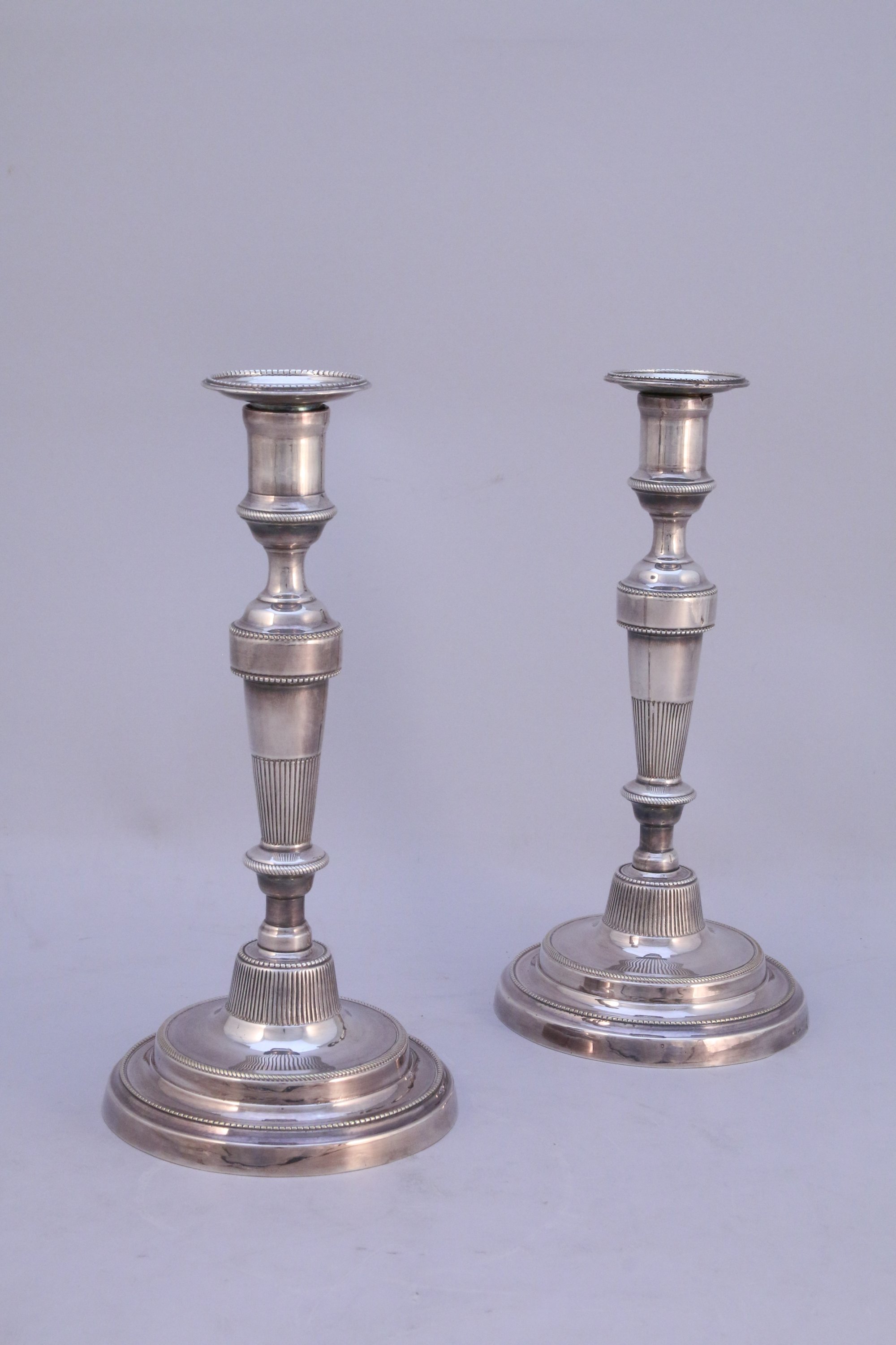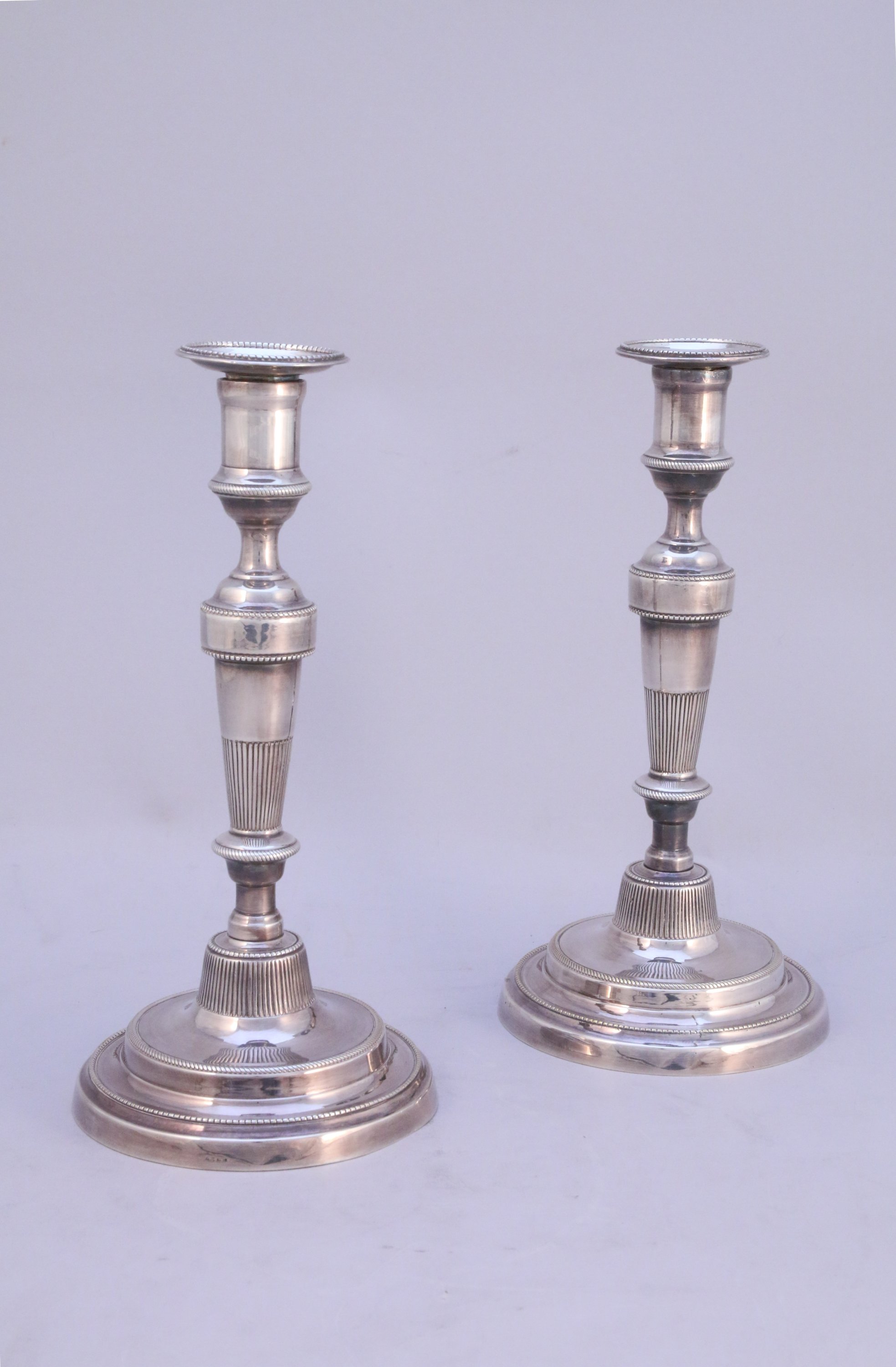 PAIRE de FLAMBEAUX en métal argenté reposant sur une base circulaire, l'ombilic orné de frises de godrons et de perles, le fût orné de plusieurs frises de perles, reprise sur le binet et la bobèche.