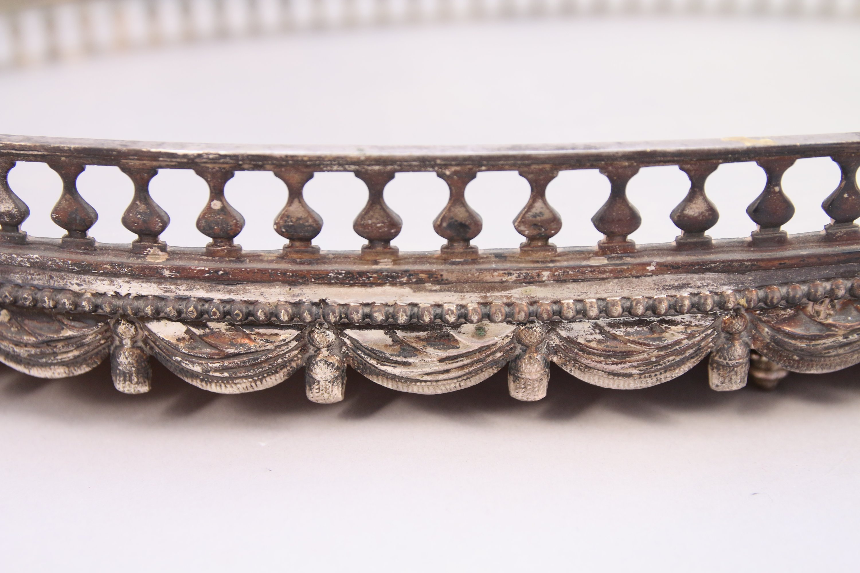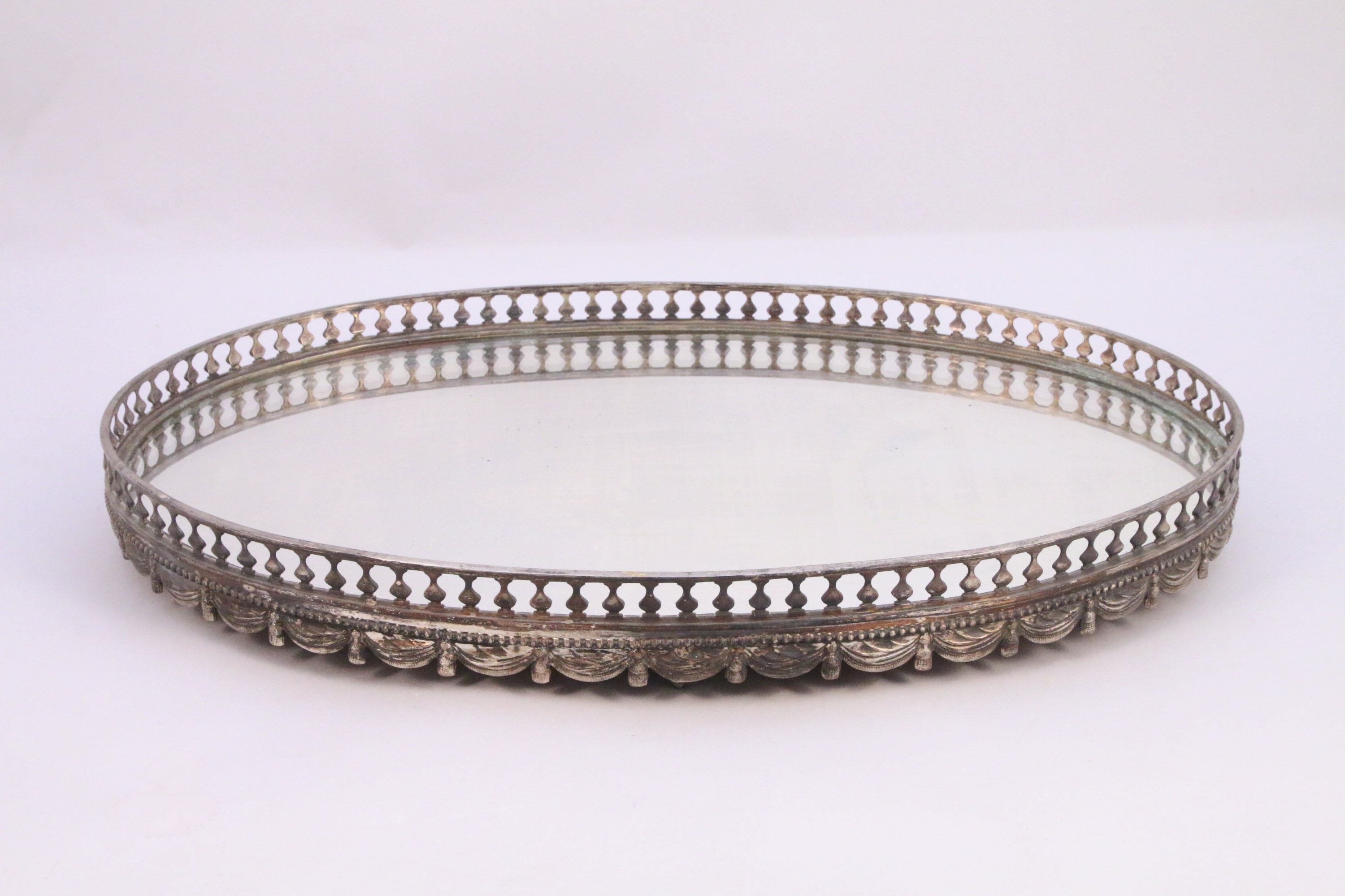 SURTOUT de TABLE de forme ovale, en métal argenté. Ceint d'une galerie aux colonnes balustres surplombant une frise de perles et de chutes. Fond miroir. Repose sur quatre pieds toupies.