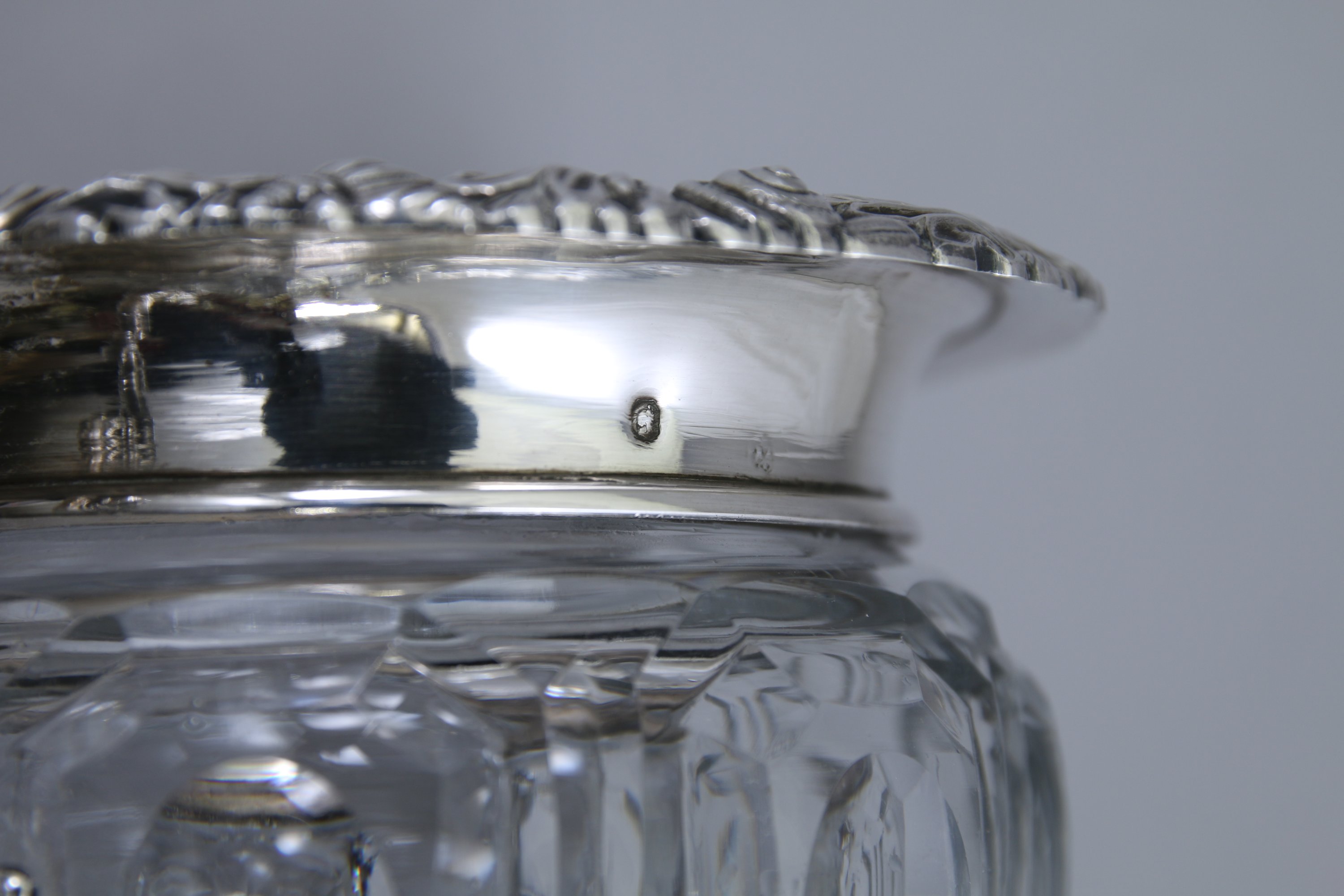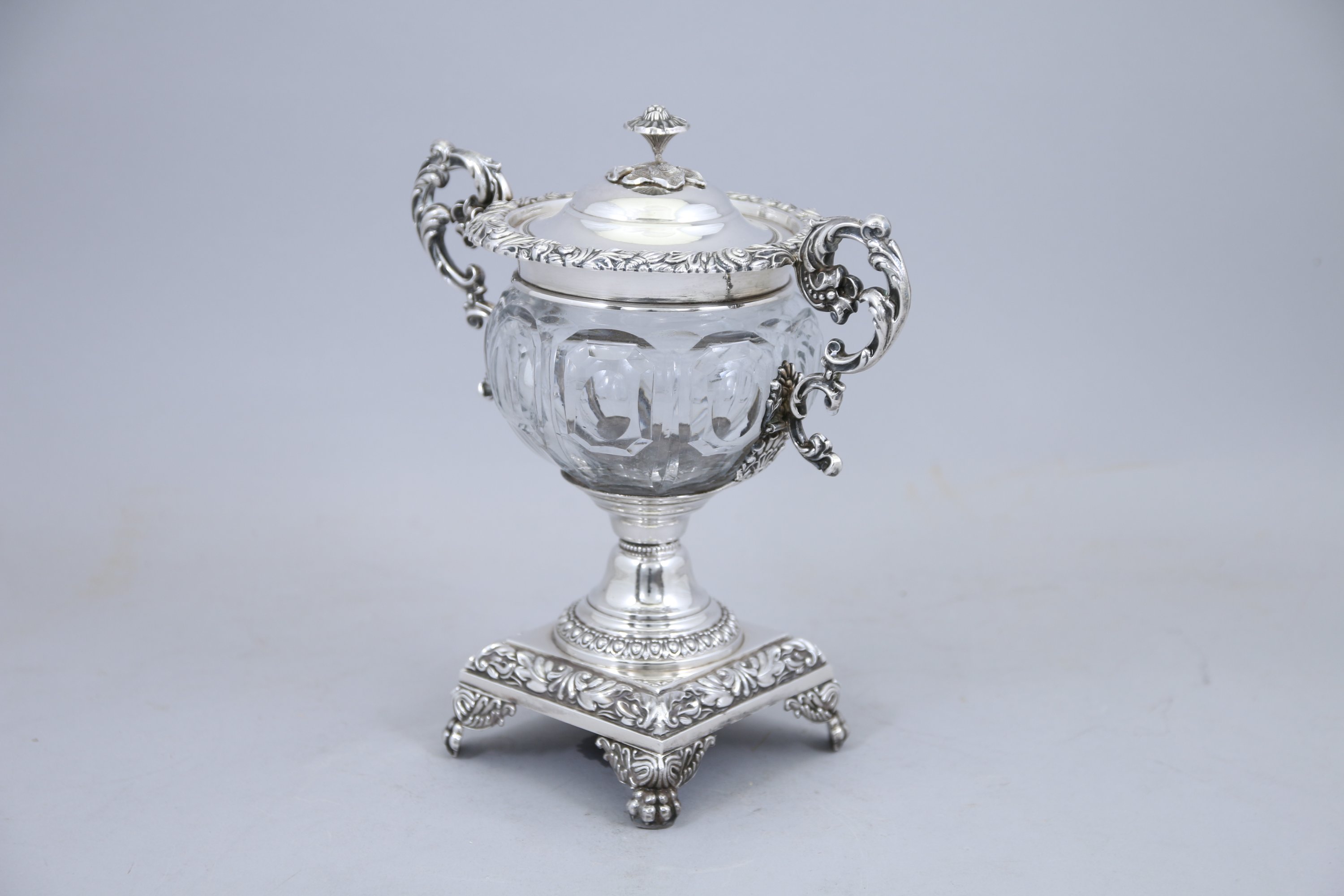 DRAGEOIR en cristal et argent, le couvercle à la prise en forme de fleurs épanouie sur une terrasse feuillagée. Deux anses en forme de rinceaux et feuilles d'acanthe prenant appui sur le col et se terminant sur la panse. Le piédouche se terminant par un motif de rang d'oves. Repose sur quatre pieds griffes.