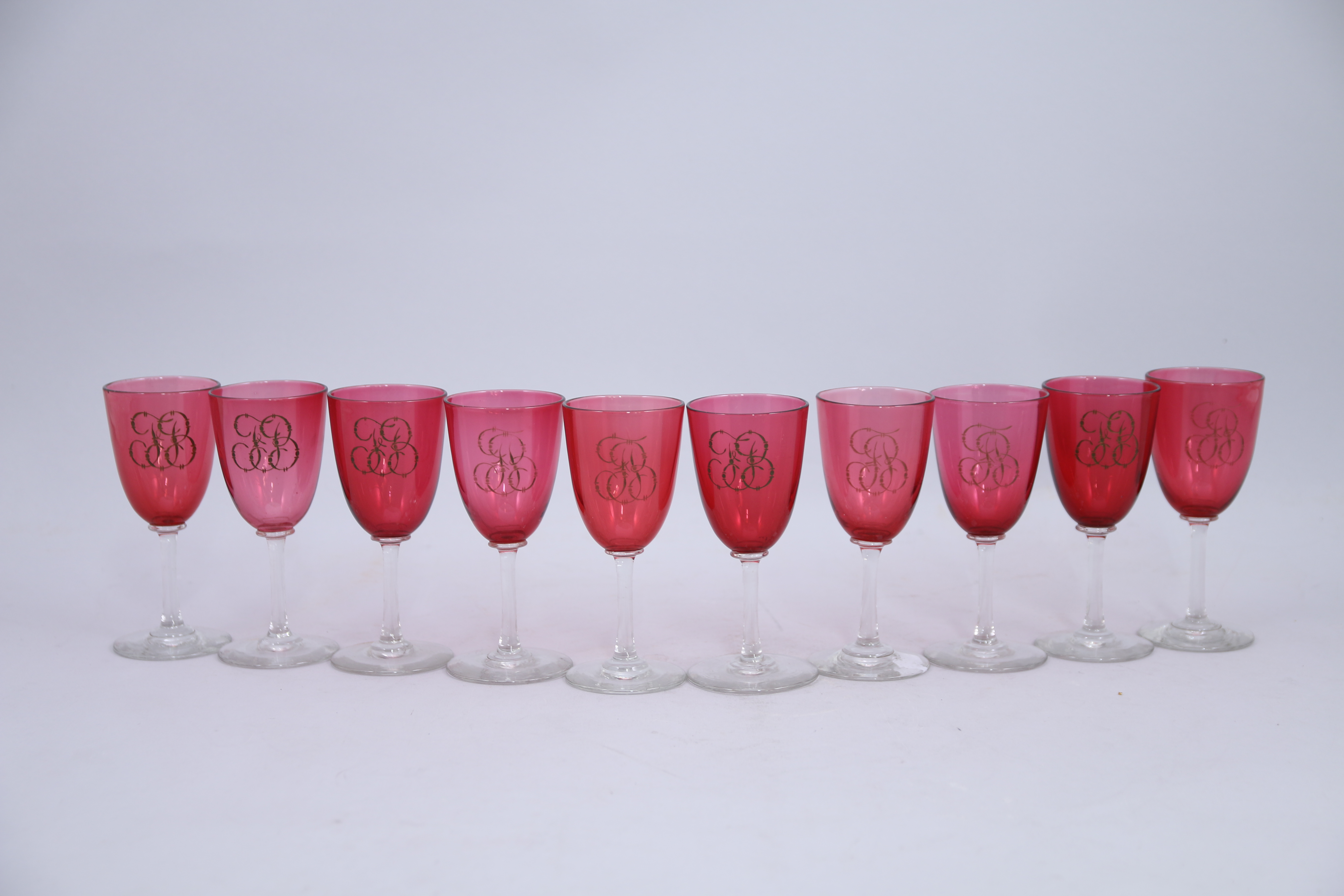 ENSEMBLE de dix VERRES à VIN en cristal blanc et rose, la panse monogrammée « FB ».