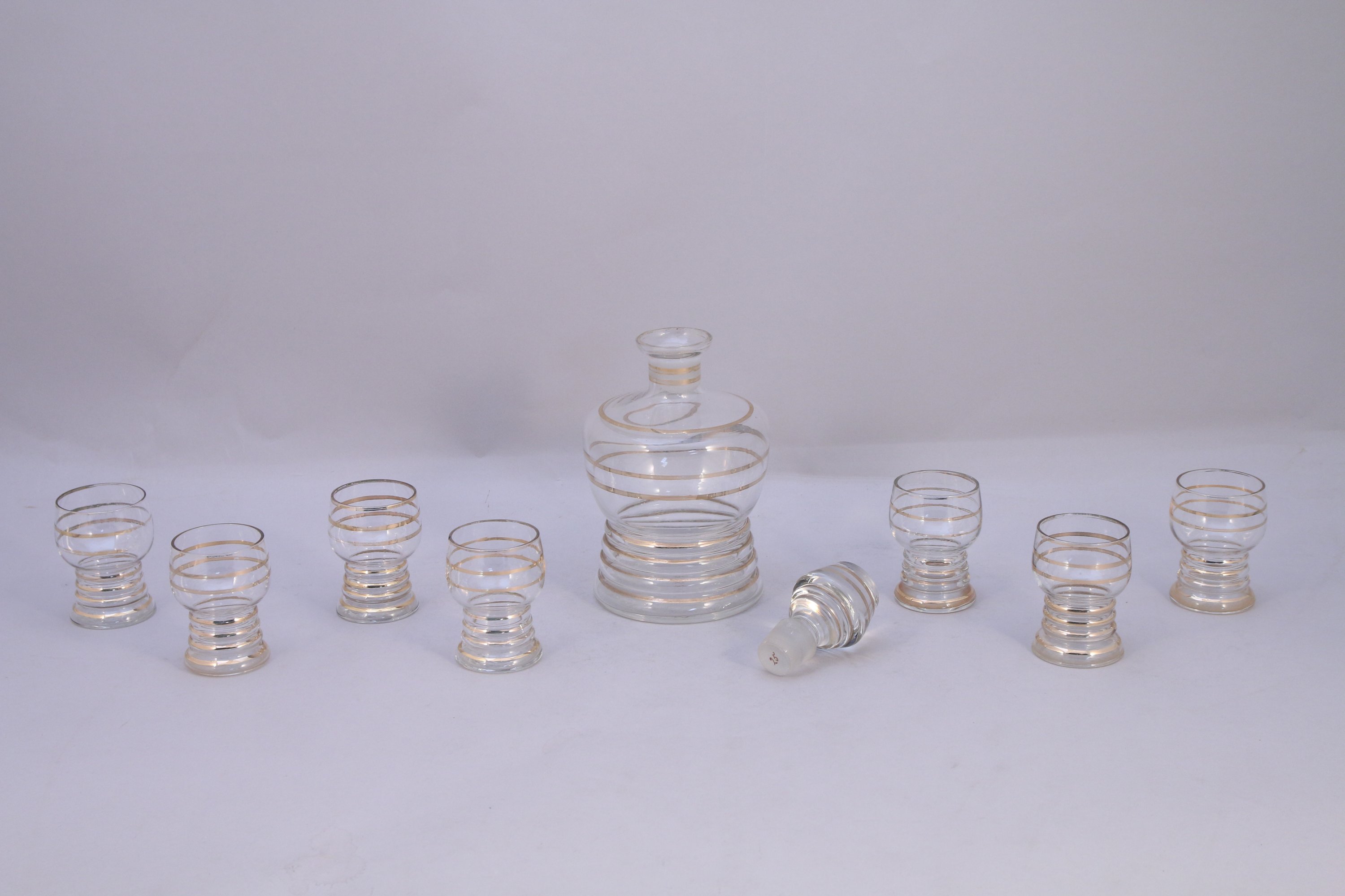 BOHÈME. SERVICE à PORTO, huit pièces comprenant une CARAFE et sept VERRES de formes renflées à décor de filets or, pied mouluré. Marqué TCHÉCOSLOVAQUIE.