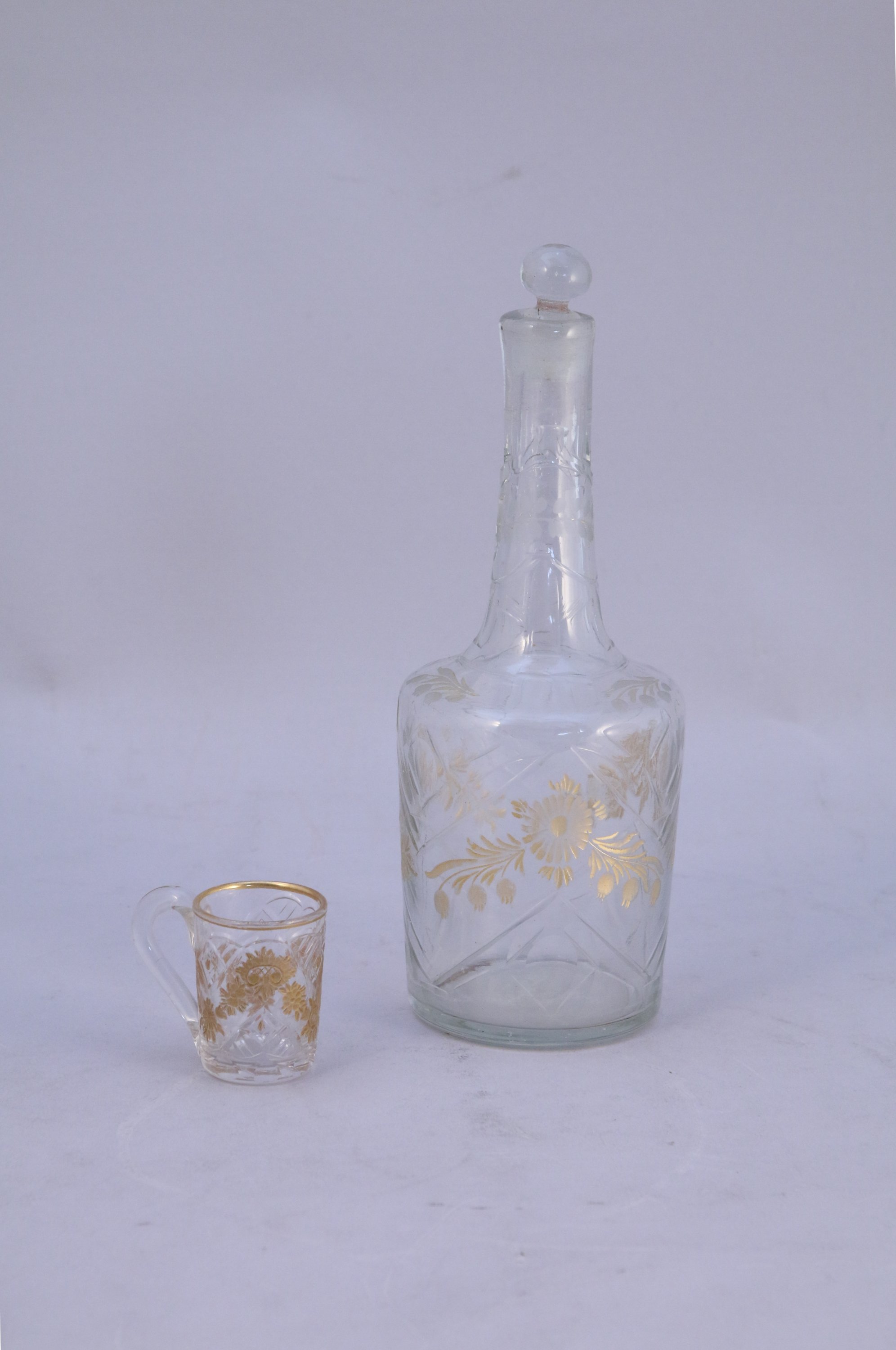 JOINTS : UN CARAFON en verre soufflé à décor gravé et rehauts d'or à motifs de fleurs er rameaux (Haut. 23,5 cm.) et UNE PETITE CHOPPE en verre à décor gravé et rehauts d'or de guirlandes de fleurs. (Haut. 4,5 cm.).