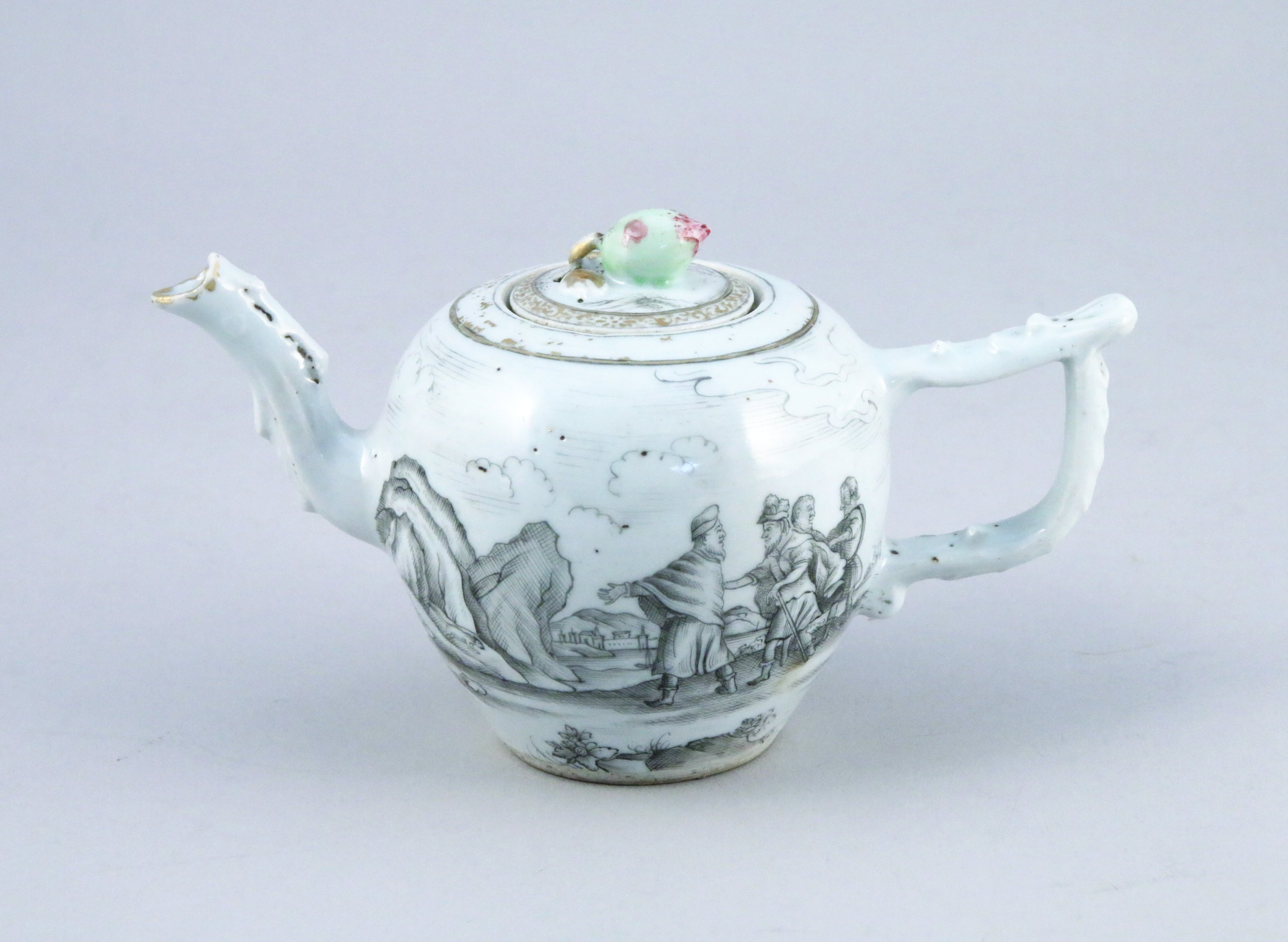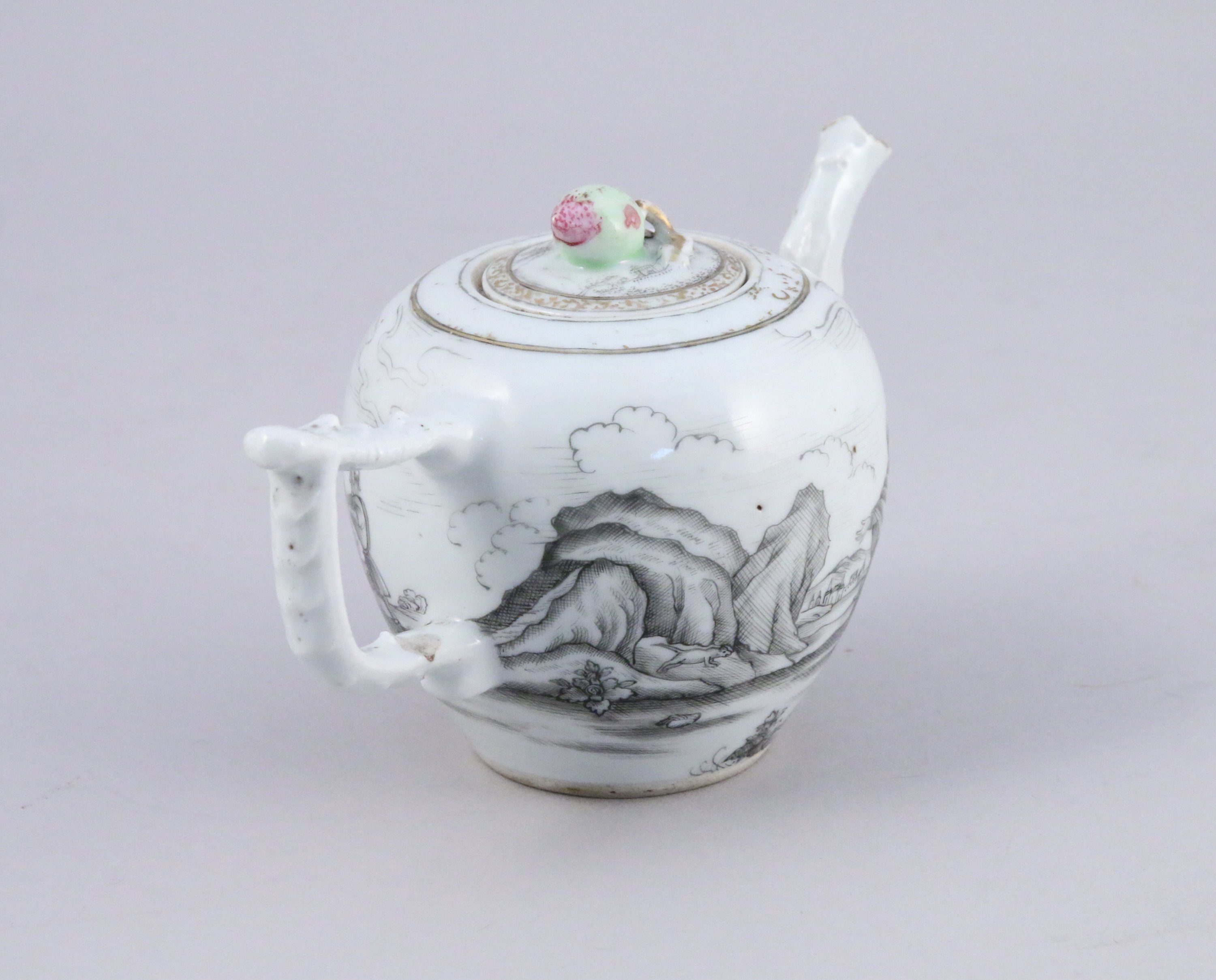THÉIÈRE en porcelaine à décor de grisailles figurant des hommes sur un fond de paysage lacustre et montagneux.