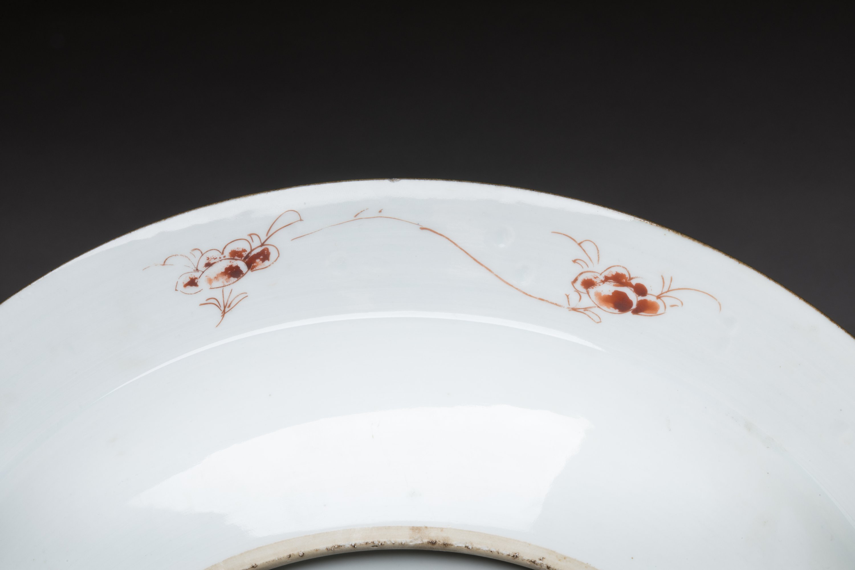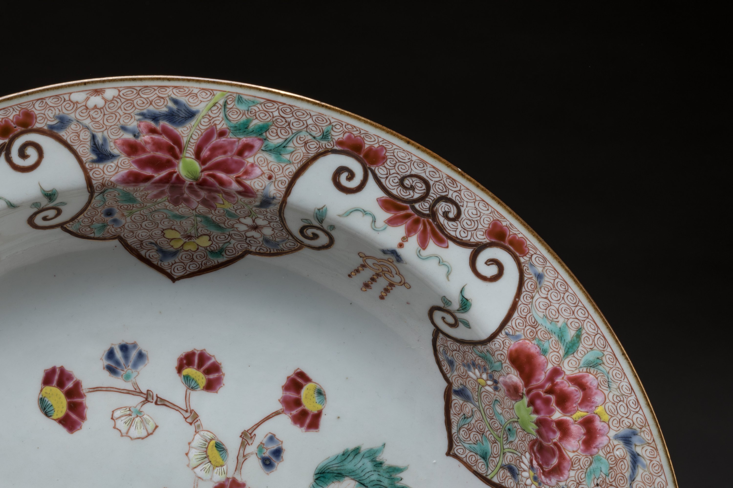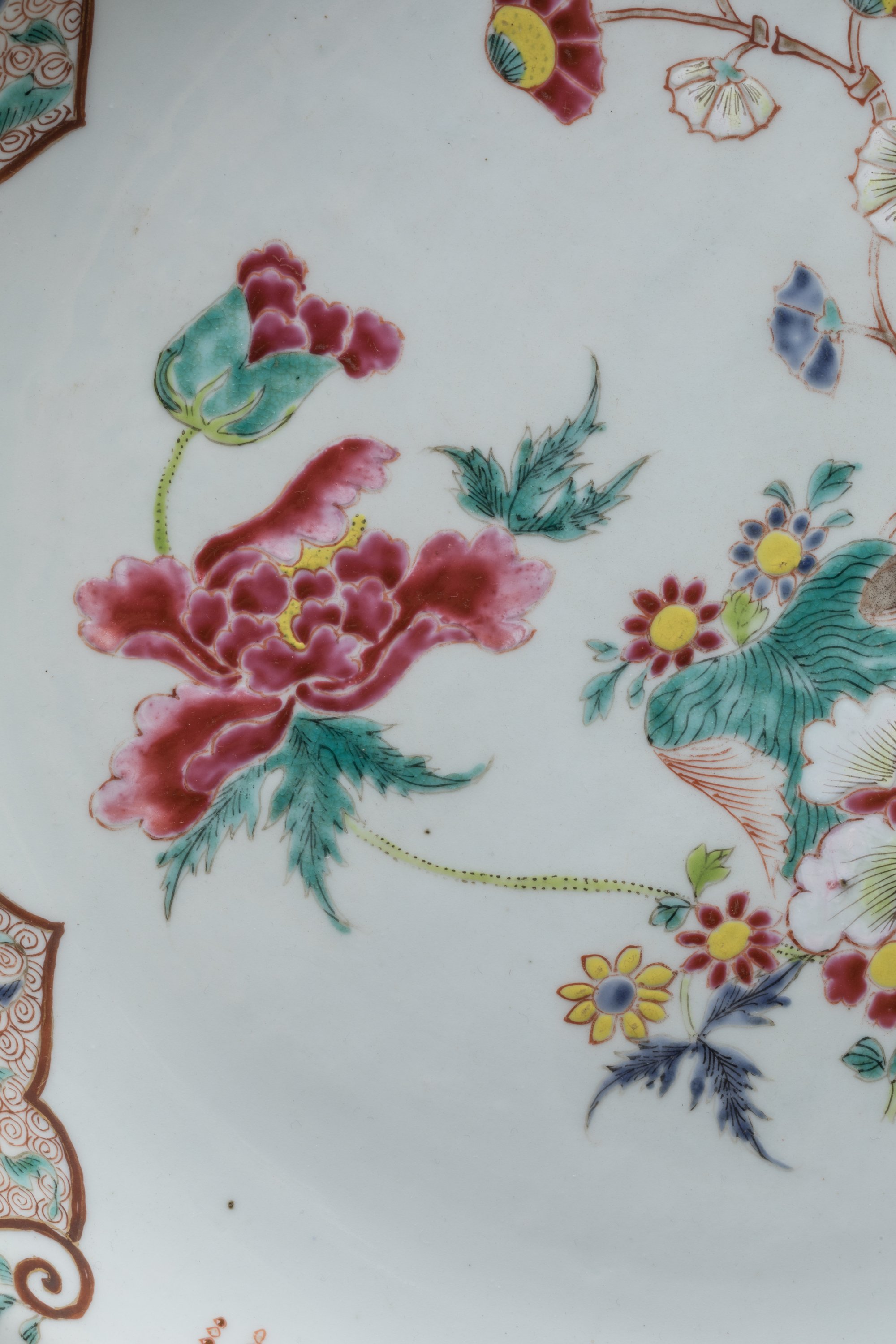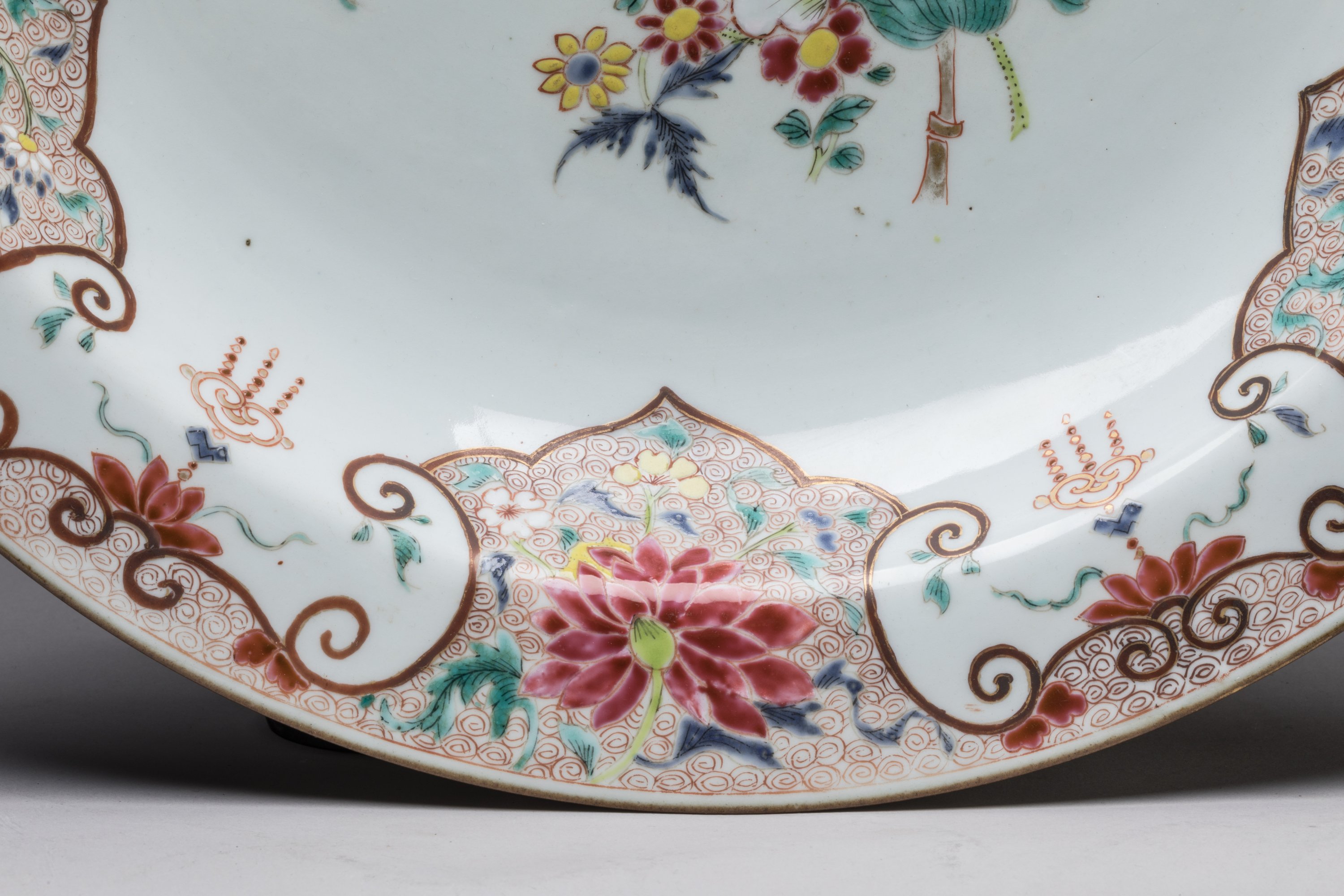 PLAT en porcelaine émaillée polychrome de la famille rose à décor feuille de tabac, le bassin à décor de pivoines.