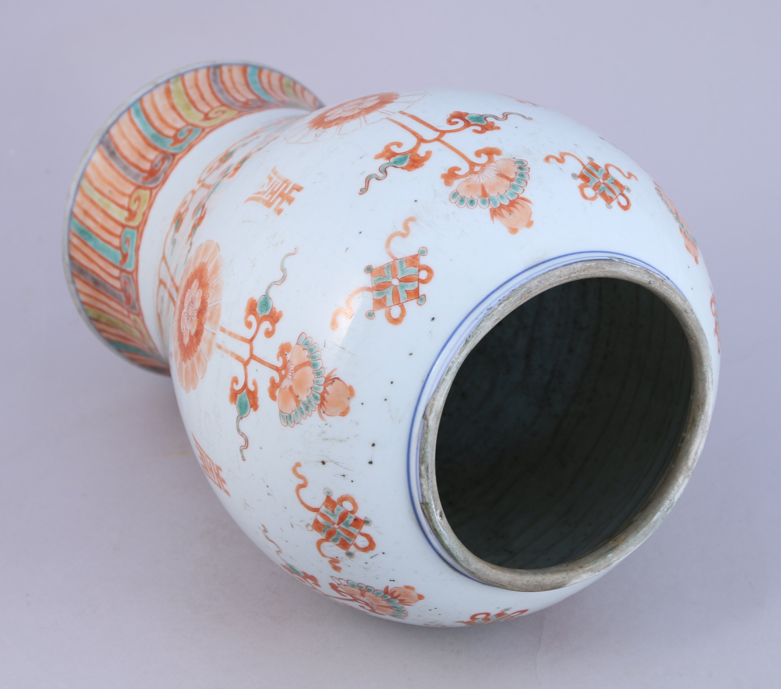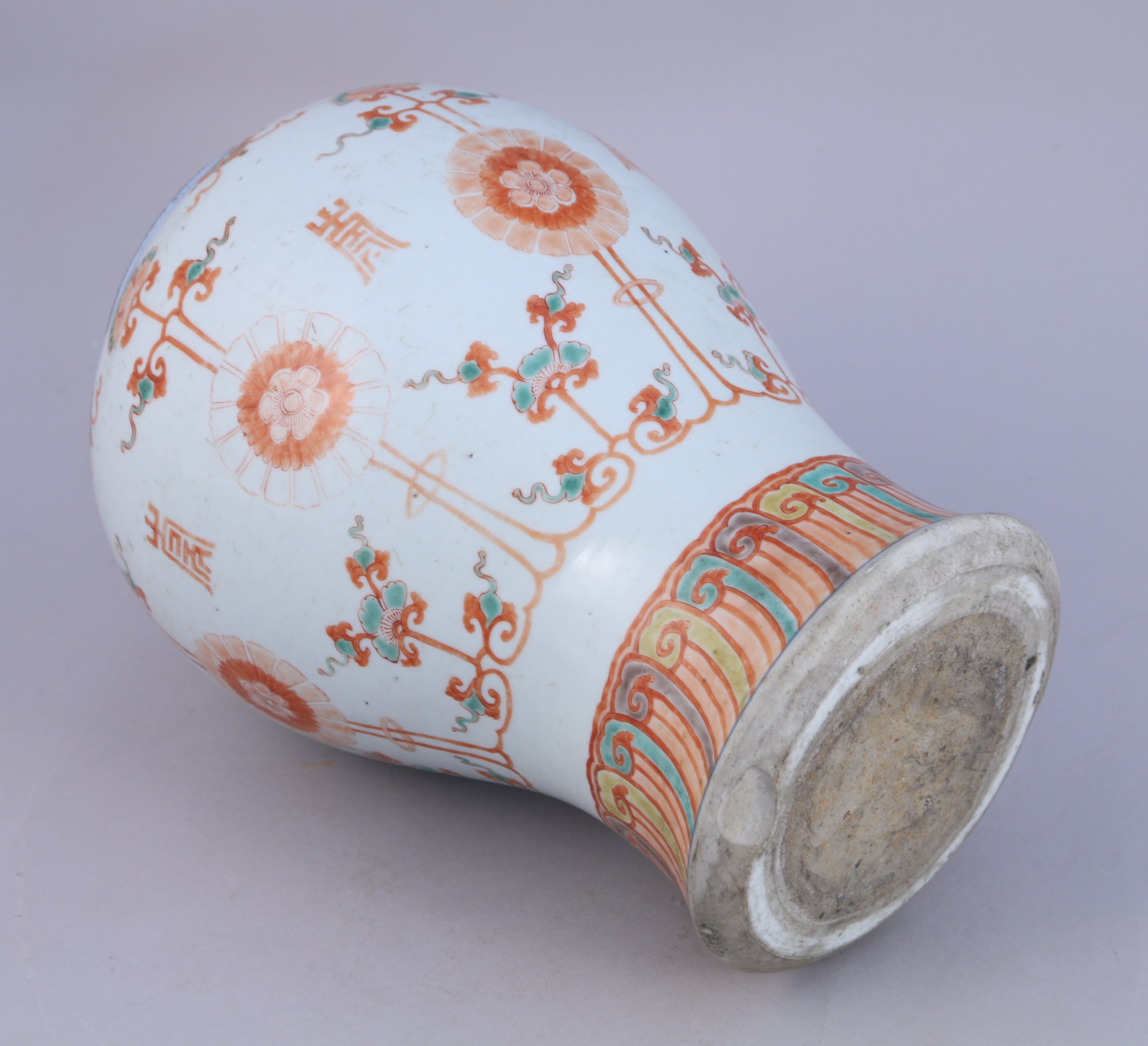 BAS DE VASE cornet coupé, en porcelaine émaillée polychrome à décor de pivoines stylisées et caractères "shou" stylisés.