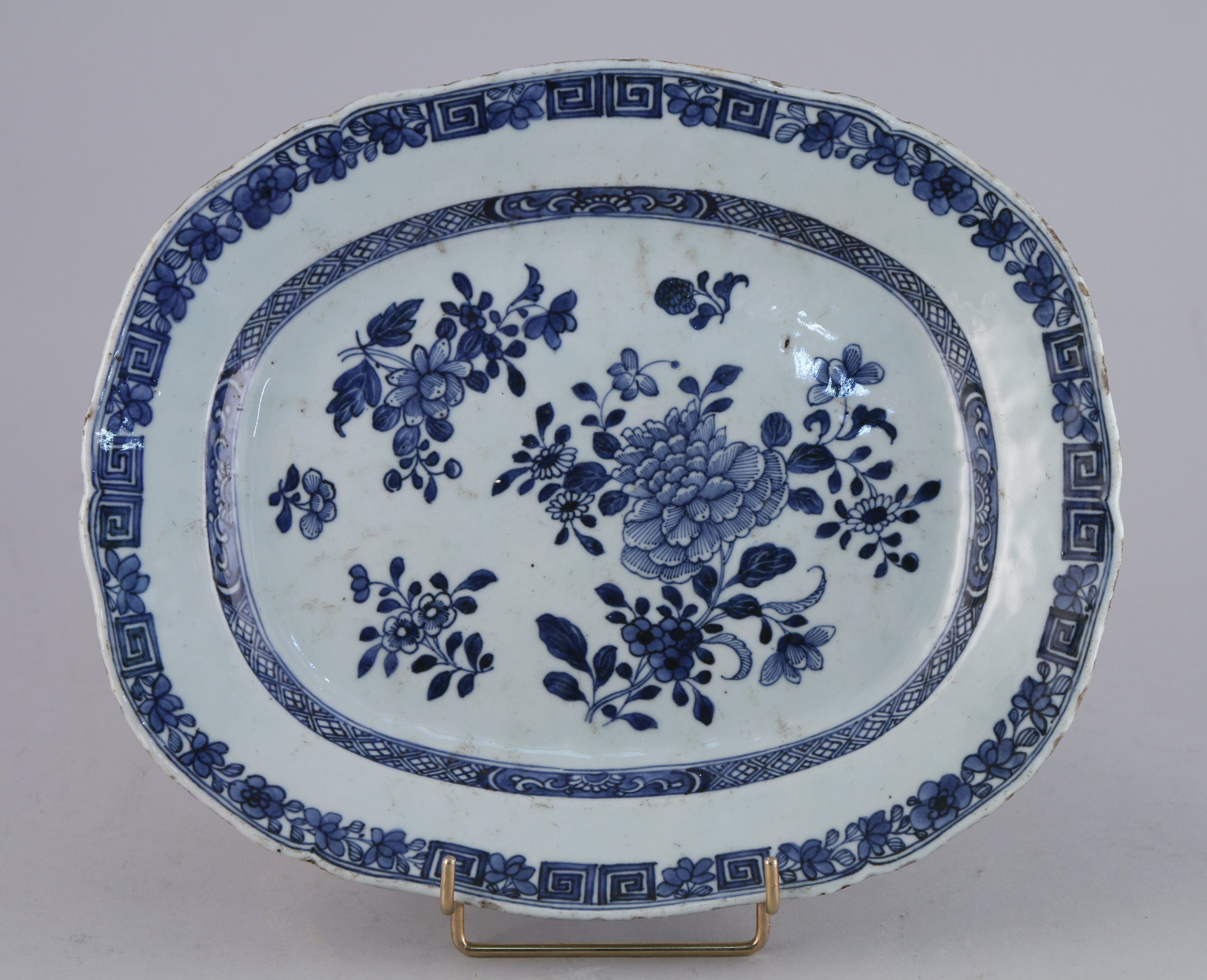 PLAT de forme ovale à bords contournés en porcelaine bleue et blanche. La bordure de l'aile et le marli ornés de frises végétales et géométriques, le bassin décoré de fleurs.