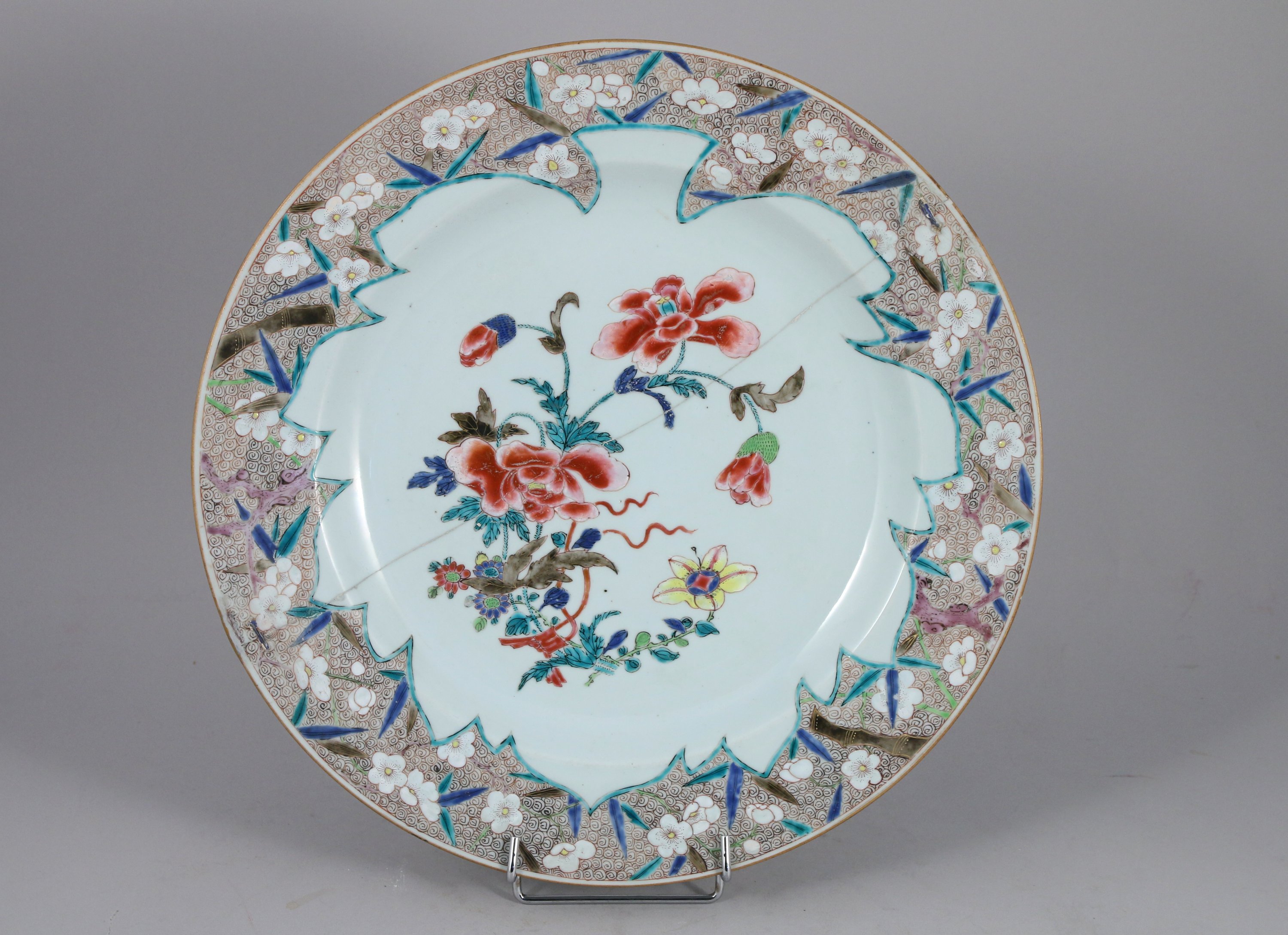 PLAT en porcelaine émaillée polychrome de la famille rose à décor de fleurs dans une réserve en forme de feuille, le bord à décor de bambou et fleurs de prunus.