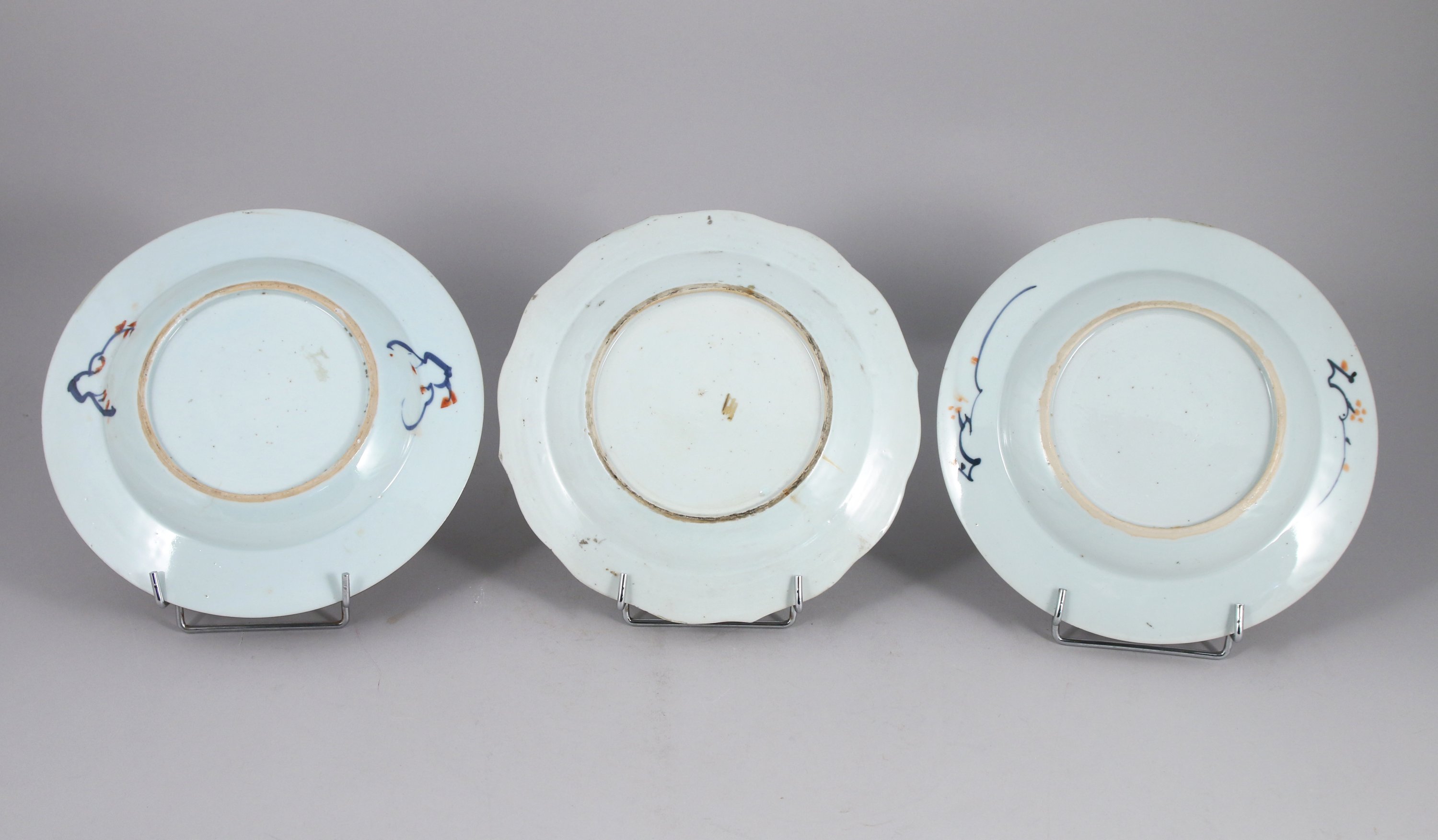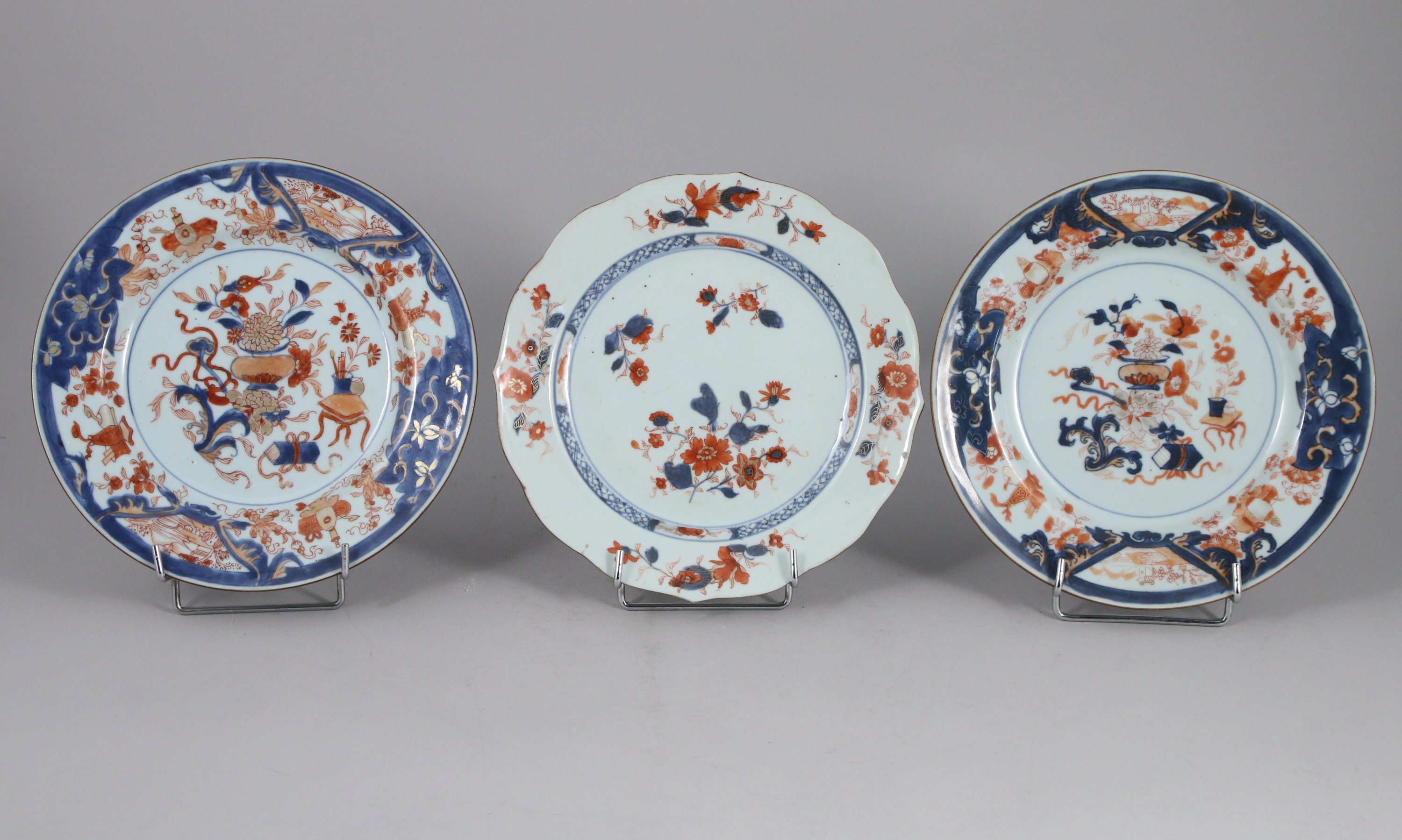 JOINT : trois ASSIETTES, deux rondes et une polylobée, en porcelaine décorée en bleu sous couverte, rouge de fer et émaux polychromes dit "Imari" à décor de fleurs et vases fleuris. Diam. 22,6 cm, 22,9 cm et 22,5 cm. (Défauts de cuisson, éclats, rayures, usure de l'émail)