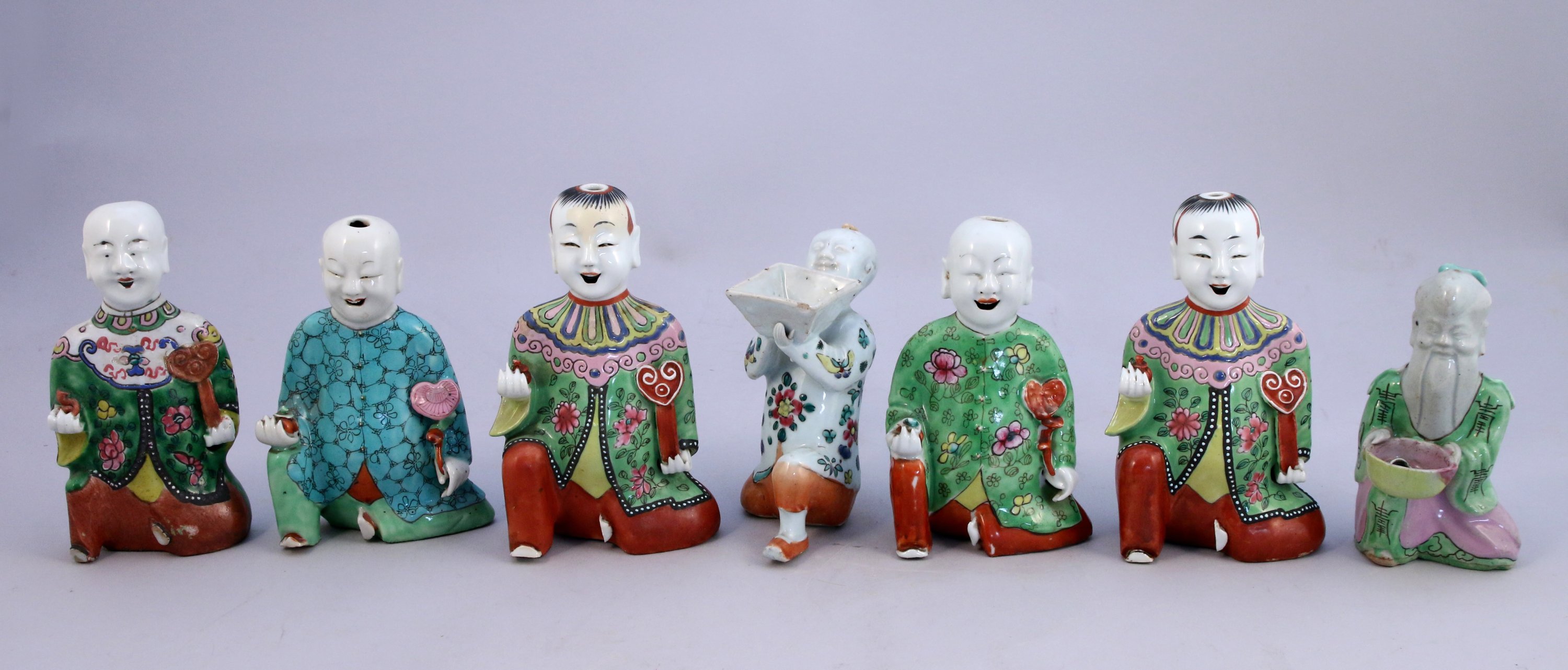SEPT PERSONNAGES en porcelaine émaillée polychrome, agenouillés, tenant des ruyi, des petits vases ou des récipients, leurs habits ornés de fleurs.