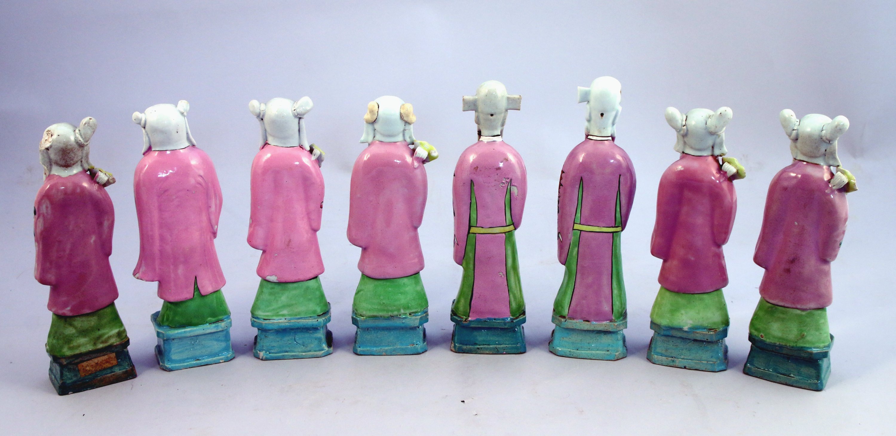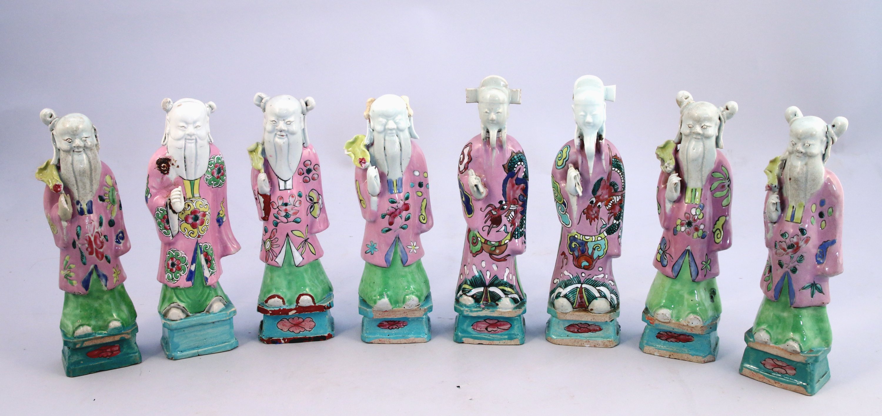 HUIT STATUETTES en porcelaine émaillée polychrome, immortels debout tenant des feuilles de lotus, leurs habits à motifs de fleurs et dragons.