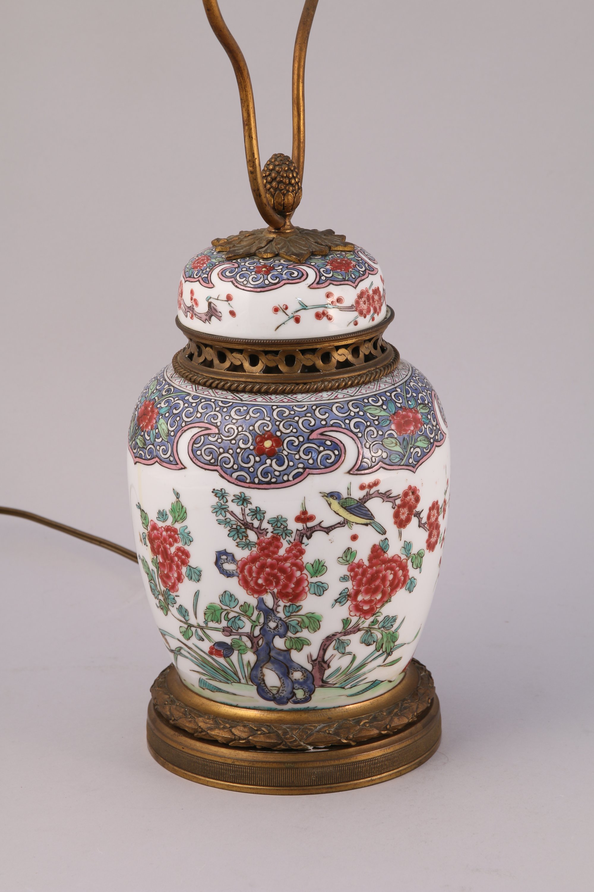 POT COUVERT en porcelaine à décor en émaux polychromes de rochers, pivoines, oiseaux et papillons, l'épaule et le couvercle ornés d'une frise de rinceaux stylisés sur fond bleu et fleurs. Monté en lampe.