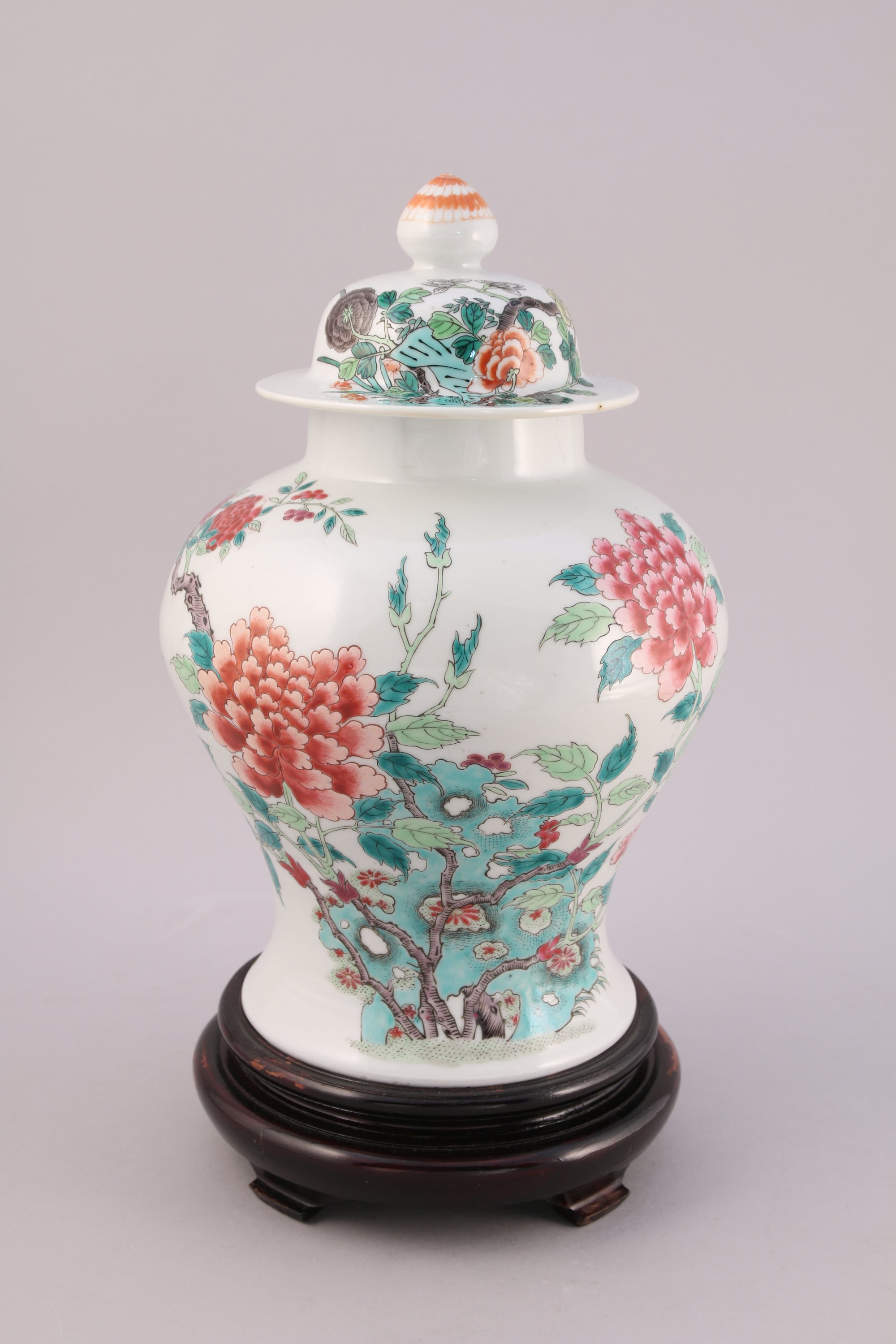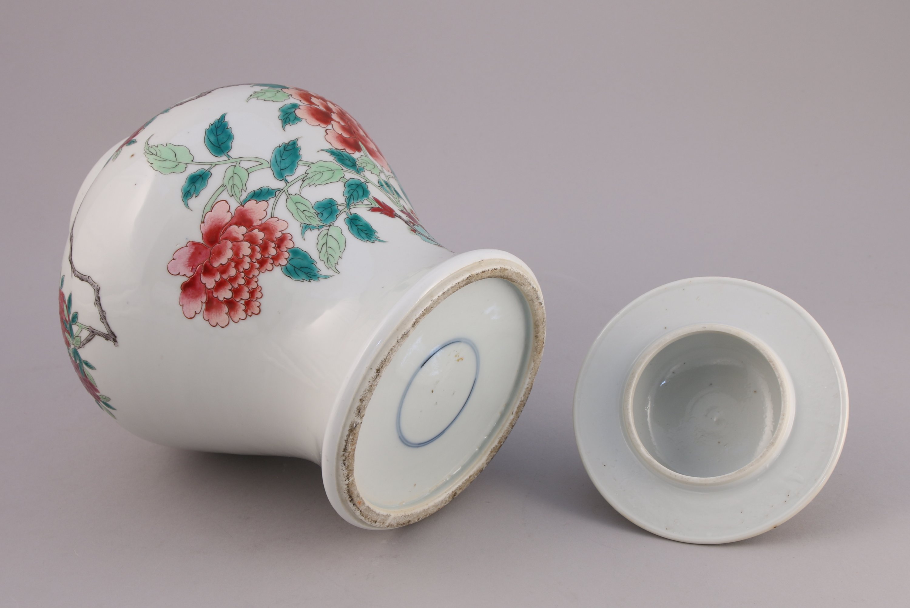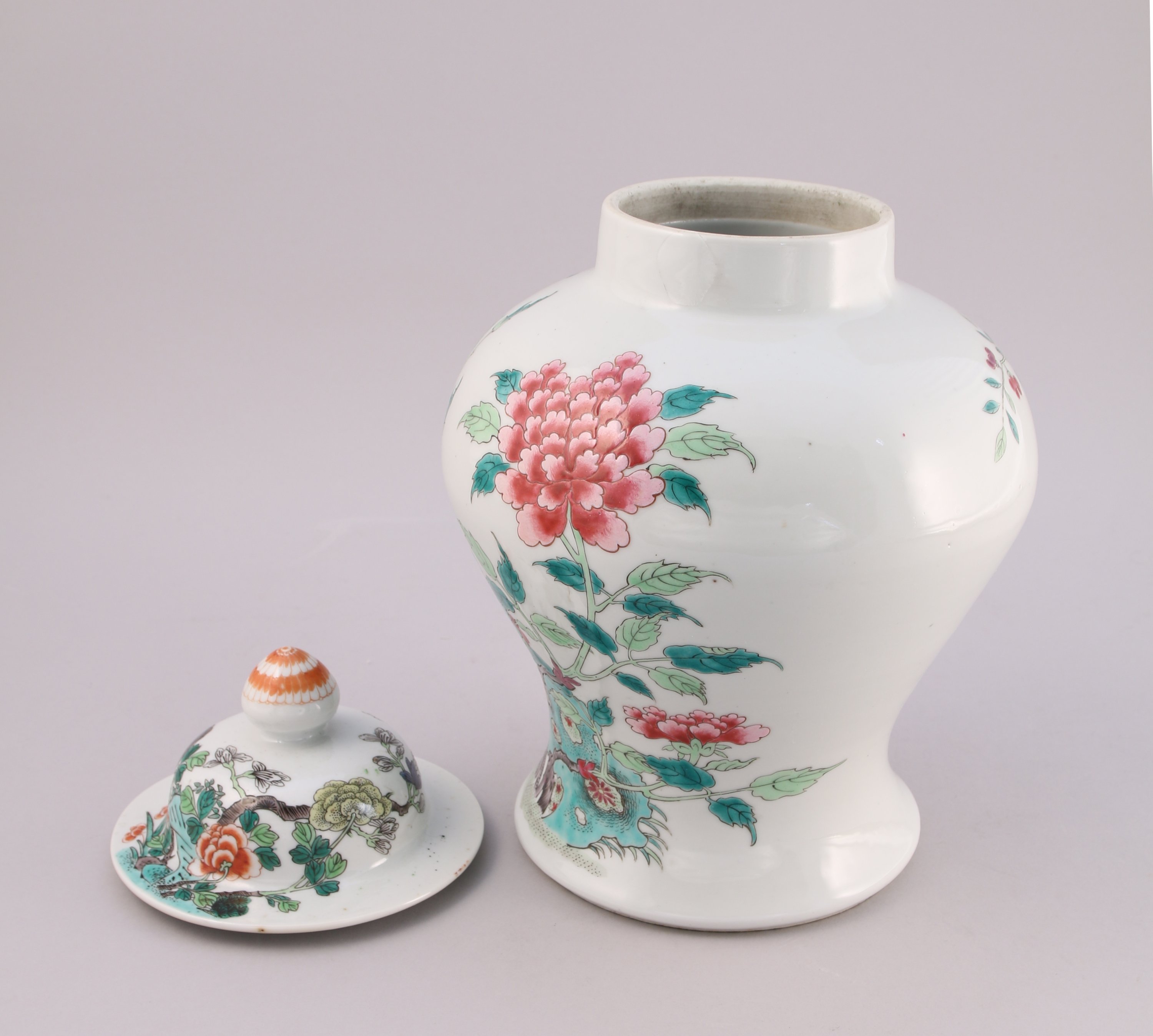 POTICHE en porcelaine à décor en émaux polychromes dans le style de la famille rose de pivoines dans leur feuillage et de rochers percés.