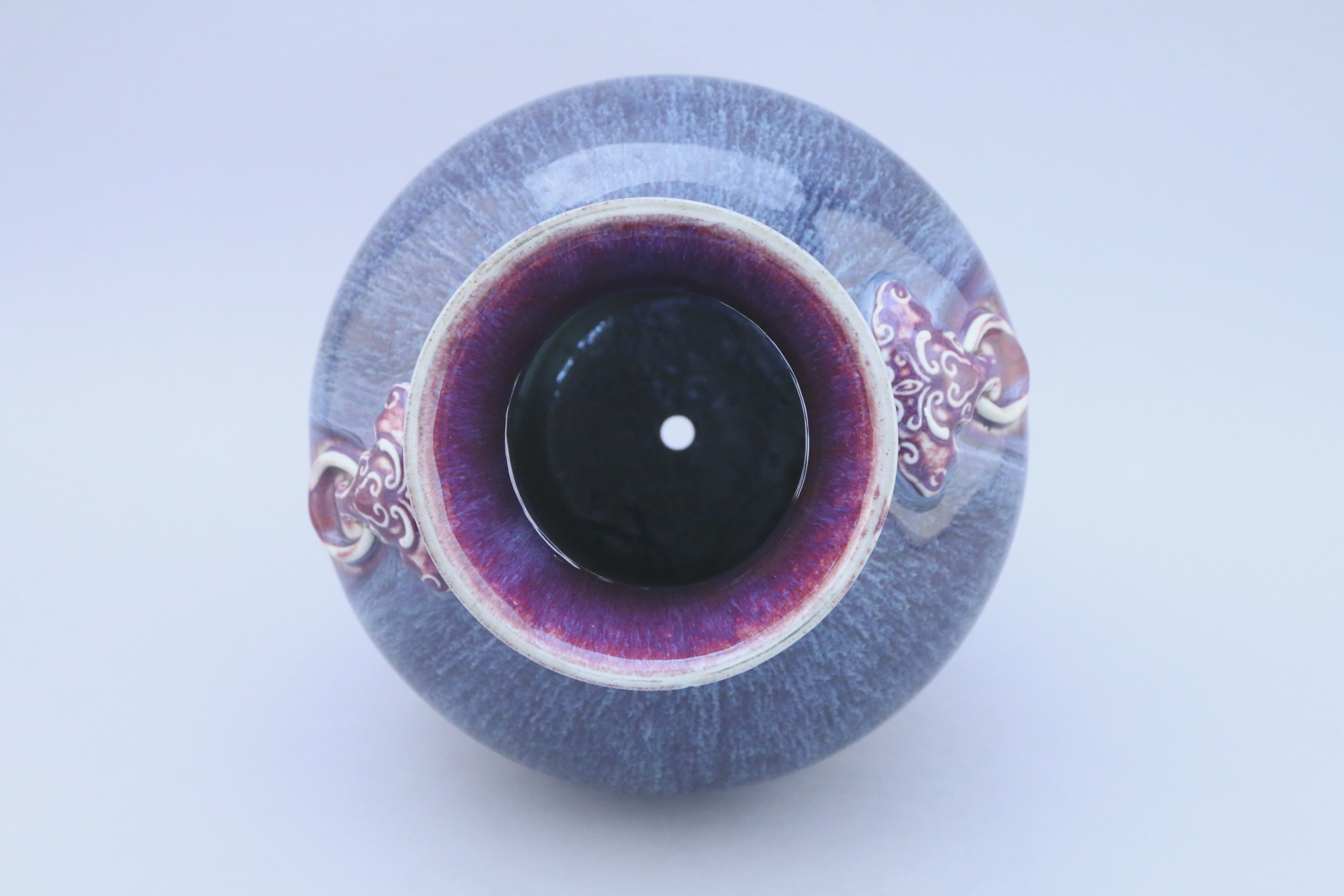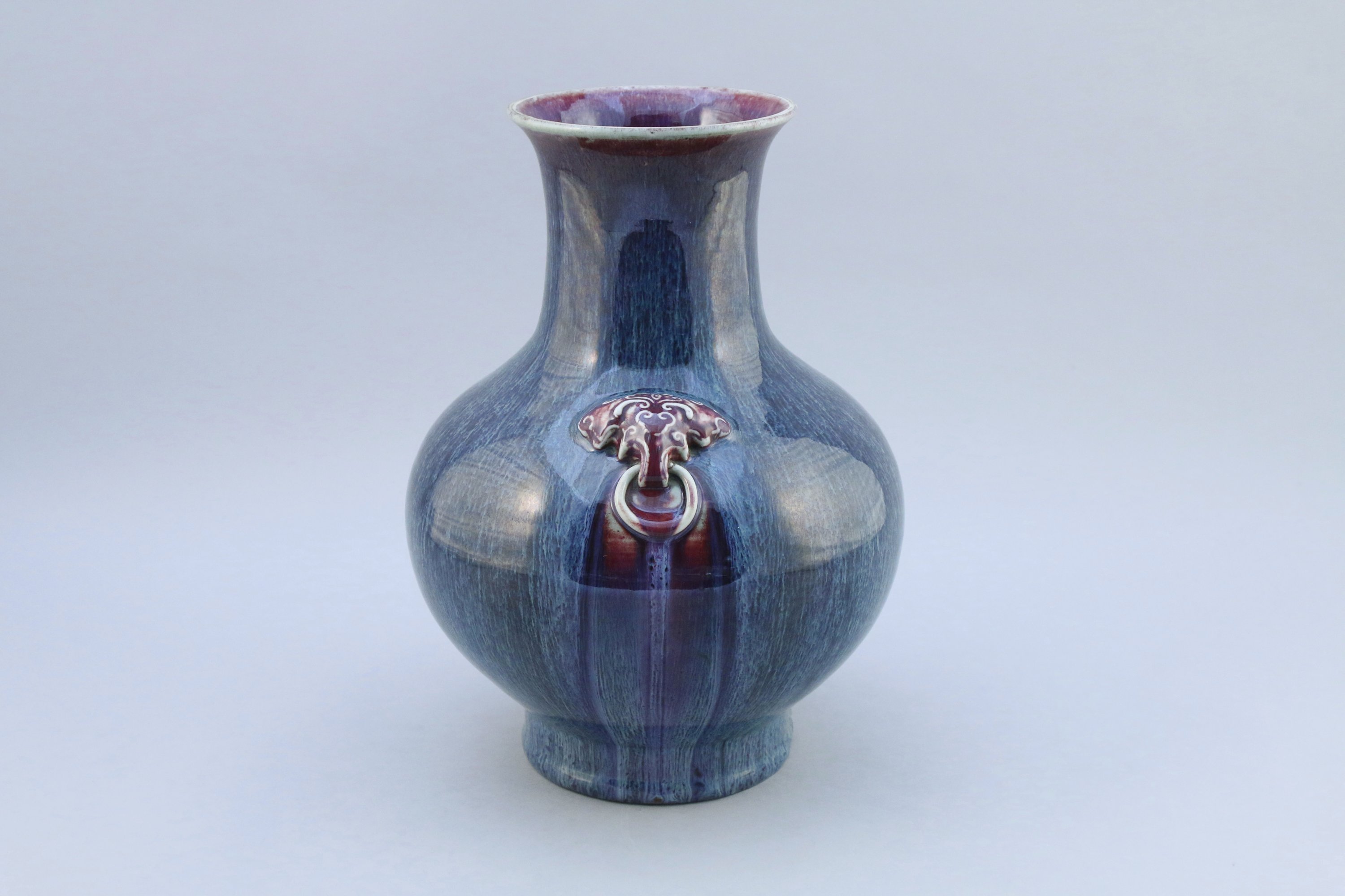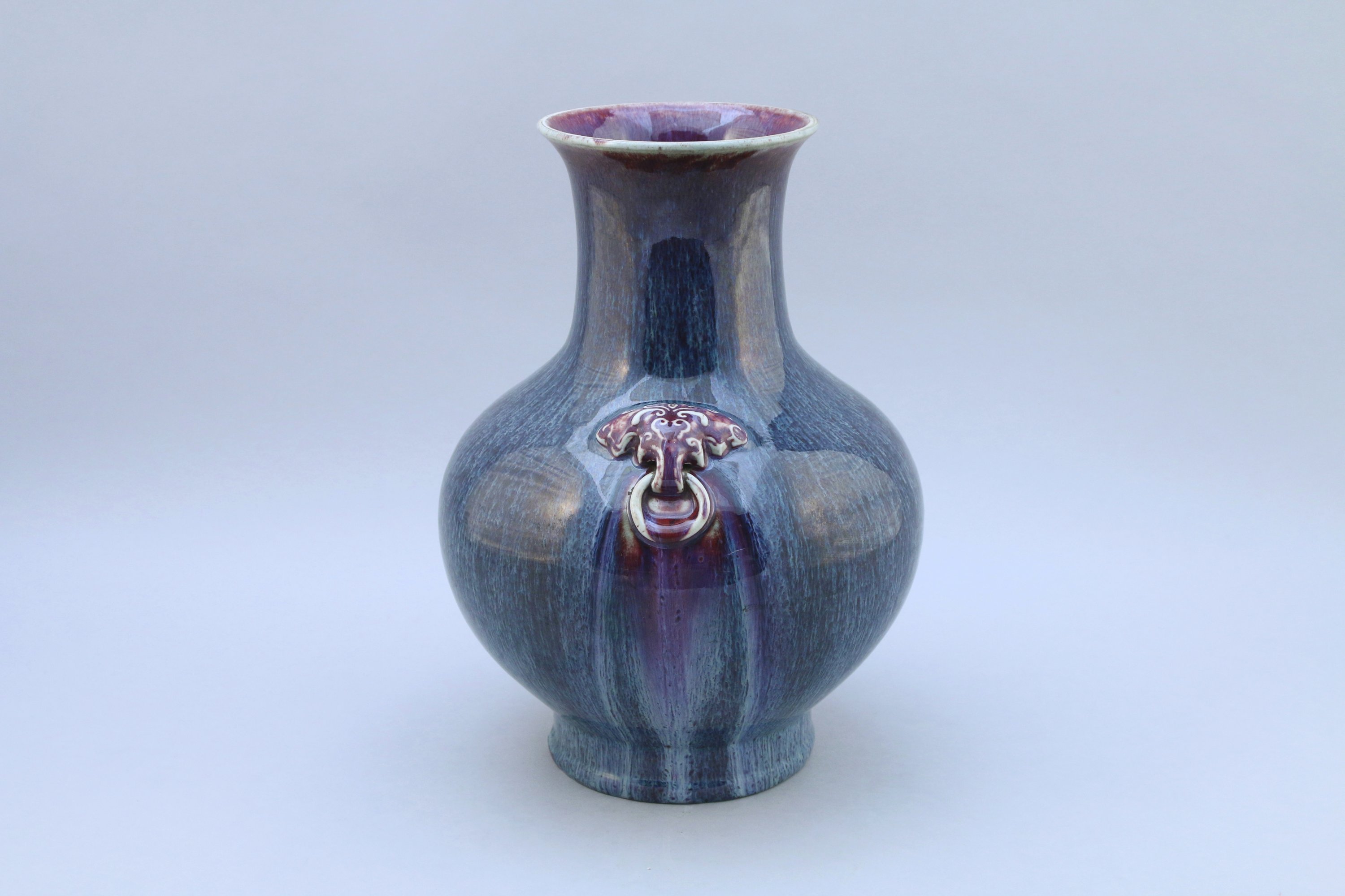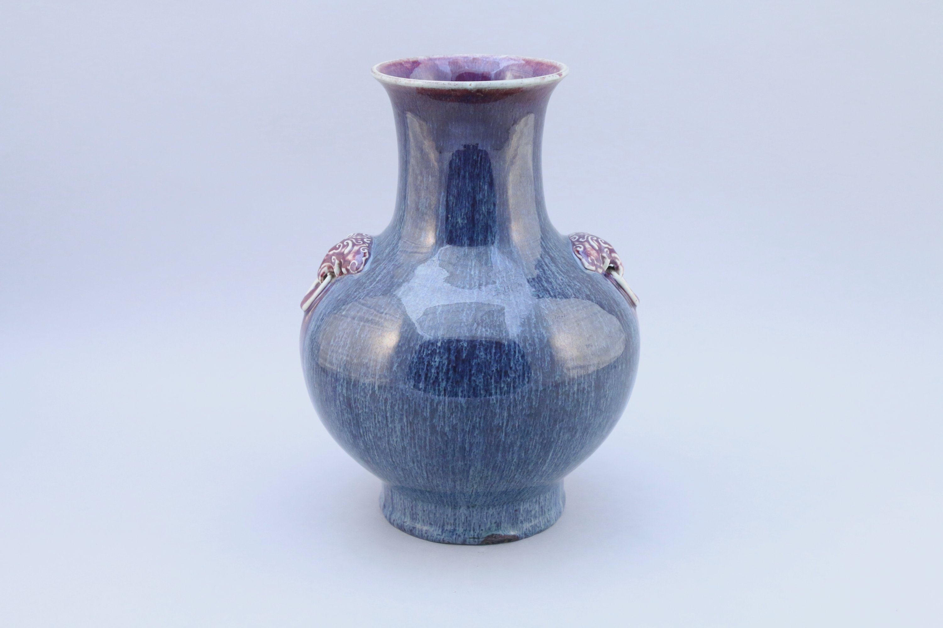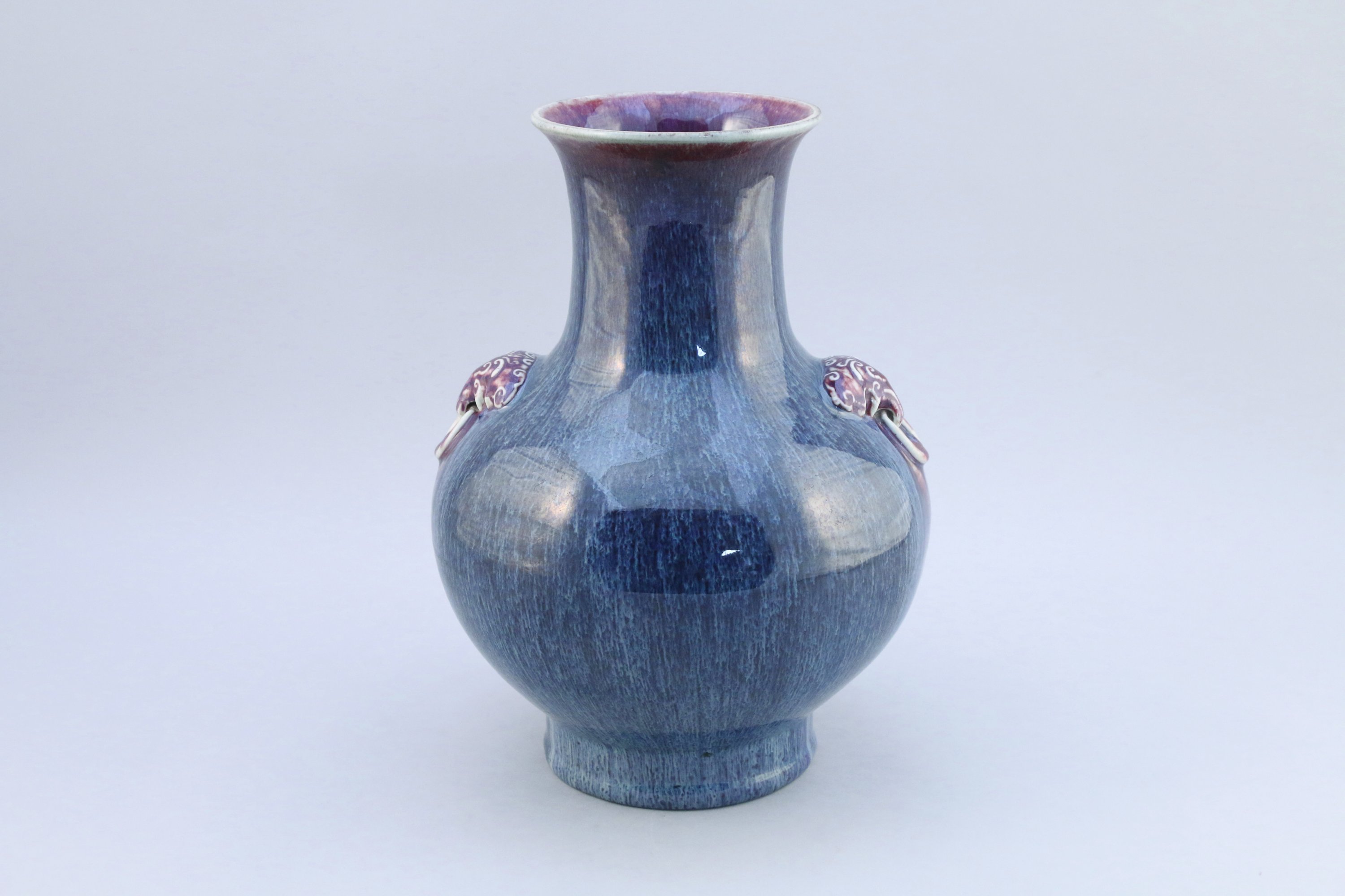 VASE BALUSTRE en grès flammé aubergine, la panse ornée de deux anses figurant des têtes de taotie supportant des anneaux.