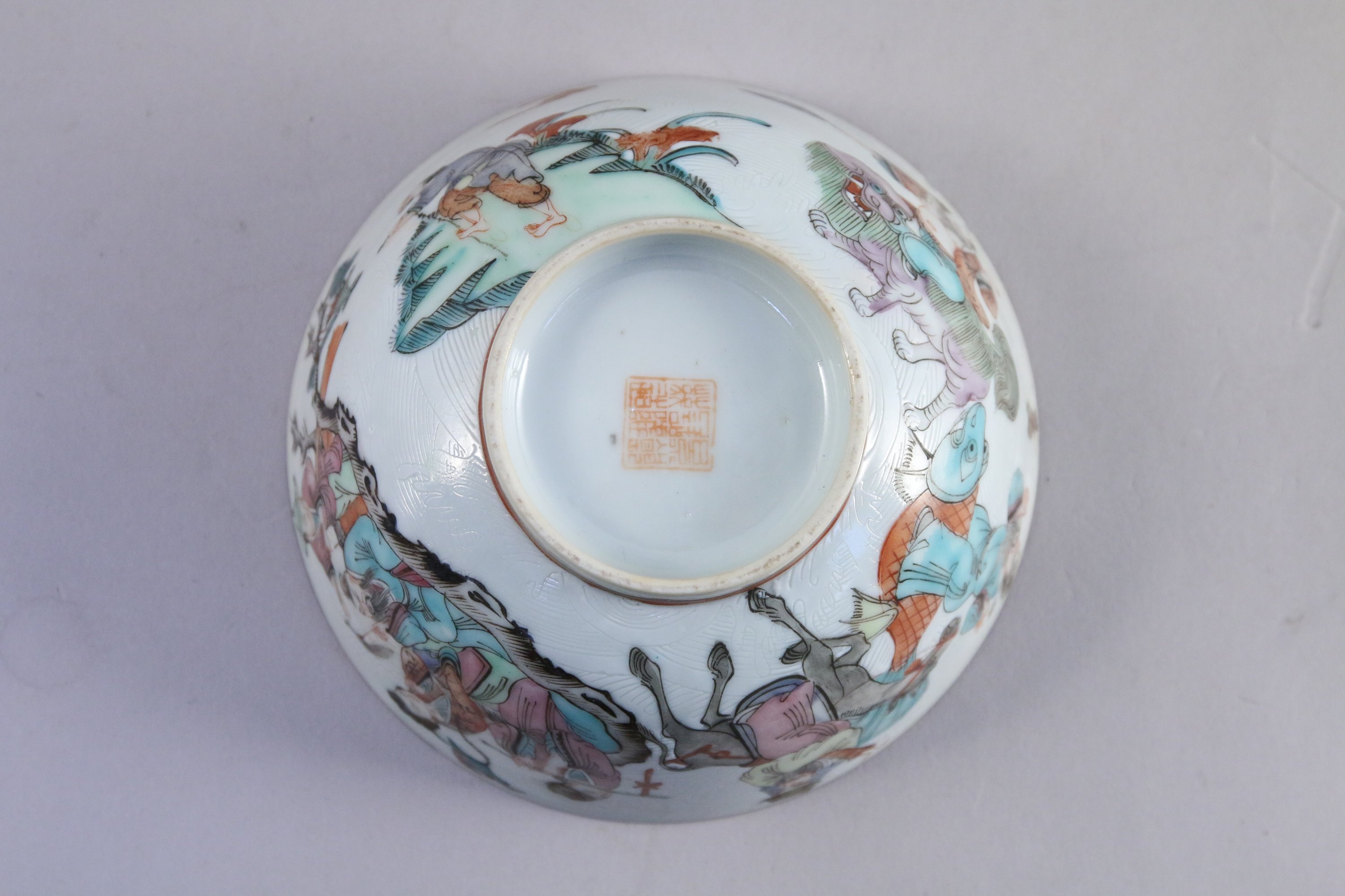 BOL en porcelaine à décor émaillé de musiciens, le fond incisé en sgraffiato. Marque rouge à six caractères.