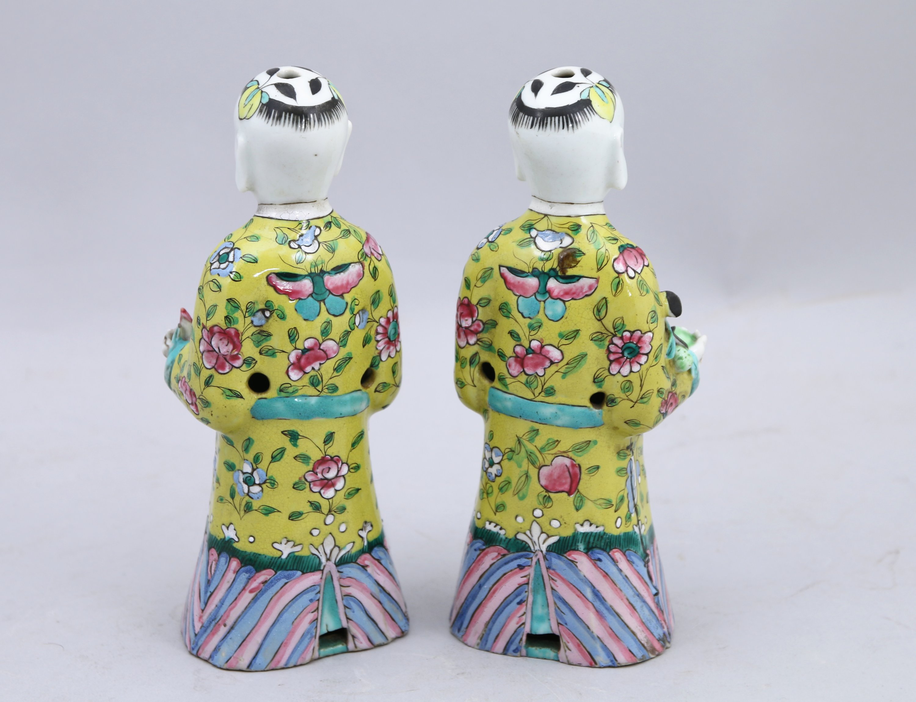 Deux STATUETTES de Hoho en porcelaine émaillée polychrome, debout tenant une branche de kaki dans la main droite et une pêche dans la main gauche.