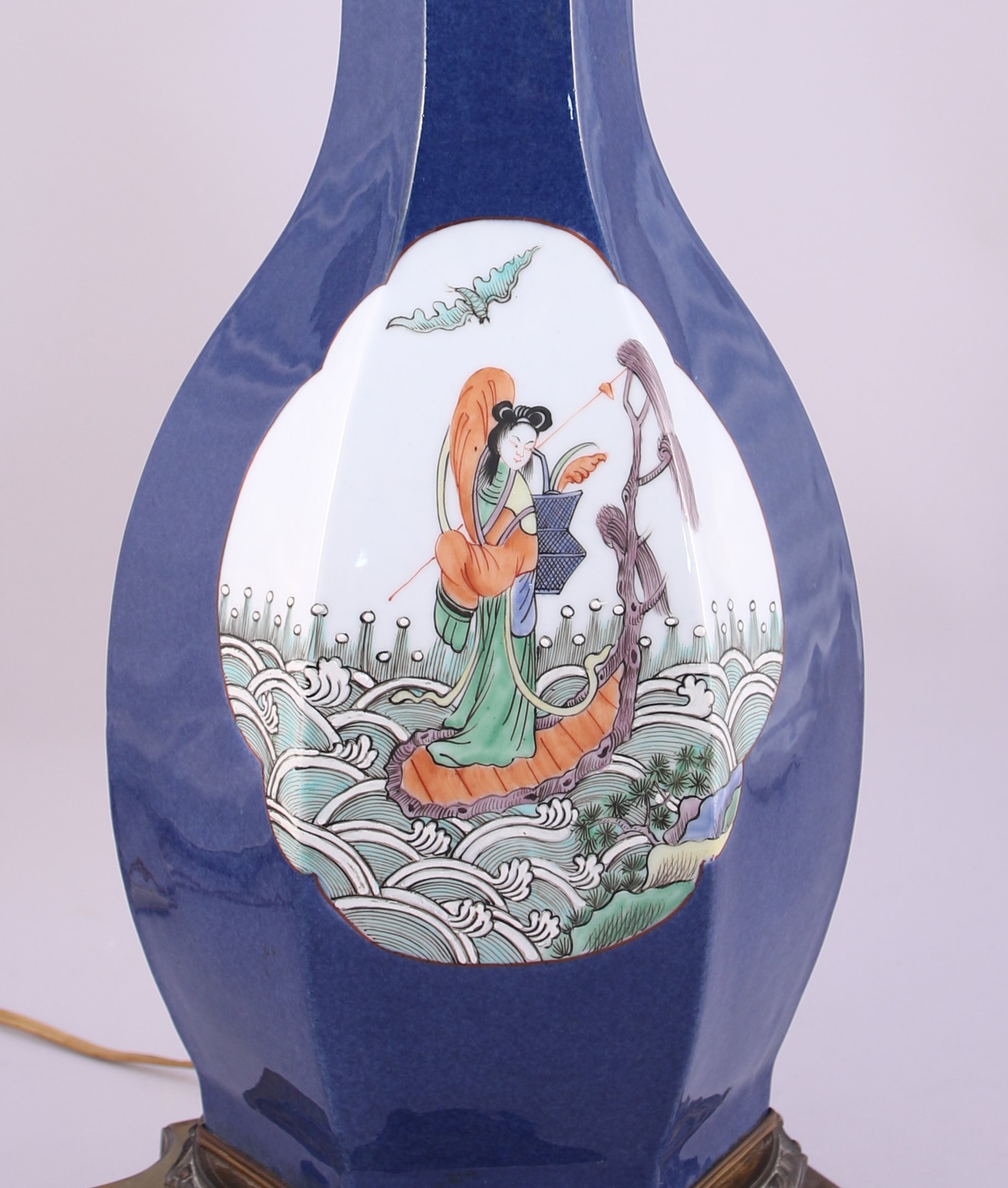 VASE de forme hexagonale en porcelaine émaillée polychrome dans des réserves de paysages et immortelle sur un radeau sur fond bleu poudré. Monture en bronze doré.