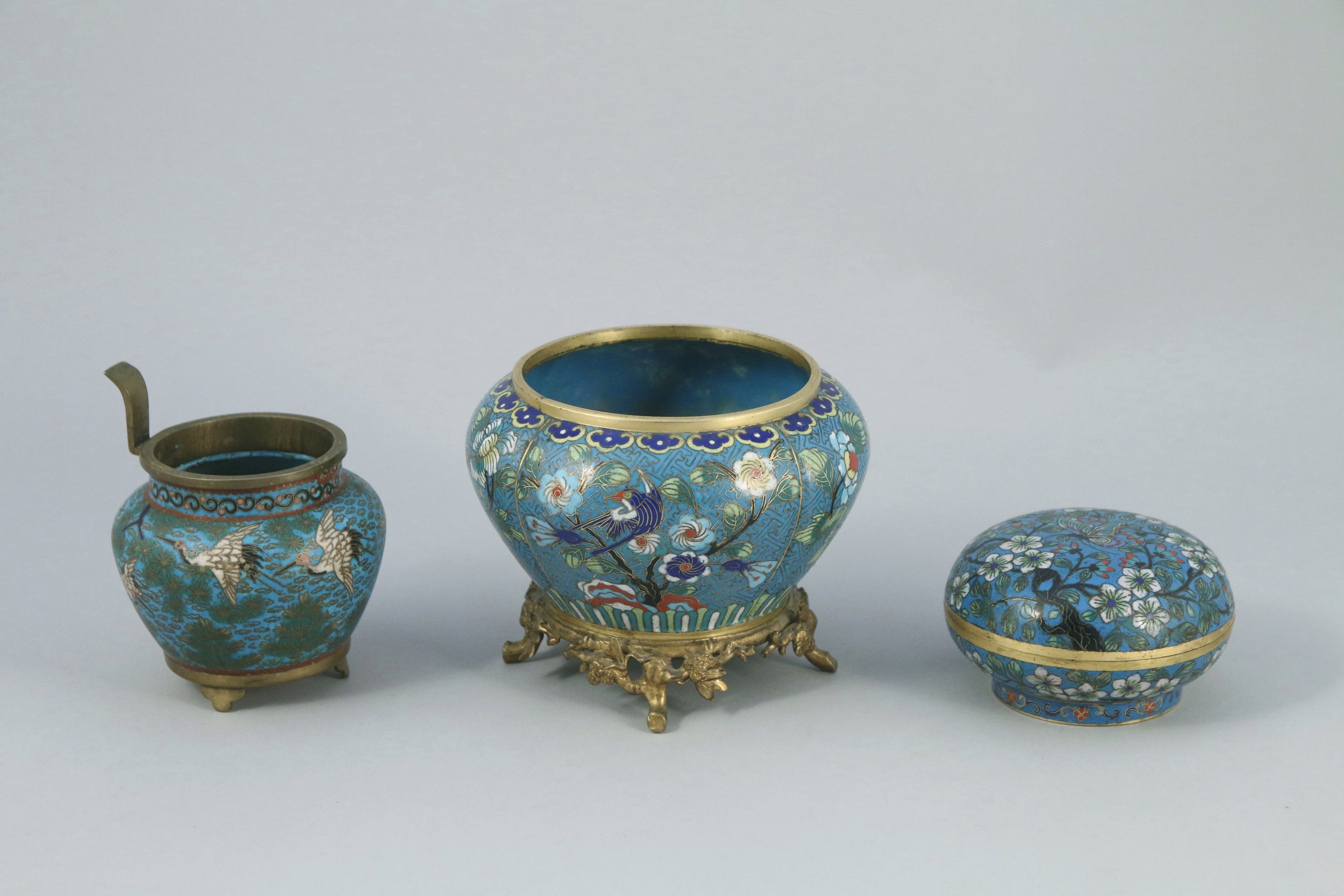 - BRÛLE-PARFUM tripode en émaux à décor de grues et feuillages.