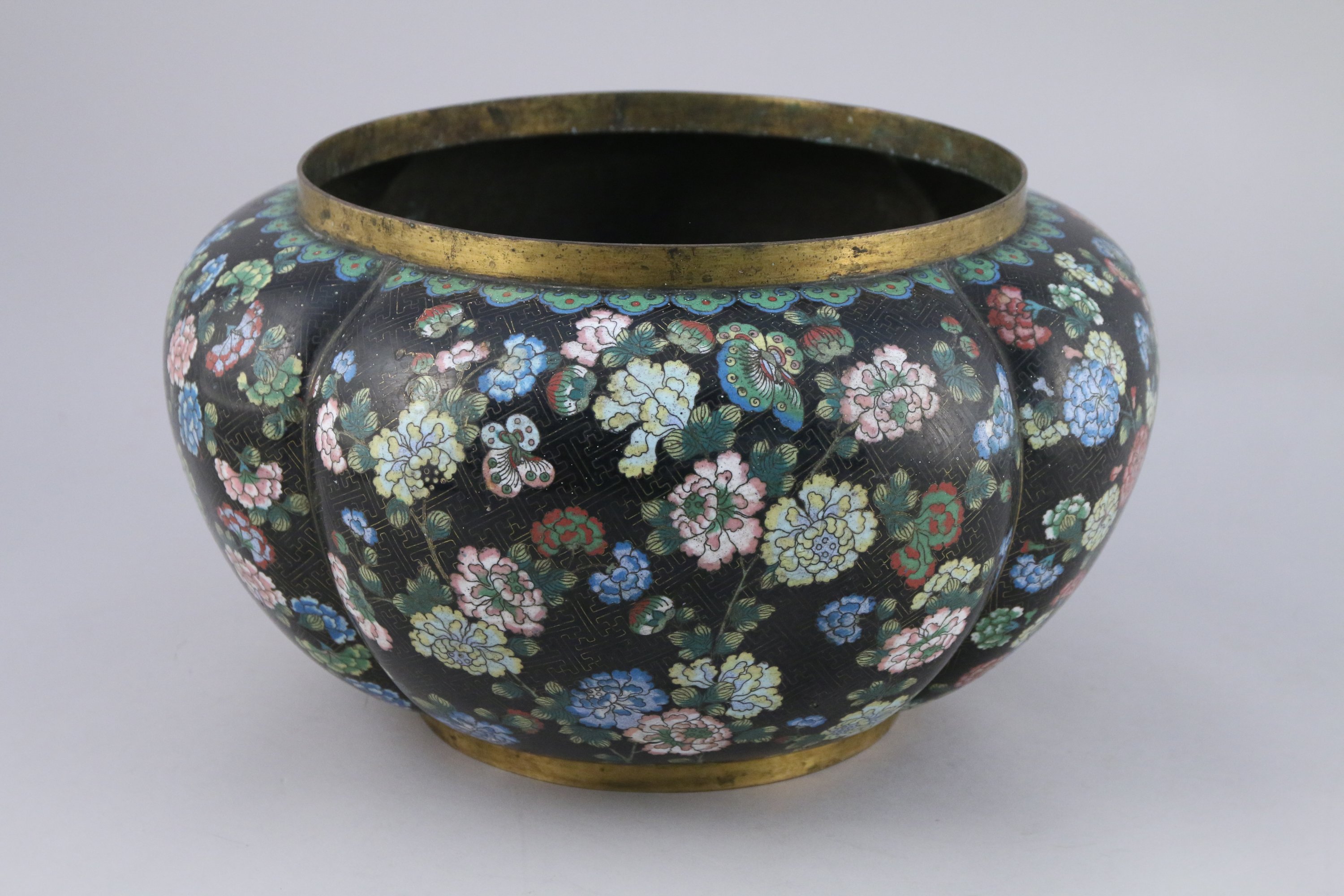 VASQUE polylobée en bronze et émaux cloisonnés à décor de pivoines et papillons sur fond noir de motif de svastika, l'épaule ornée de motifs de ruyi.
