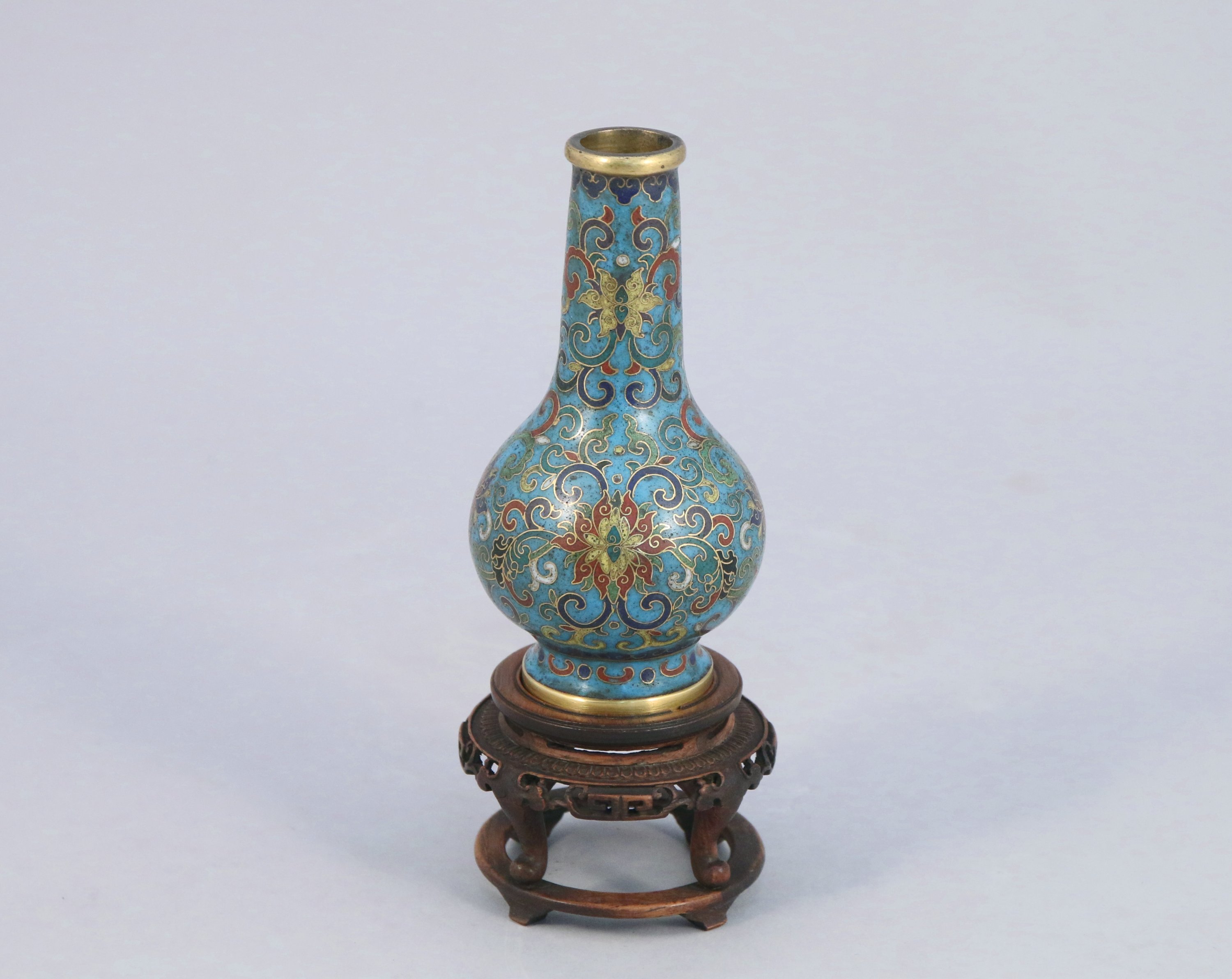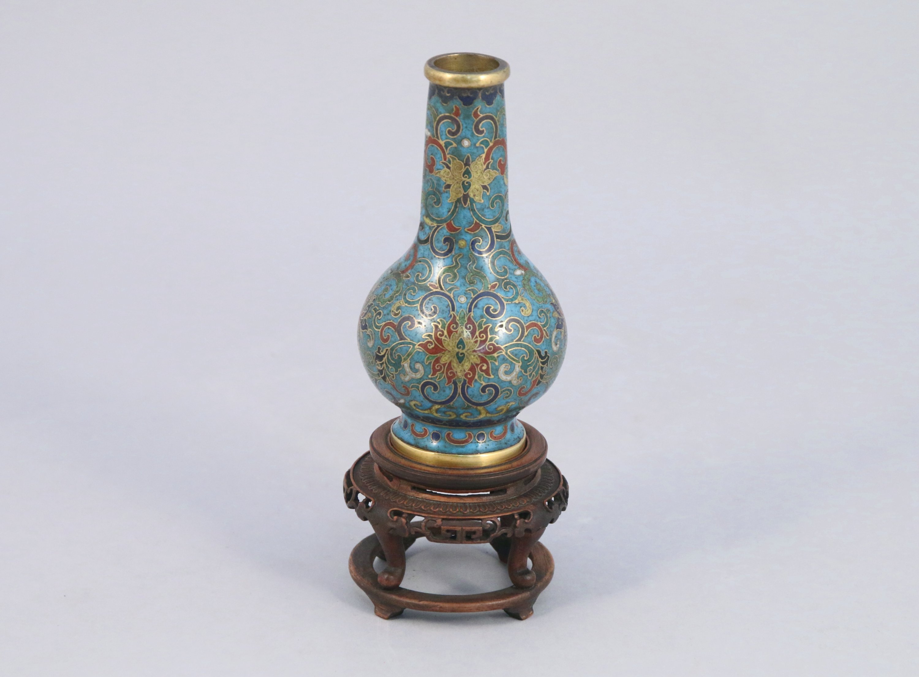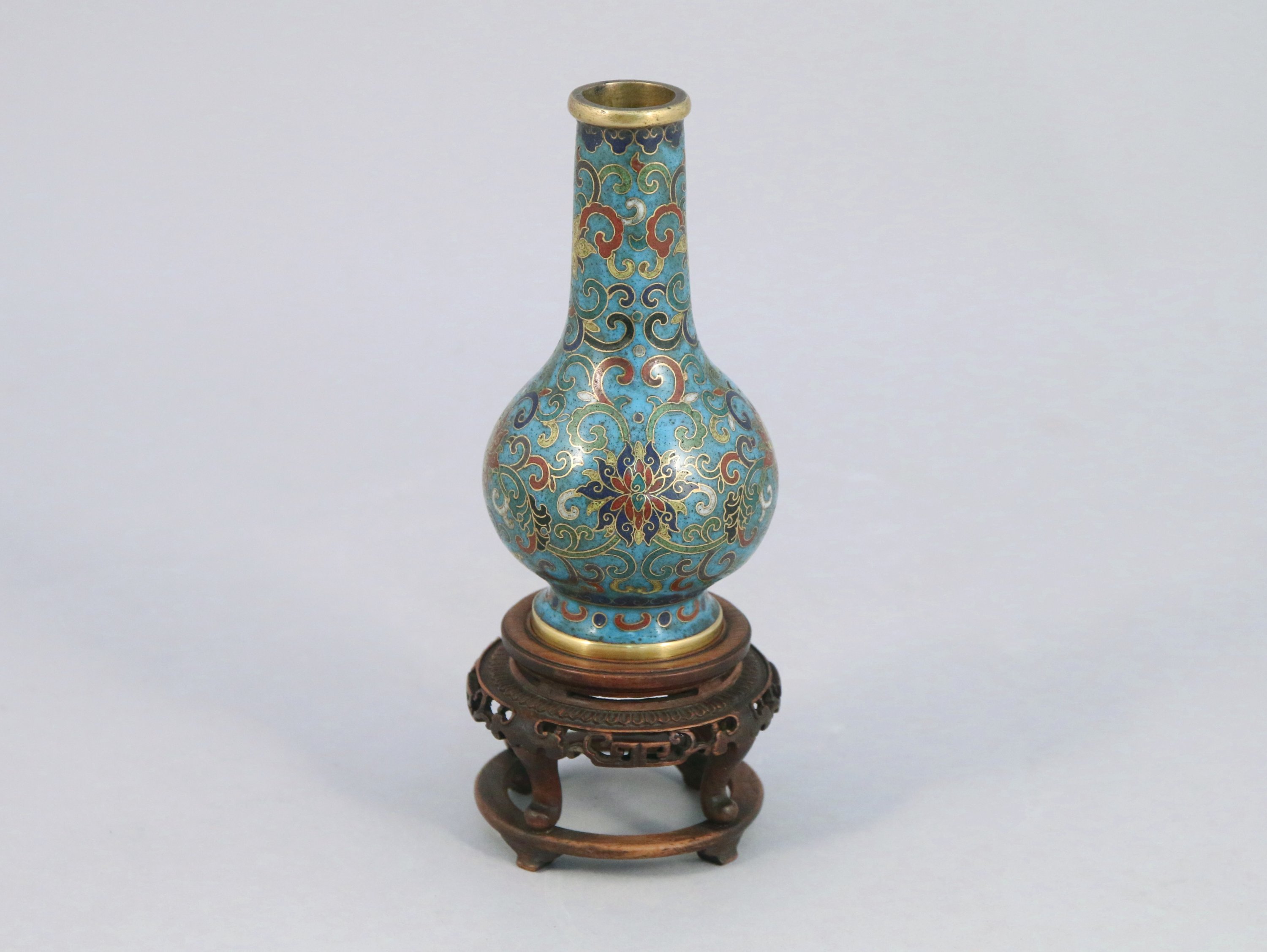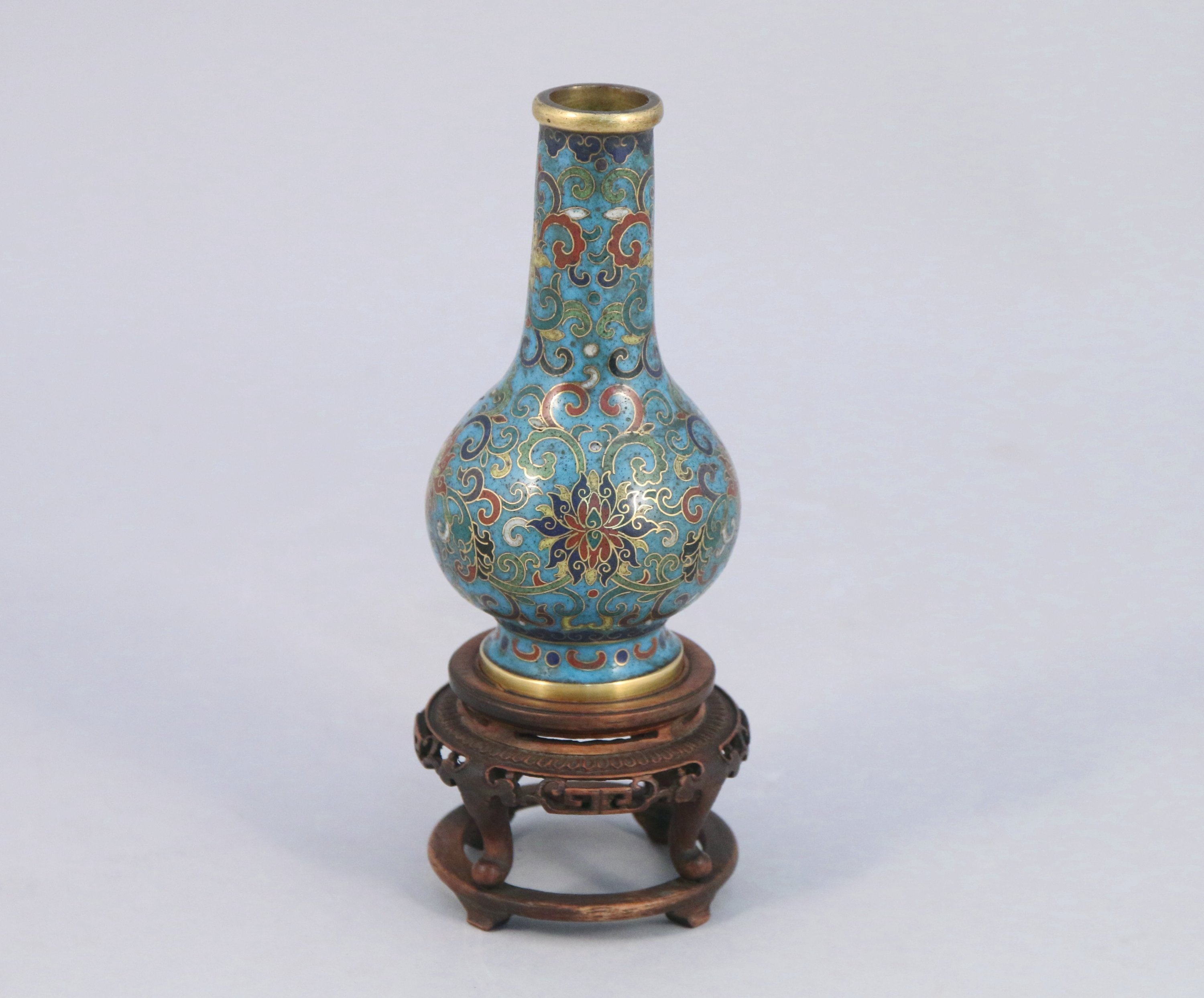 Petit VASE en bronze cloisonné. Marque apocryphe Qianlong. Socle en bois.