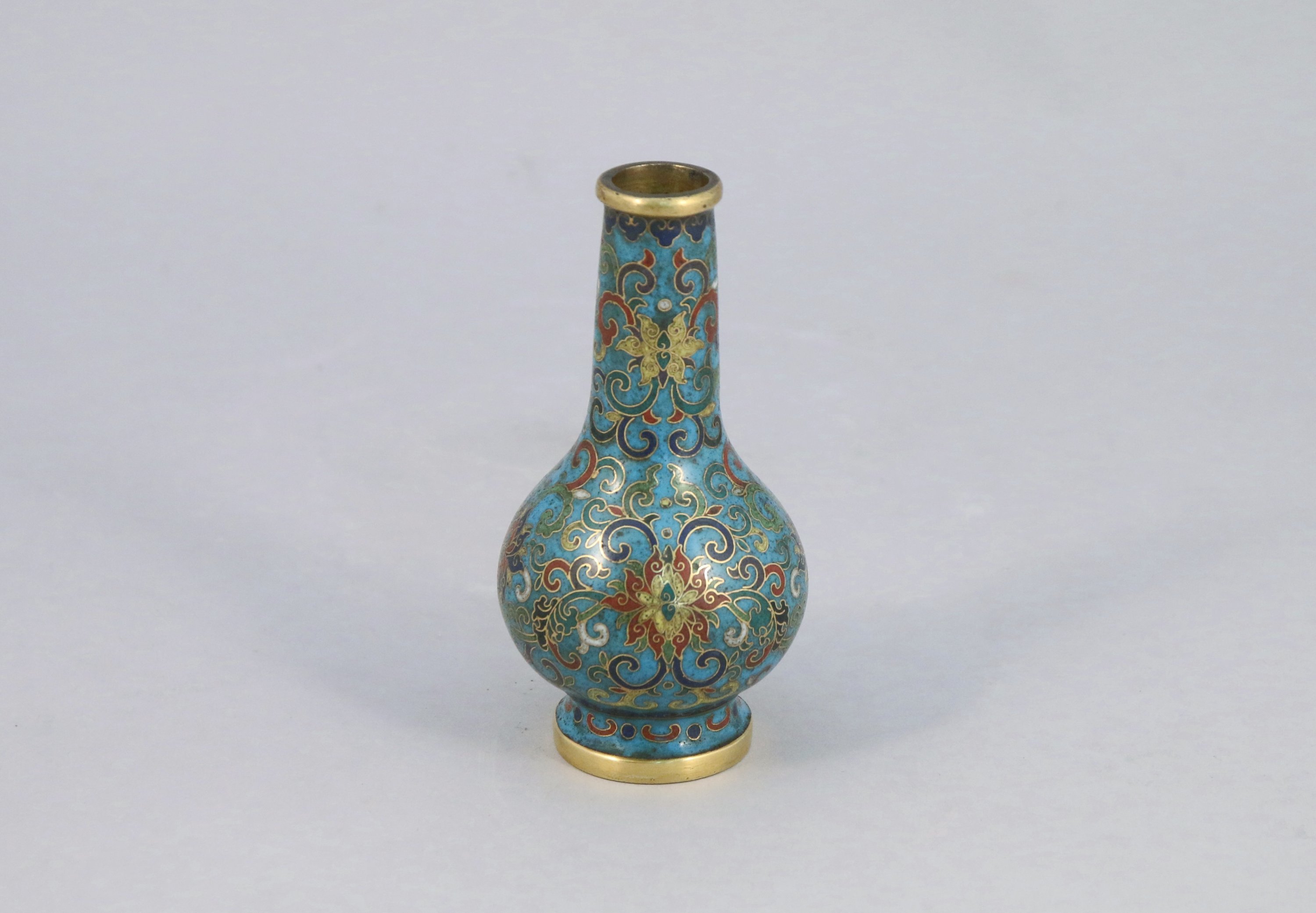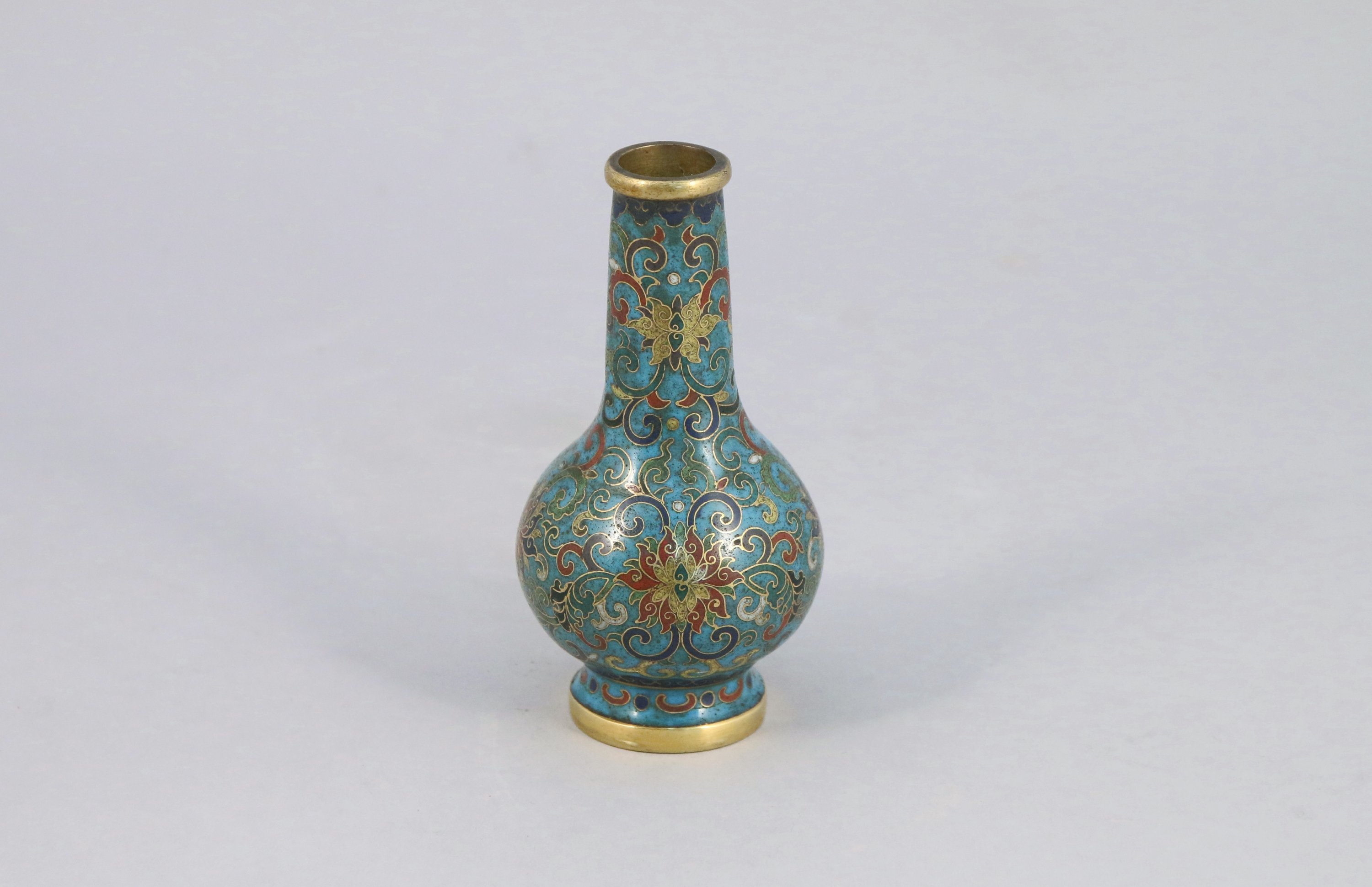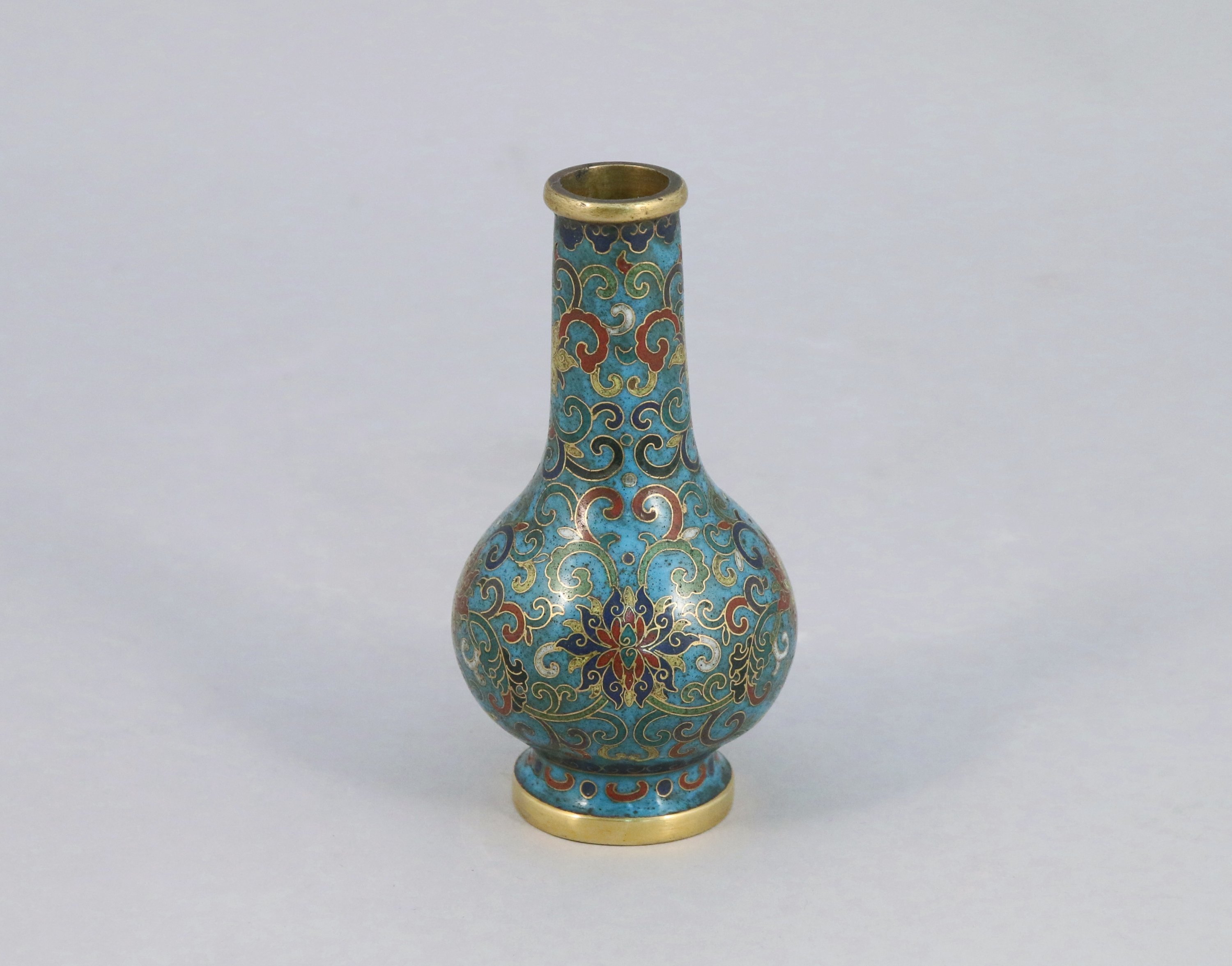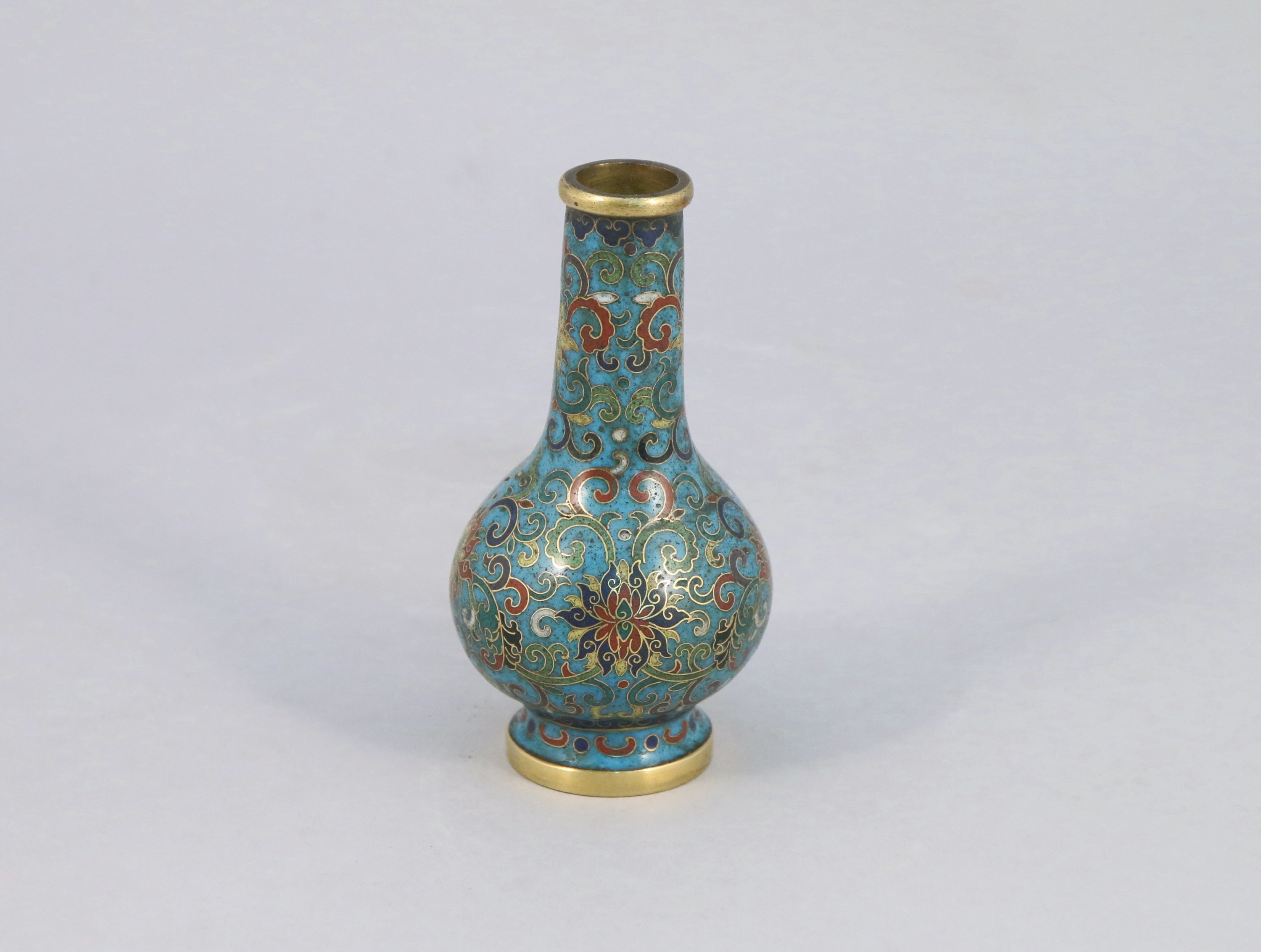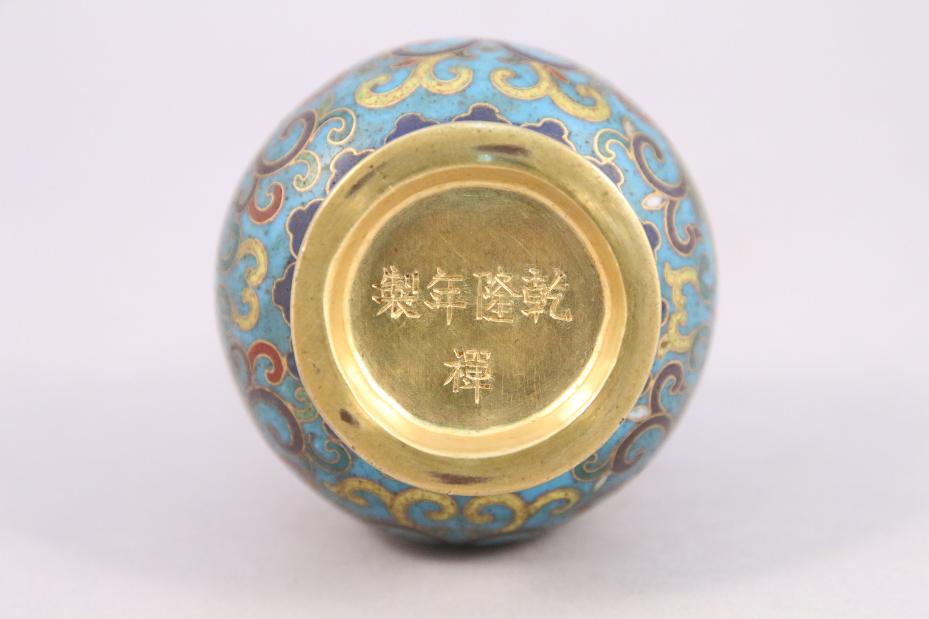Petit VASE en bronze cloisonné. Marque apocryphe Qianlong. Socle en bois.