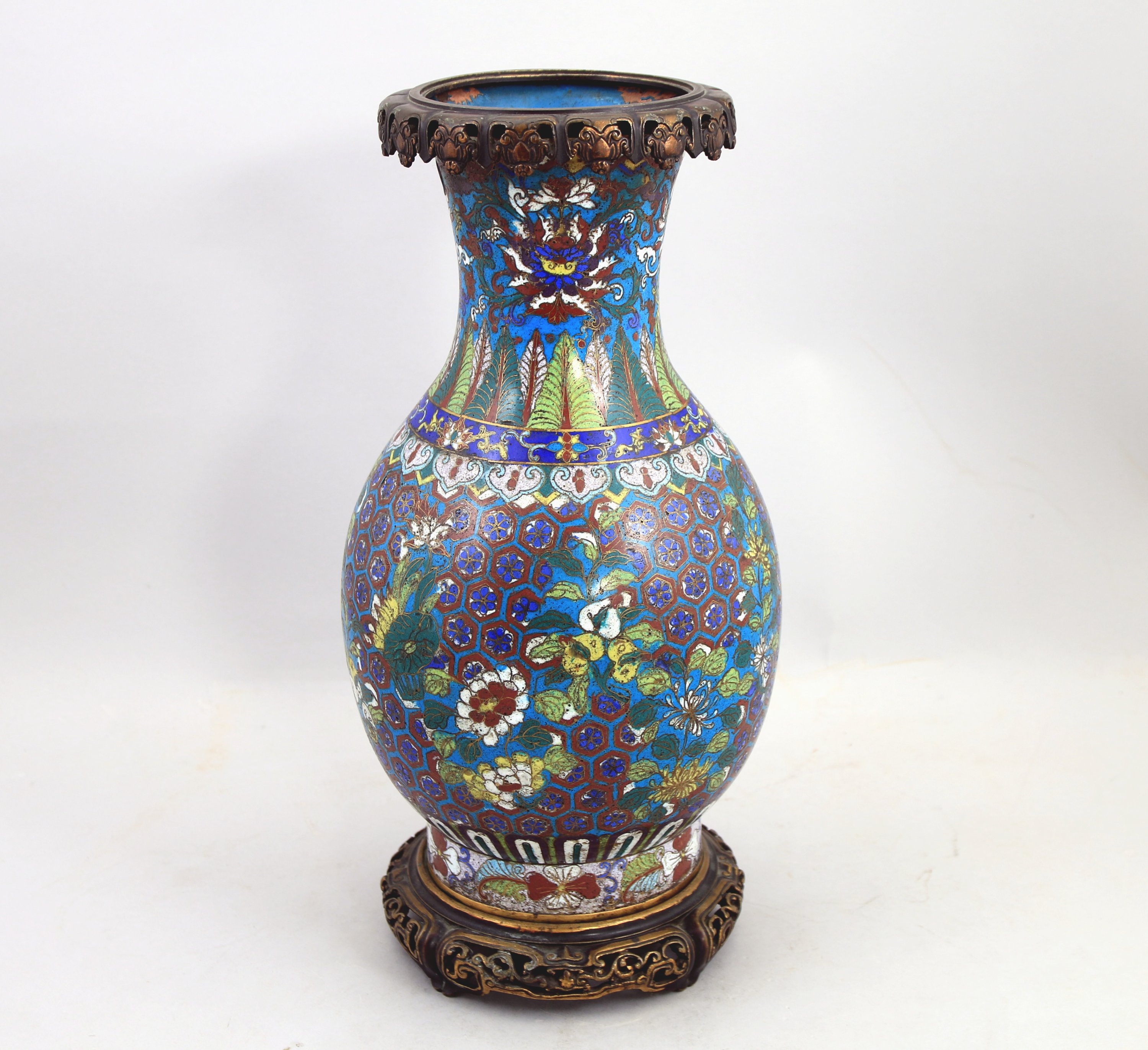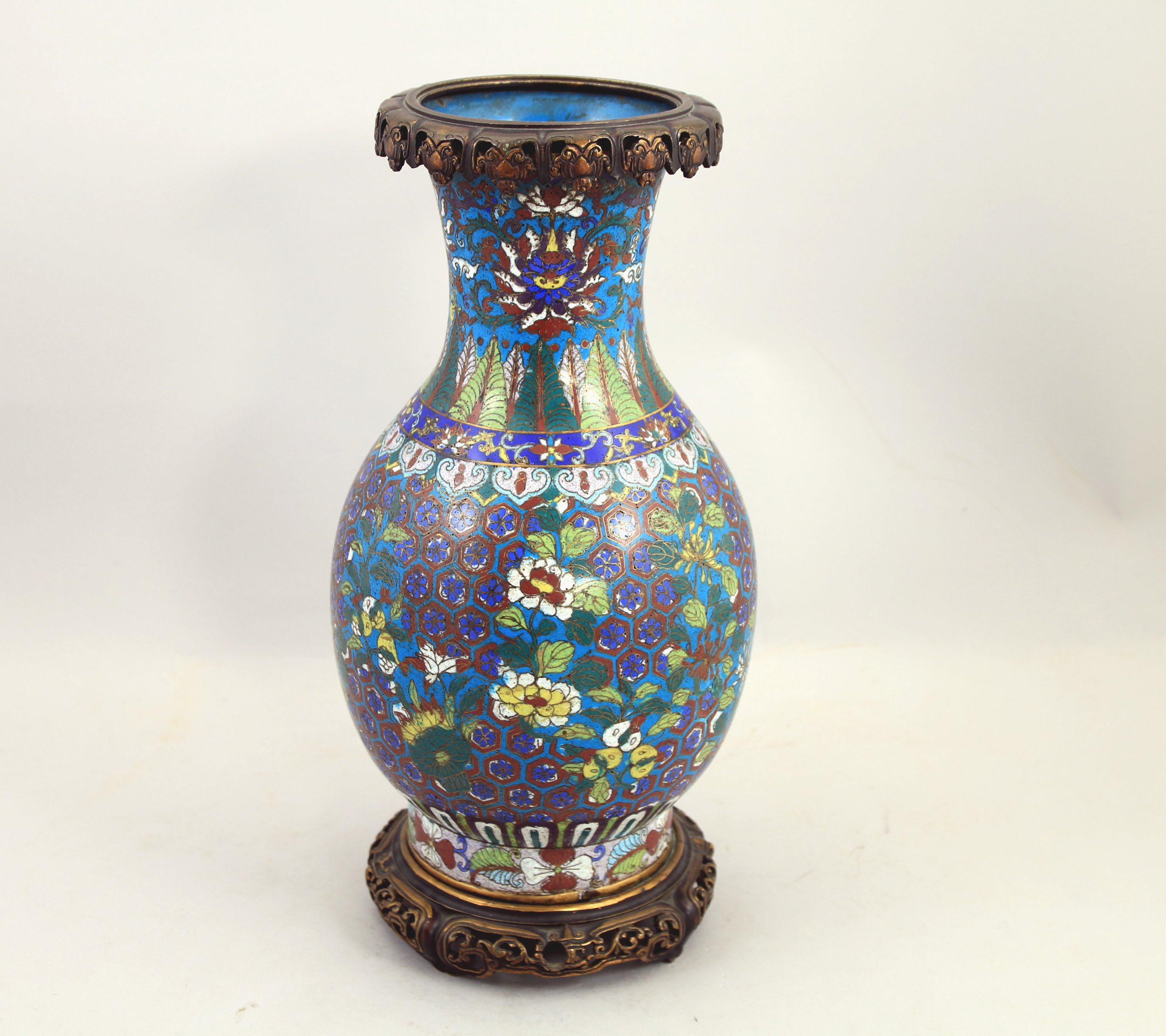 VASE à col évasé en bronze et émaux cloisonnés à décor de grenades, chrysanthèmes et pivoines, le col orné de fleurs de lotus et feuilles. Monture en bronze partiellement doré.