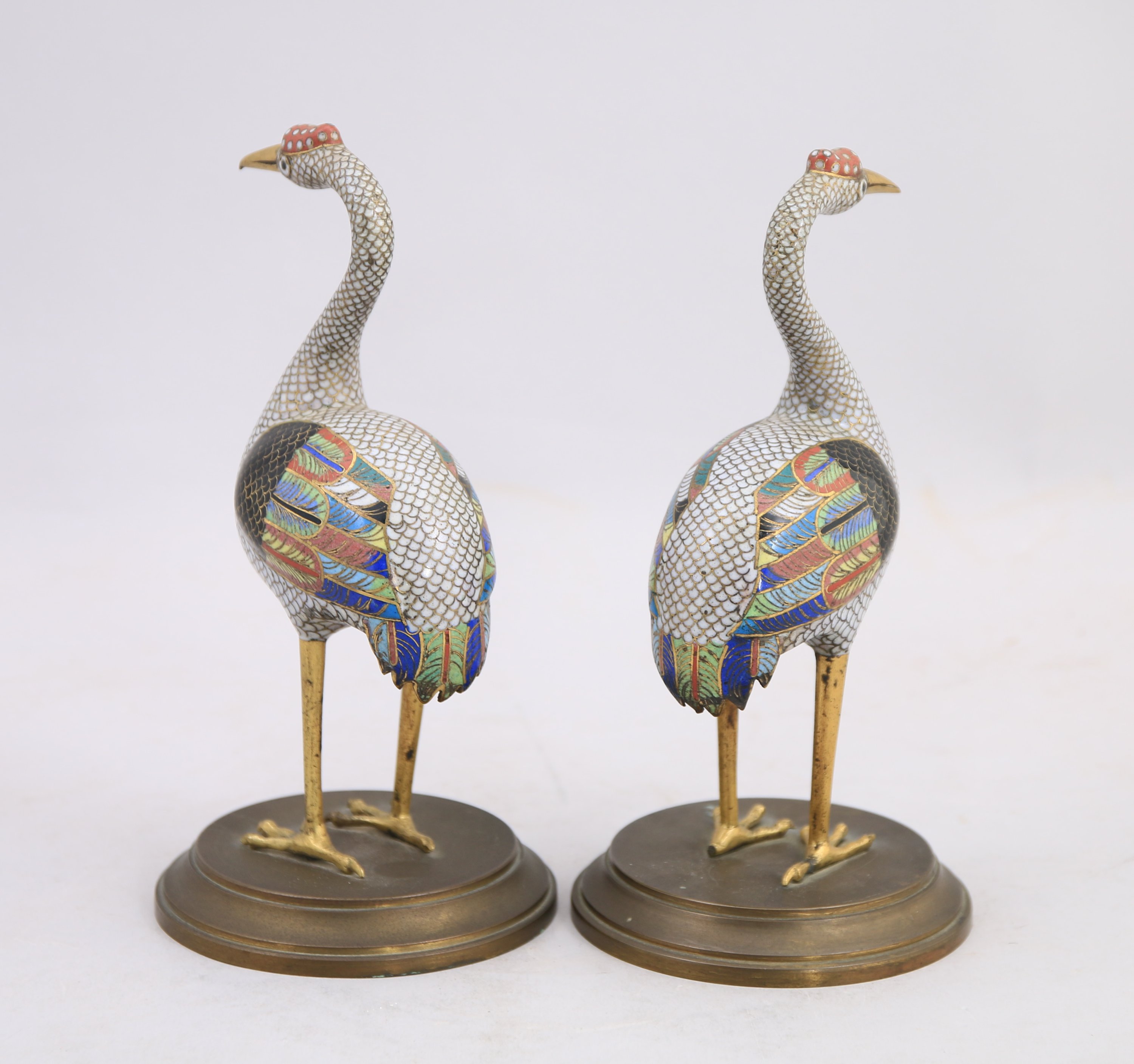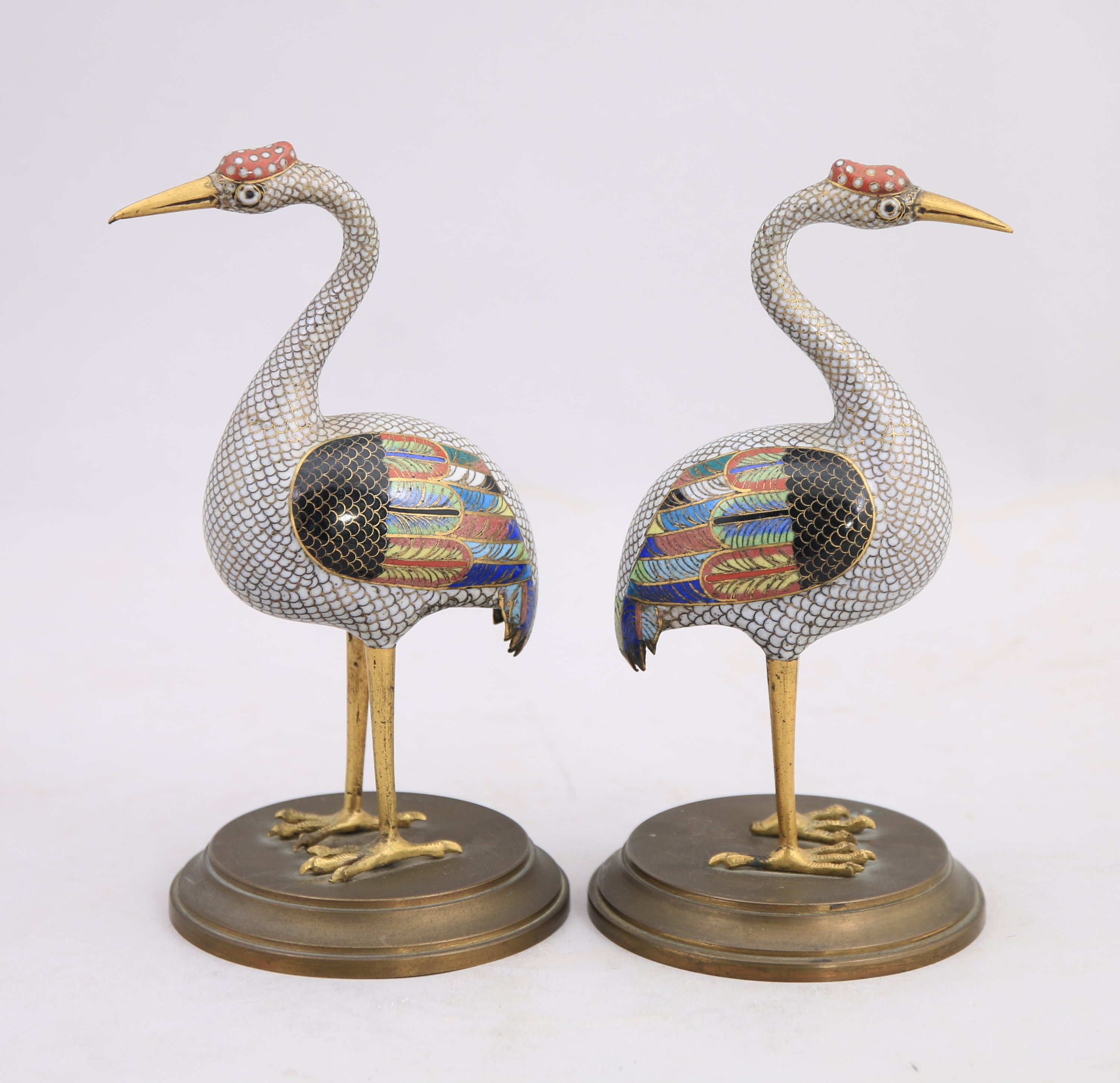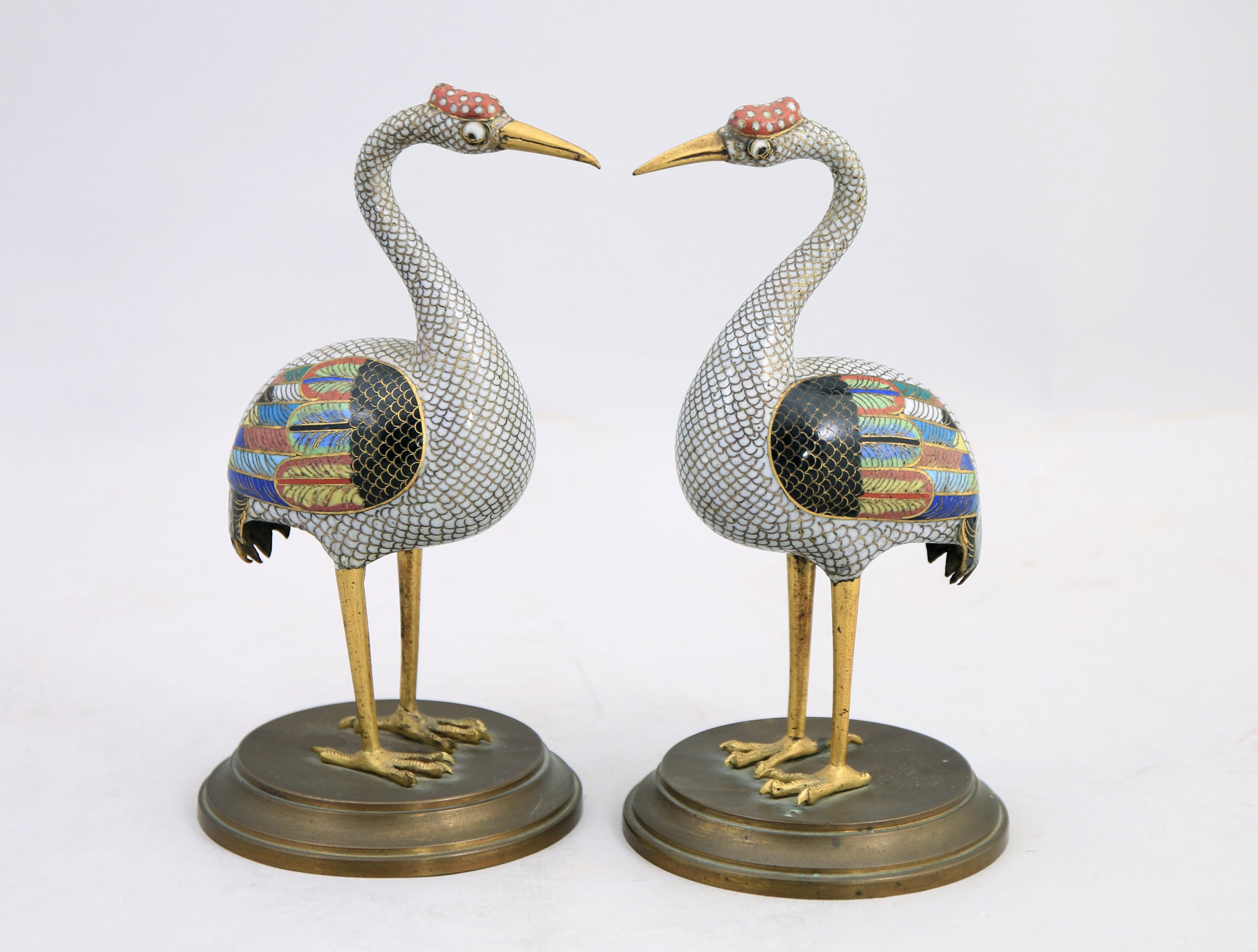 Paire de petites GRUES debout sur des bases en bronze et émaux cloisonnés, leur plumage blanc, les plumes des ailes figurées multicolores.