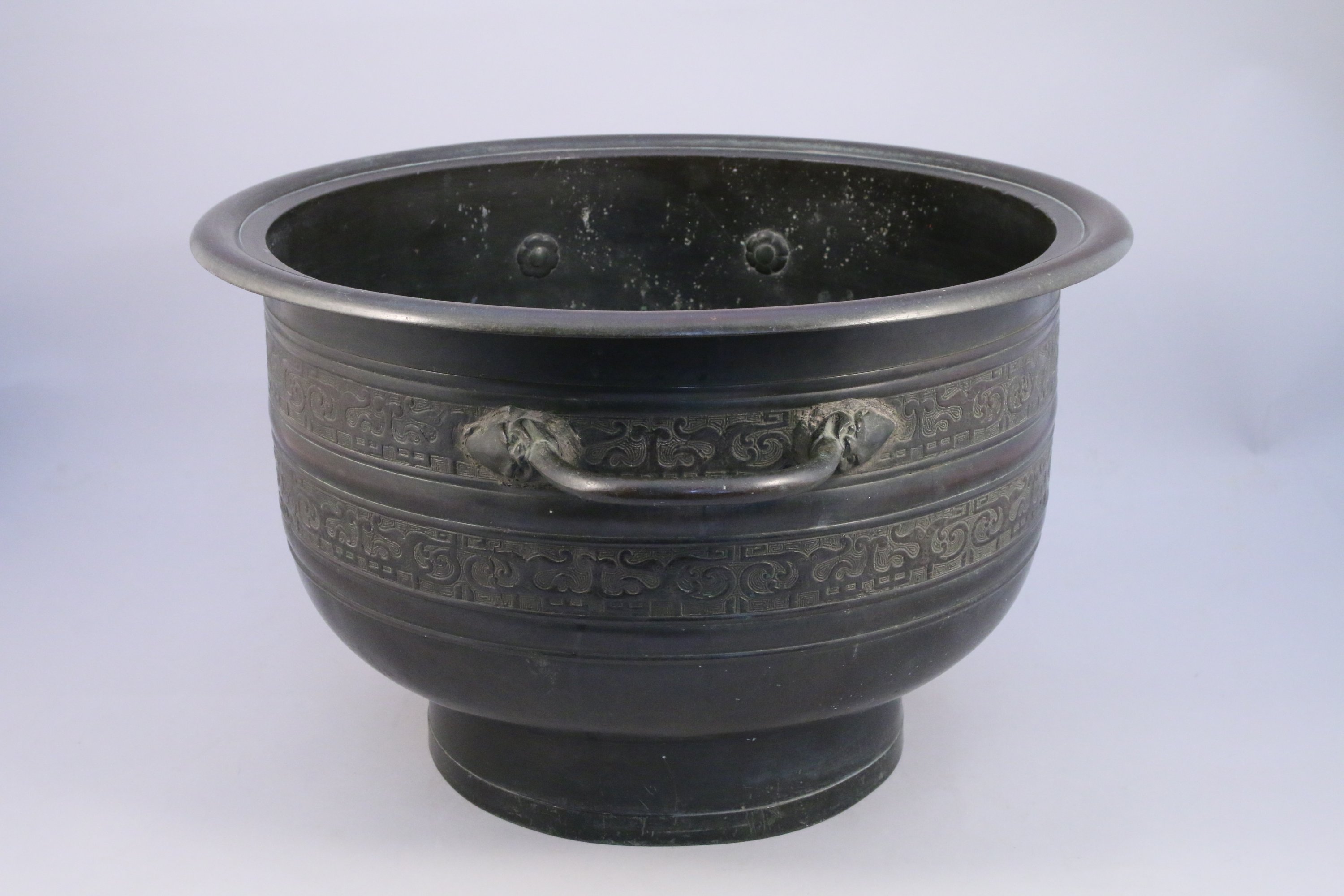 VASQUE à deux anses en bronze à patine brune à décor ciselé sur la panse de motifs archaïsants sur fond de spirales.