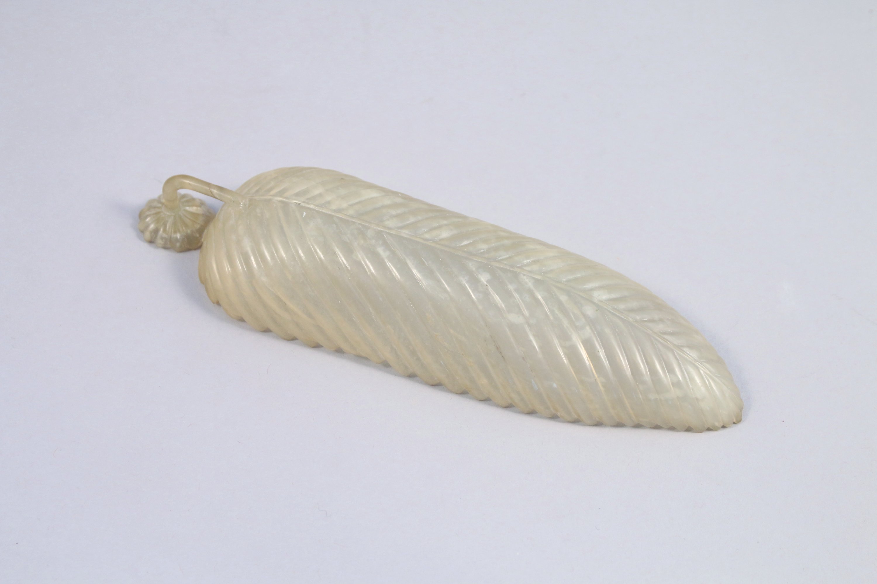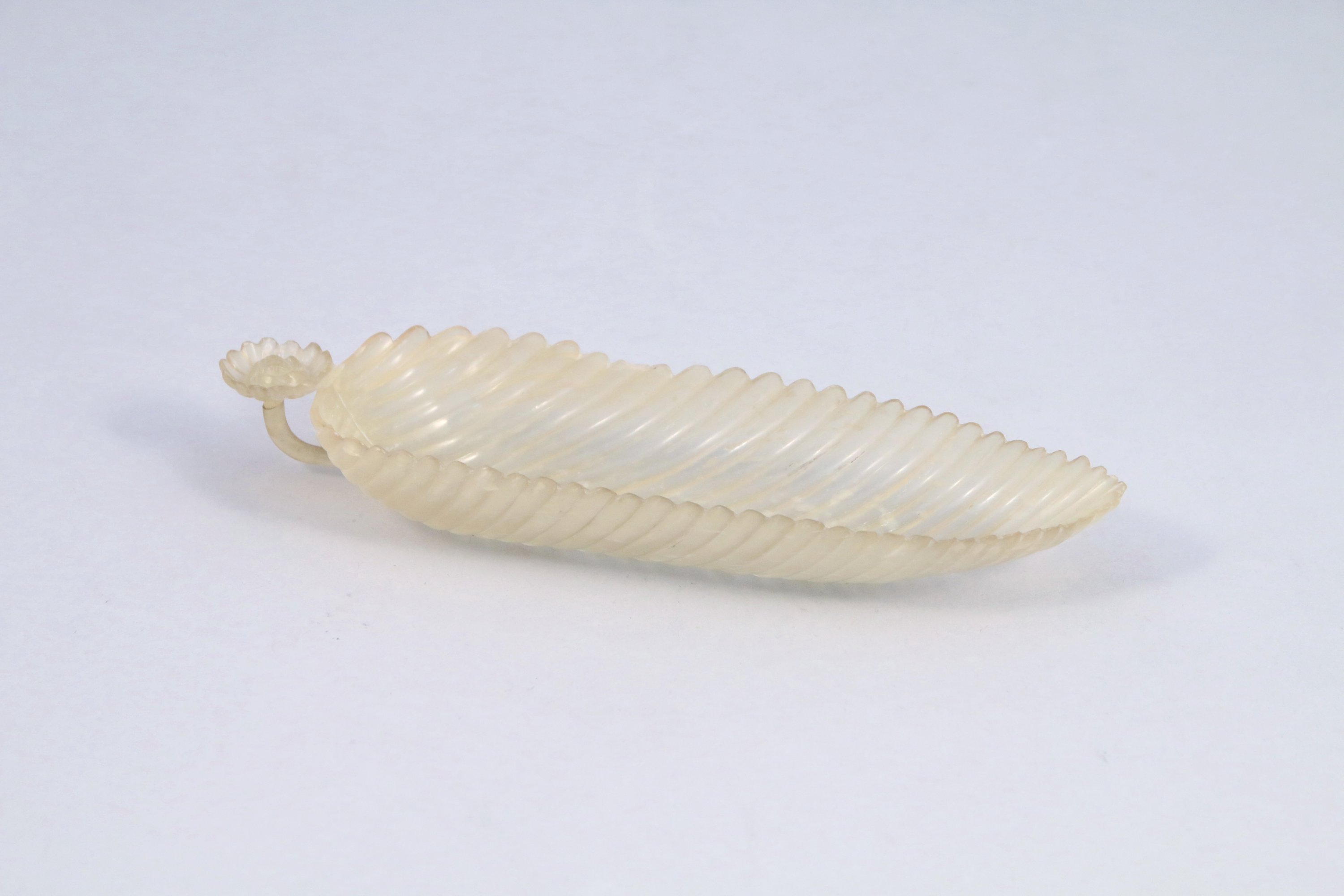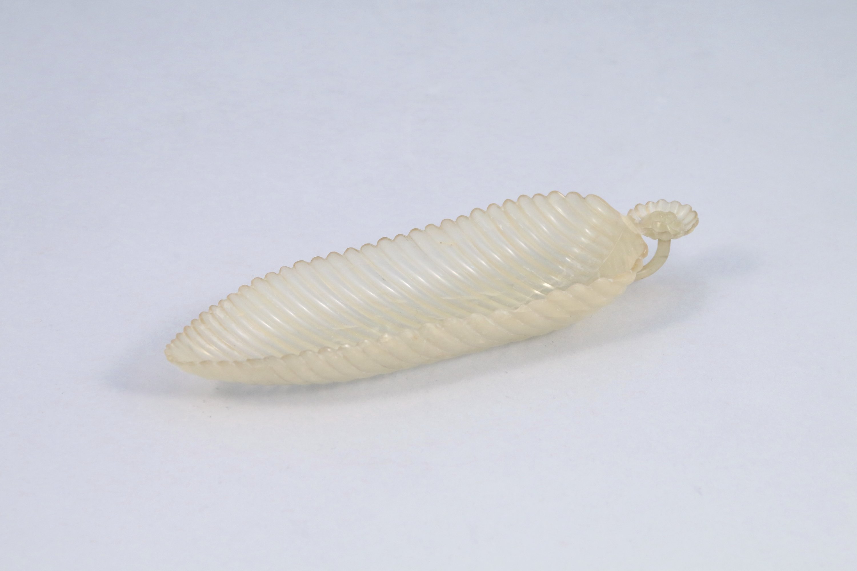 COUPE godronnée en forme de feuille en agate claire, l'anse en forme de fleur.