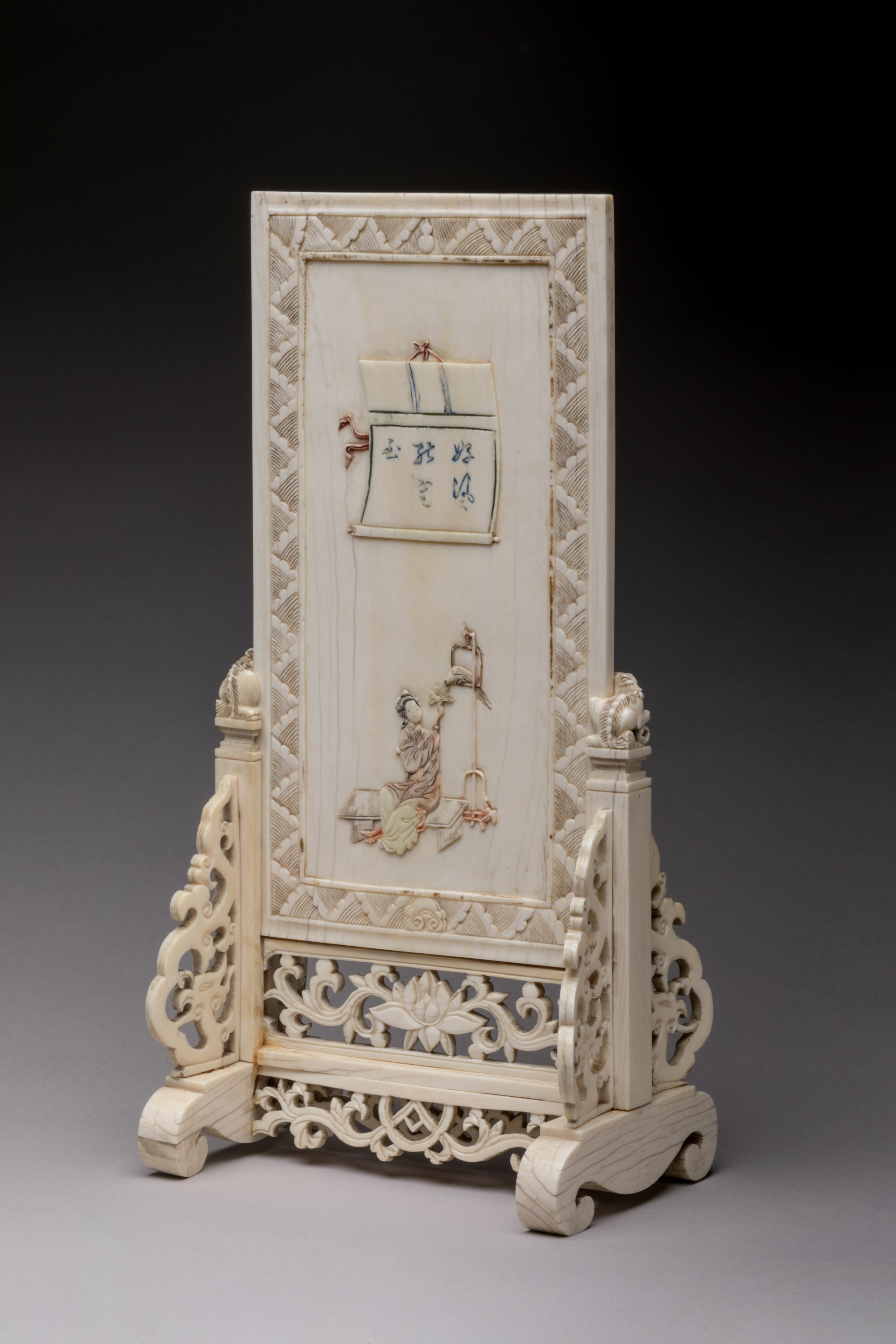 ÉCRAN DE TABLE en ivoire, à traces de polychromie, sculpté en bas-relief sur une face de deux lettrés près d'une rive et d'un pêcheur en barque, sur l'autre face d'une jeune femme nourrissant un perroquet sur son perchoir sous un rouleau déplié orné d'un poème. Le socle ajouré de lotus.