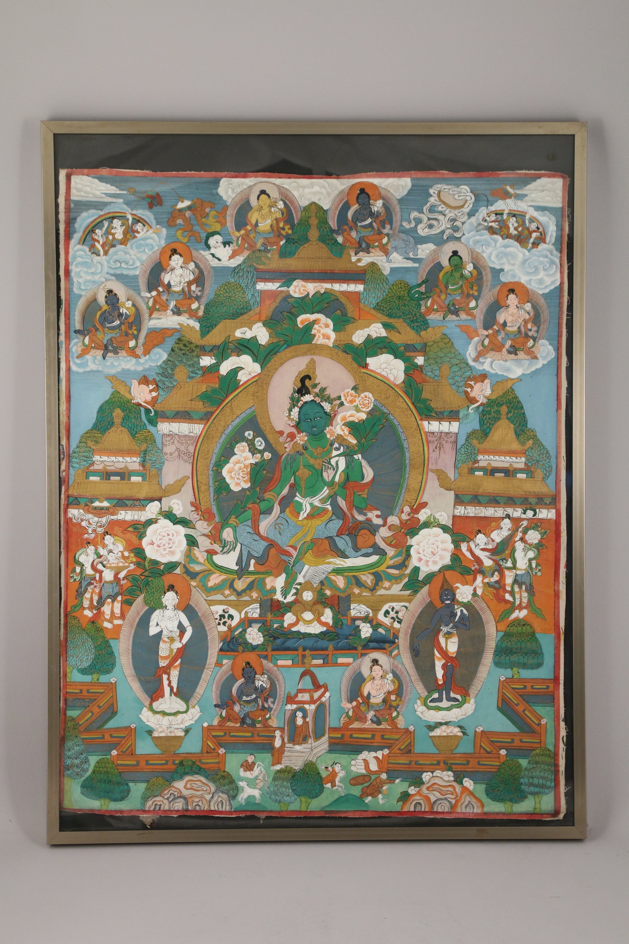 TANGKA, détrempe sur toile, Tara verte assise au centre surmontée de six Tara.