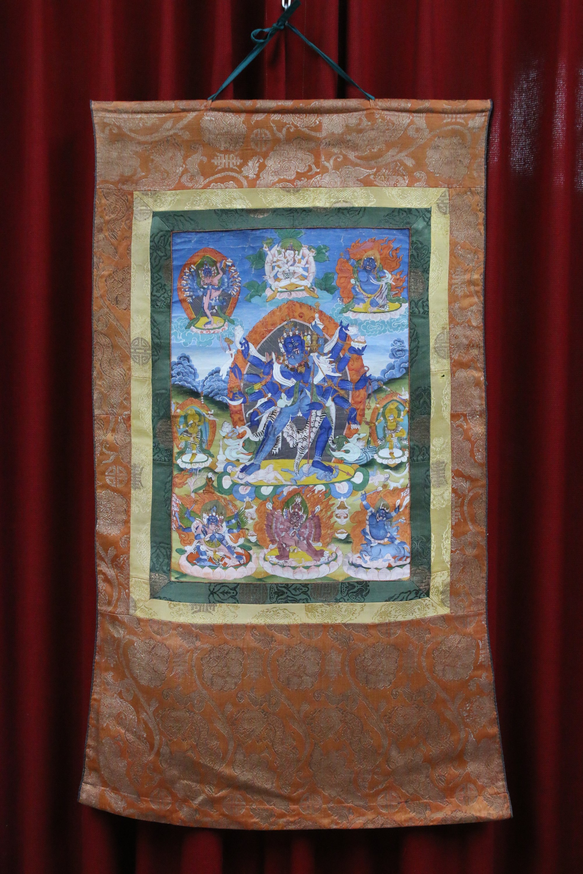 TANGKA, détrempe sur toile, Chakrasamvara debout sur des démons et enlacé avec sa Sakti en yab-yum, entourés de divinités féroces.
