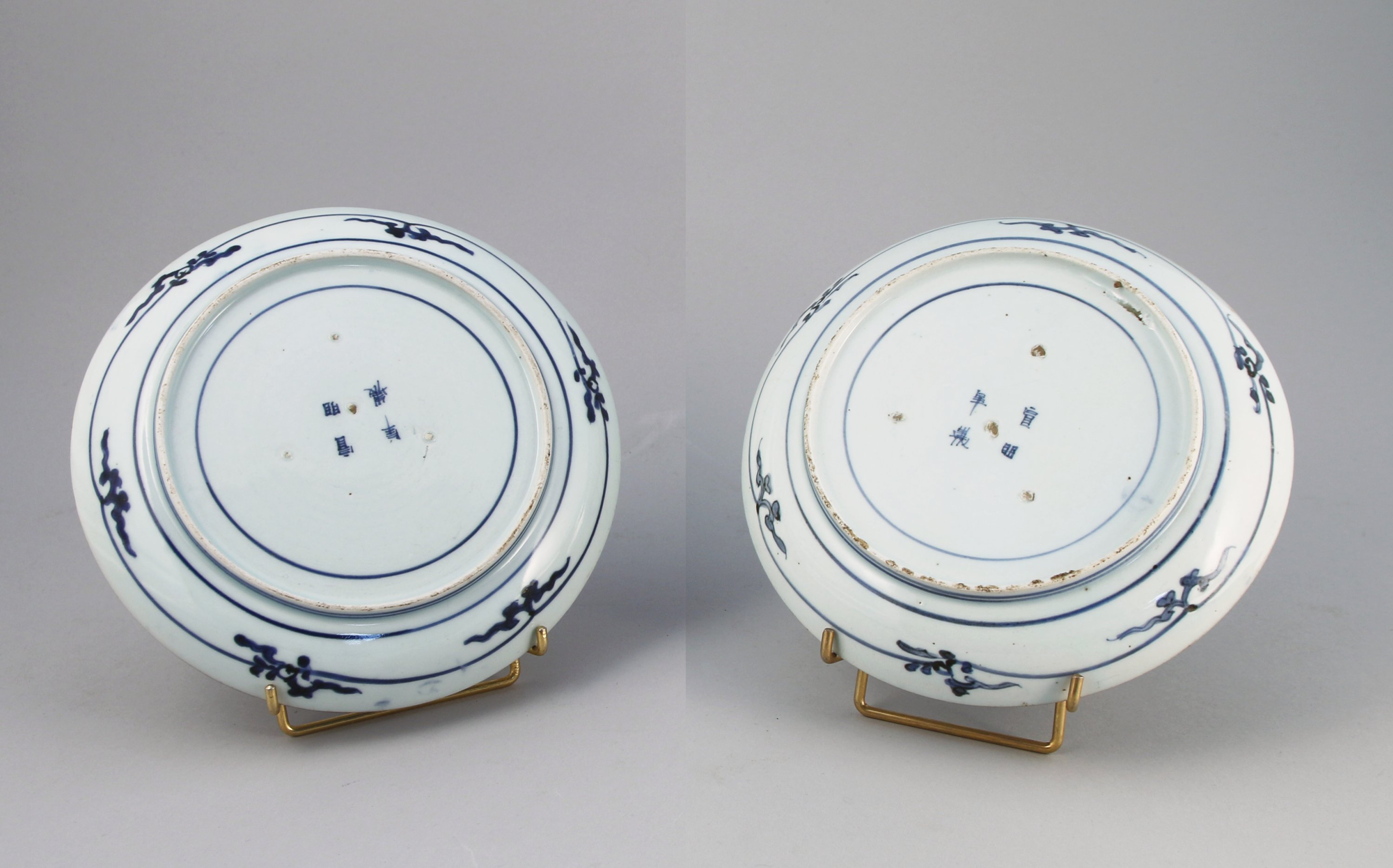 Paire d'ASSIETTES en porcelaine à décor en bleu sous couverte de vagues et de fleurs sur l'aile, le centre orné d'une fleur.