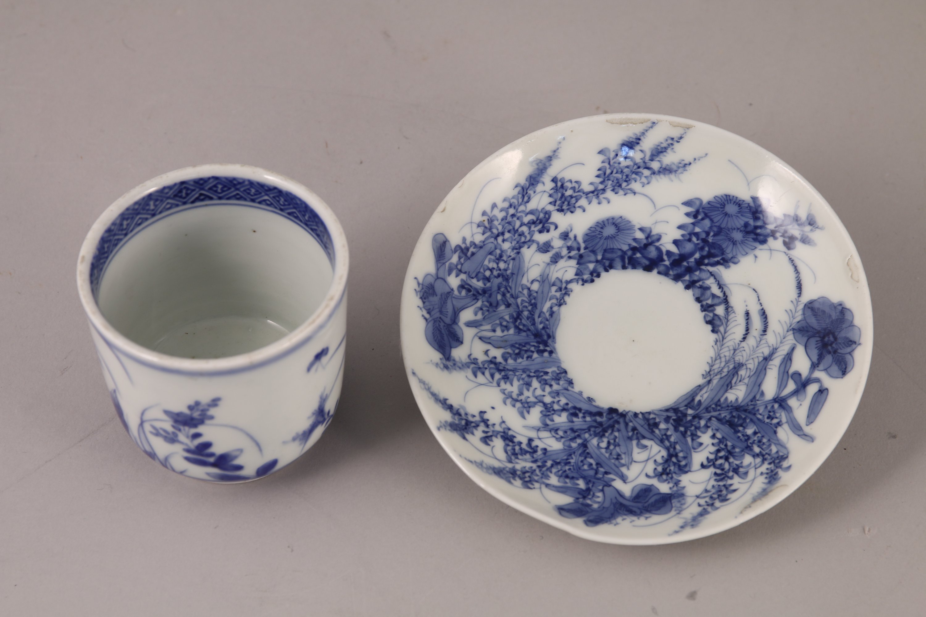 SORBET et PRÉSENTOIR en porcelaine bleue et blanche à décor de fleurs des quatre saisons dans leur feuillage.