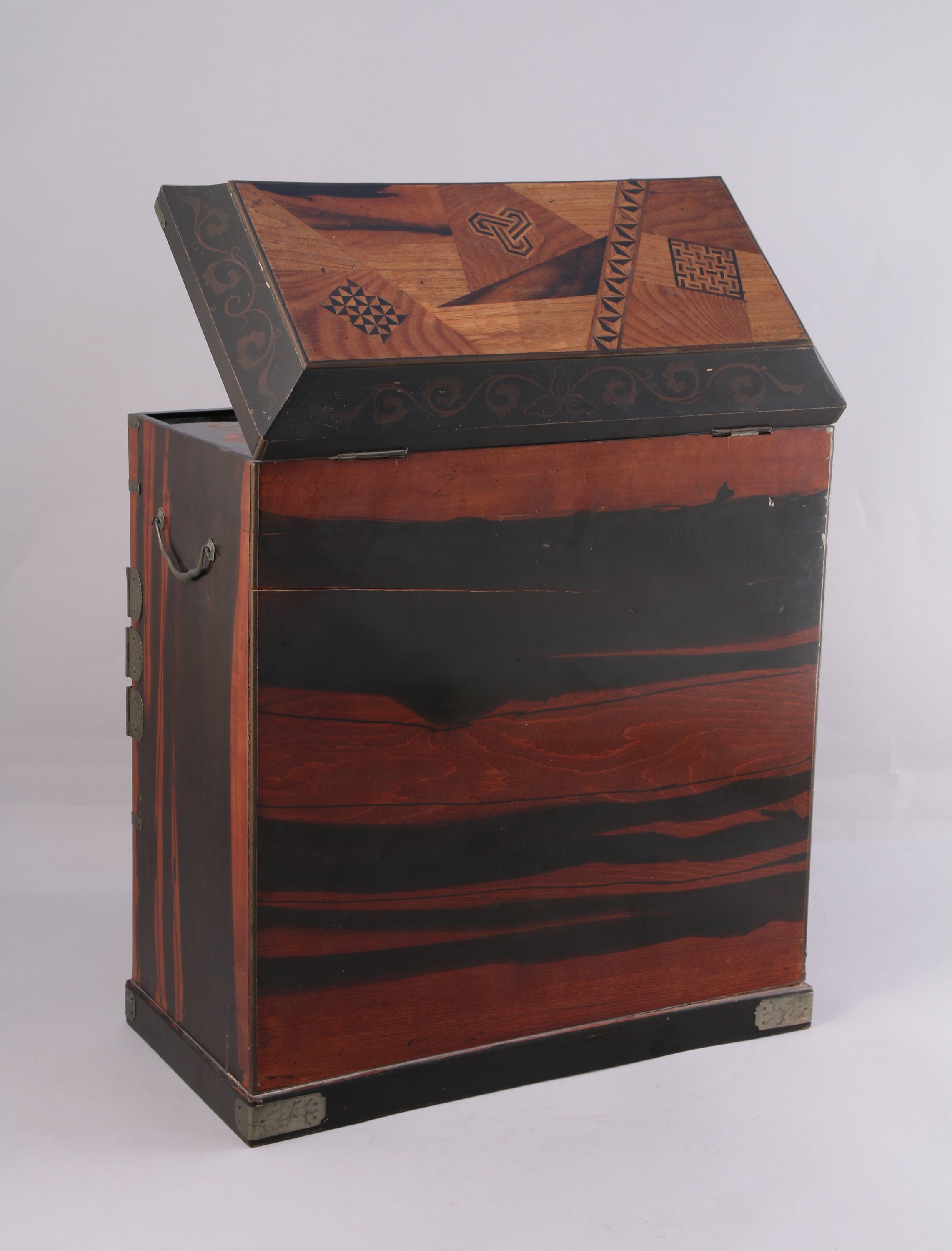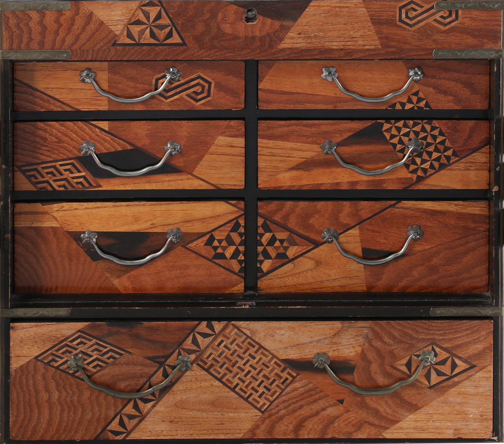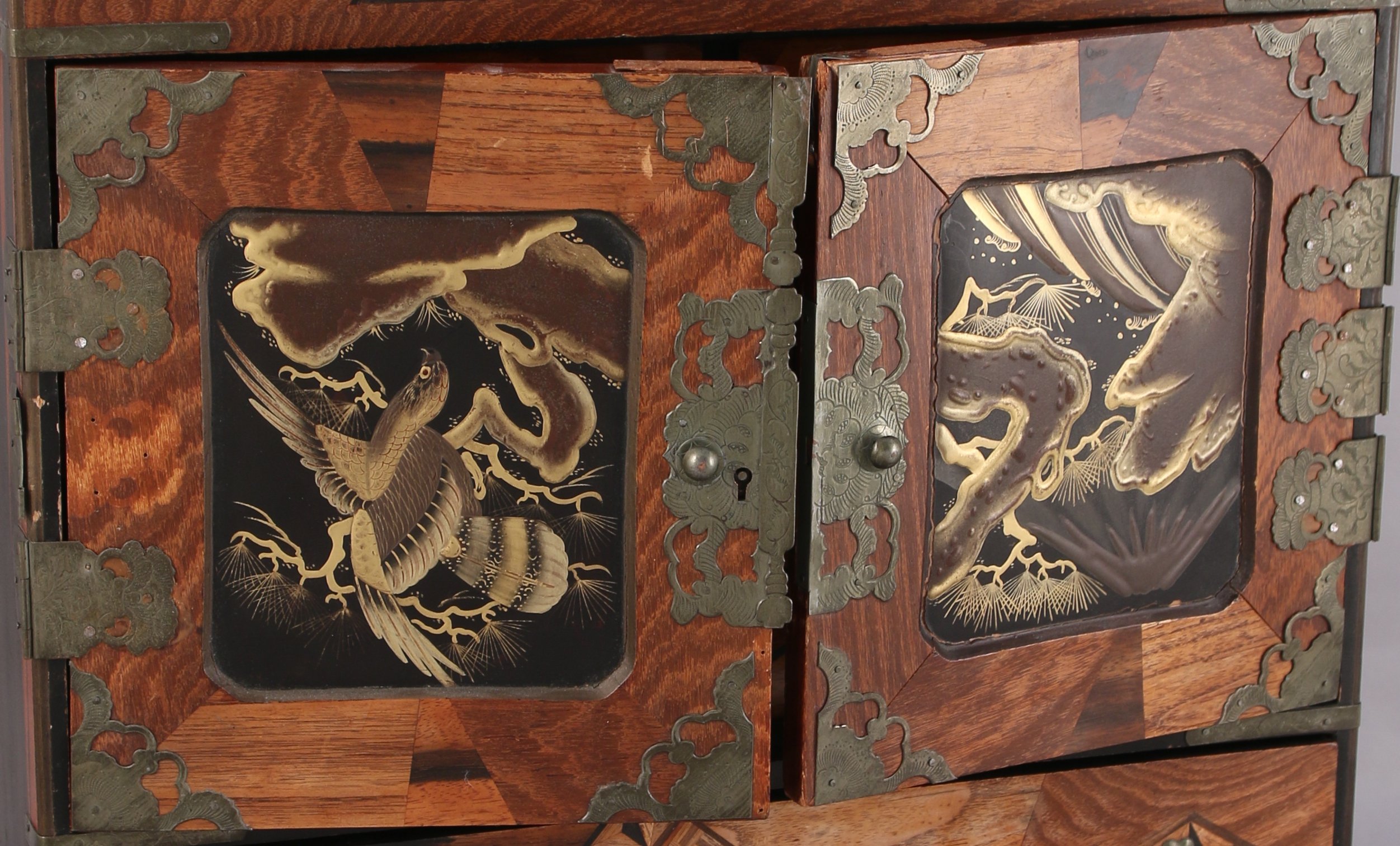 Petit CABINET ou ARMOIRE À PHARMACIE de forme rectangulaire en placage à décor en marqueterie dite Yosegi de figures géométriques stylisées. Il ouvre en façade par un tiroir et deux vantaux incrustés d'un panneau de laque or sur fond noir. Celui de gauche figure un rapace. Ils découvrent six tiroirs. La partie supérieure est munie d'un couvercle découvrant un intérieur compartimenté laqué. Garnitures de métal ciselé telles que mains tombantes, pentures et ferrures.