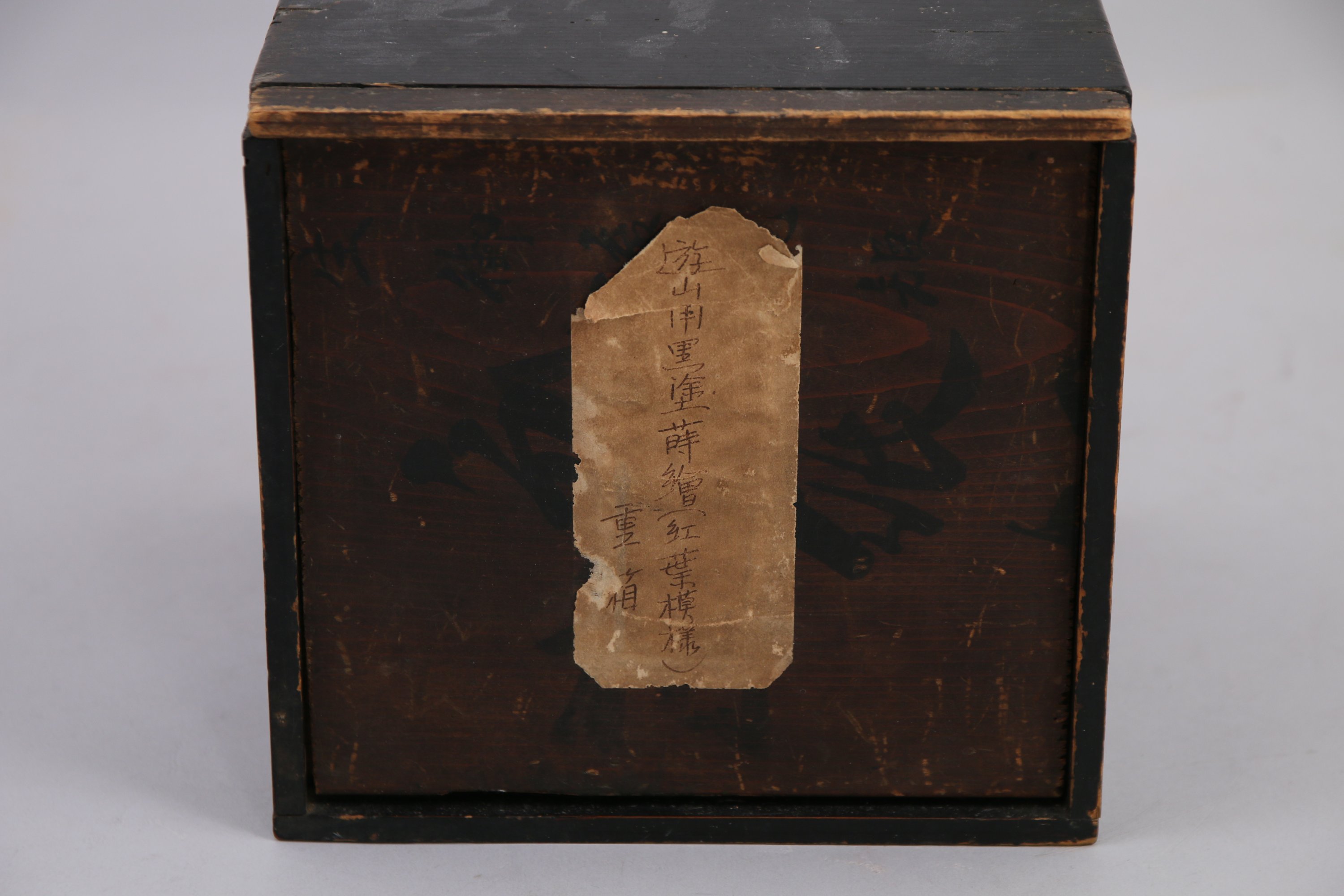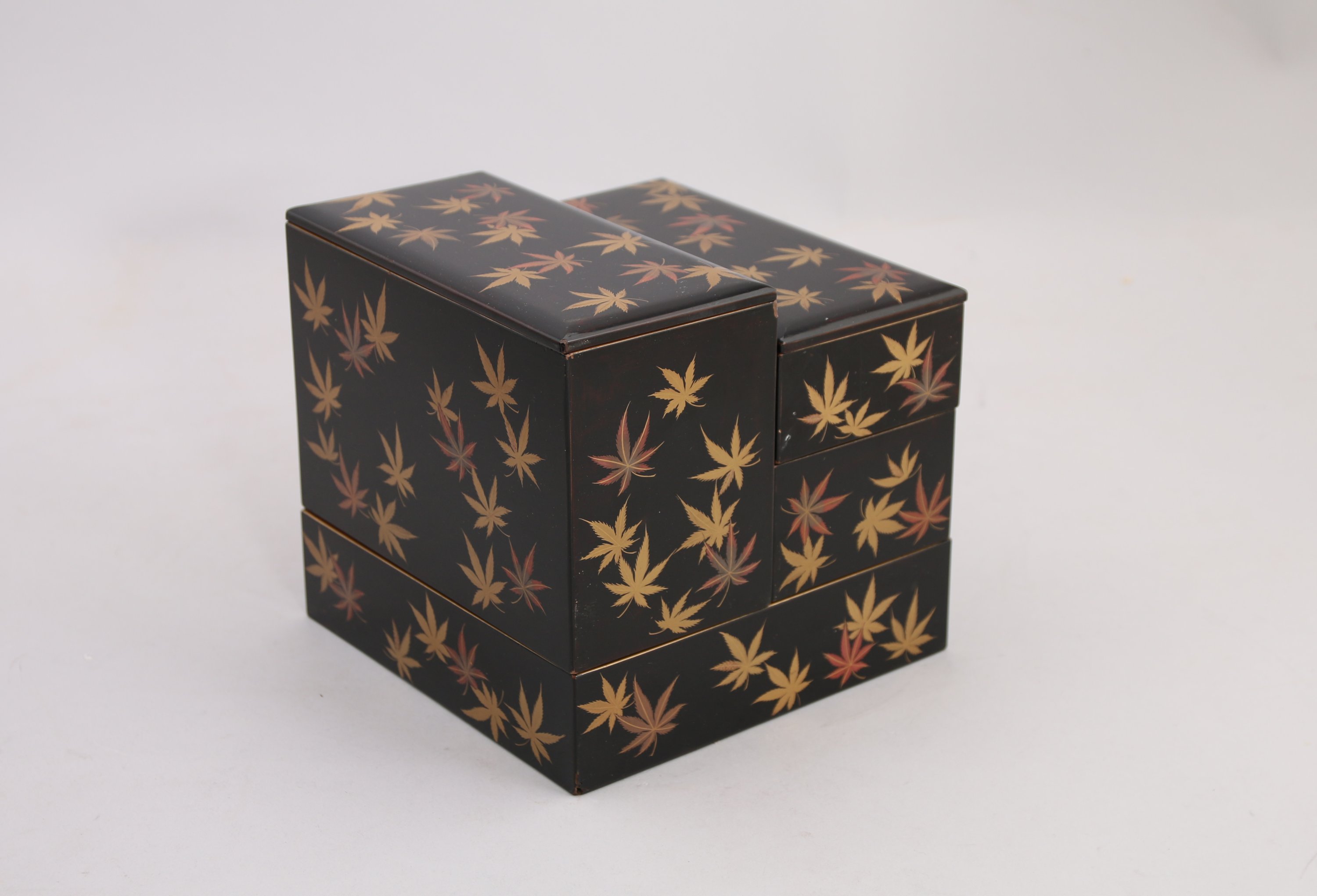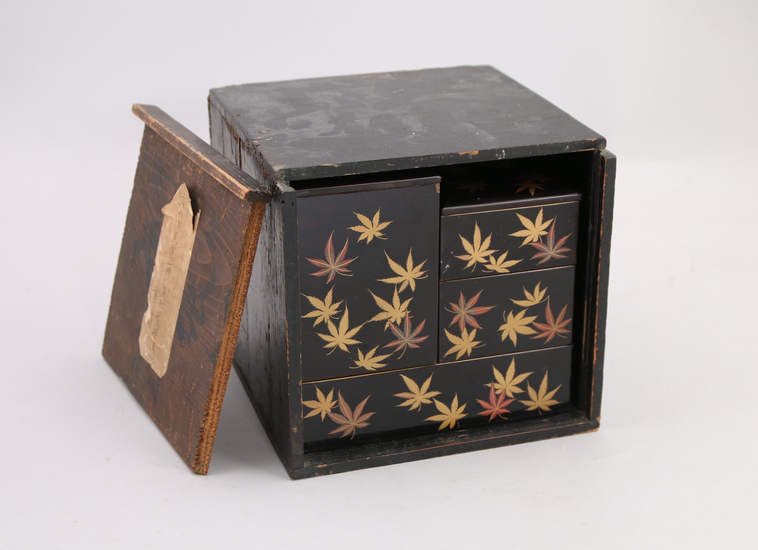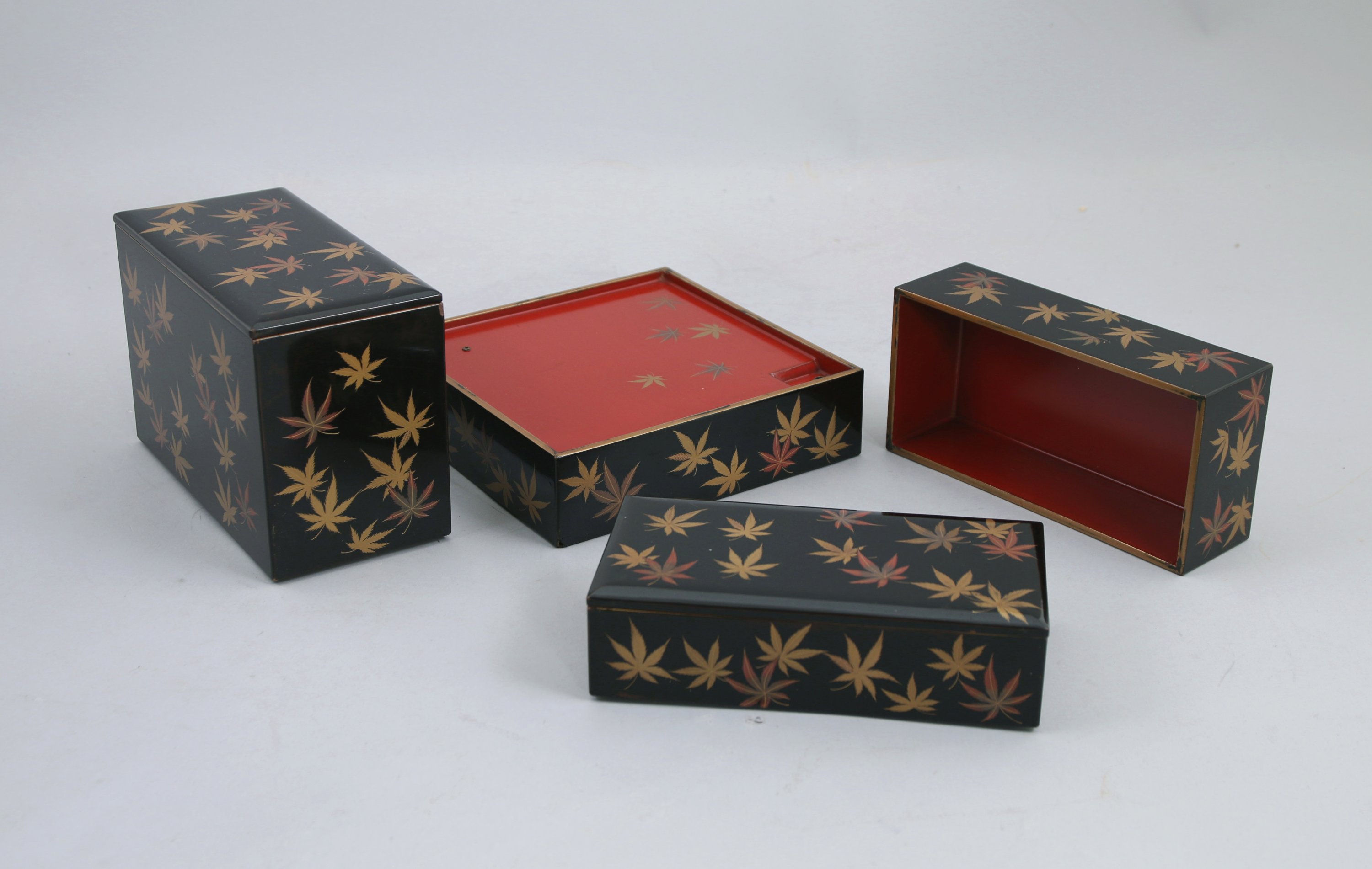 NÉCESSAIRE composé de quatre BOÎTES en laque noire décorée en hira maki-e de laque or et rouge de feuilles d'érable. Dans une boite en hinoki.