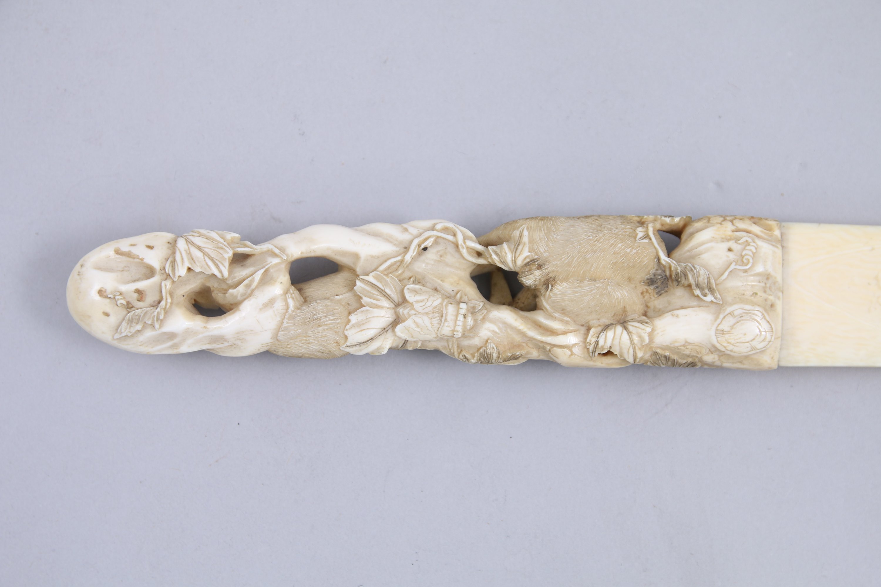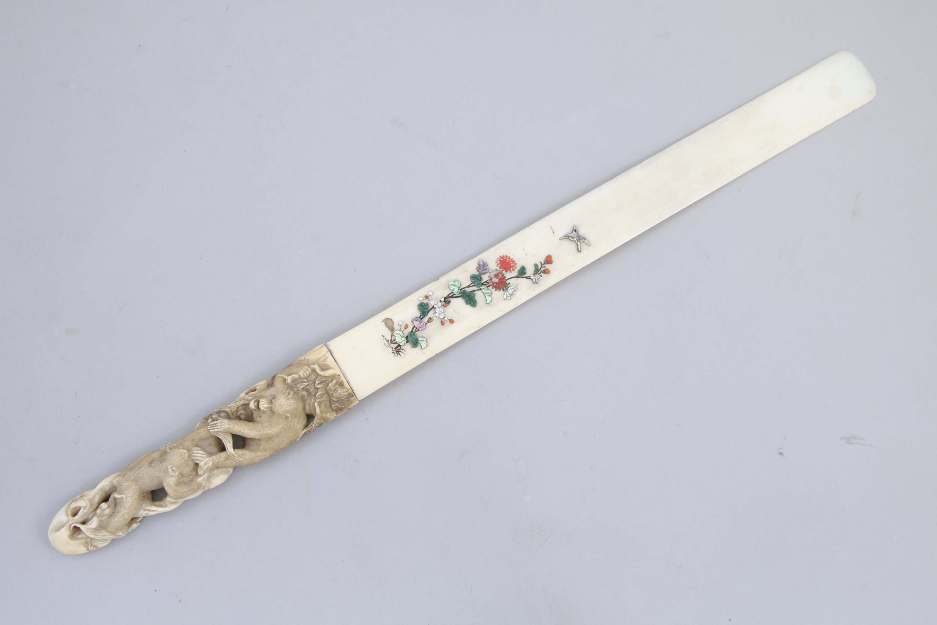 COUPE-PAPIER en ivoire, le manche à décor de singes se battant autour de chauves-souris dans un tronc d'arbre où se trouve des abeilles. La lame à décor incrusté en shibayama de nacre et corail de branches de chrysanthèmes survolés par un oiseau et papillon.
