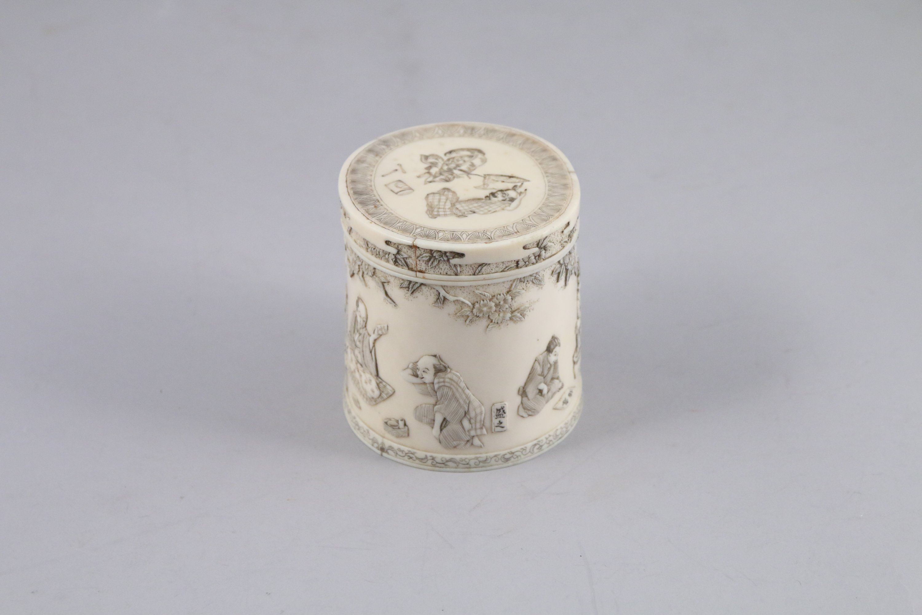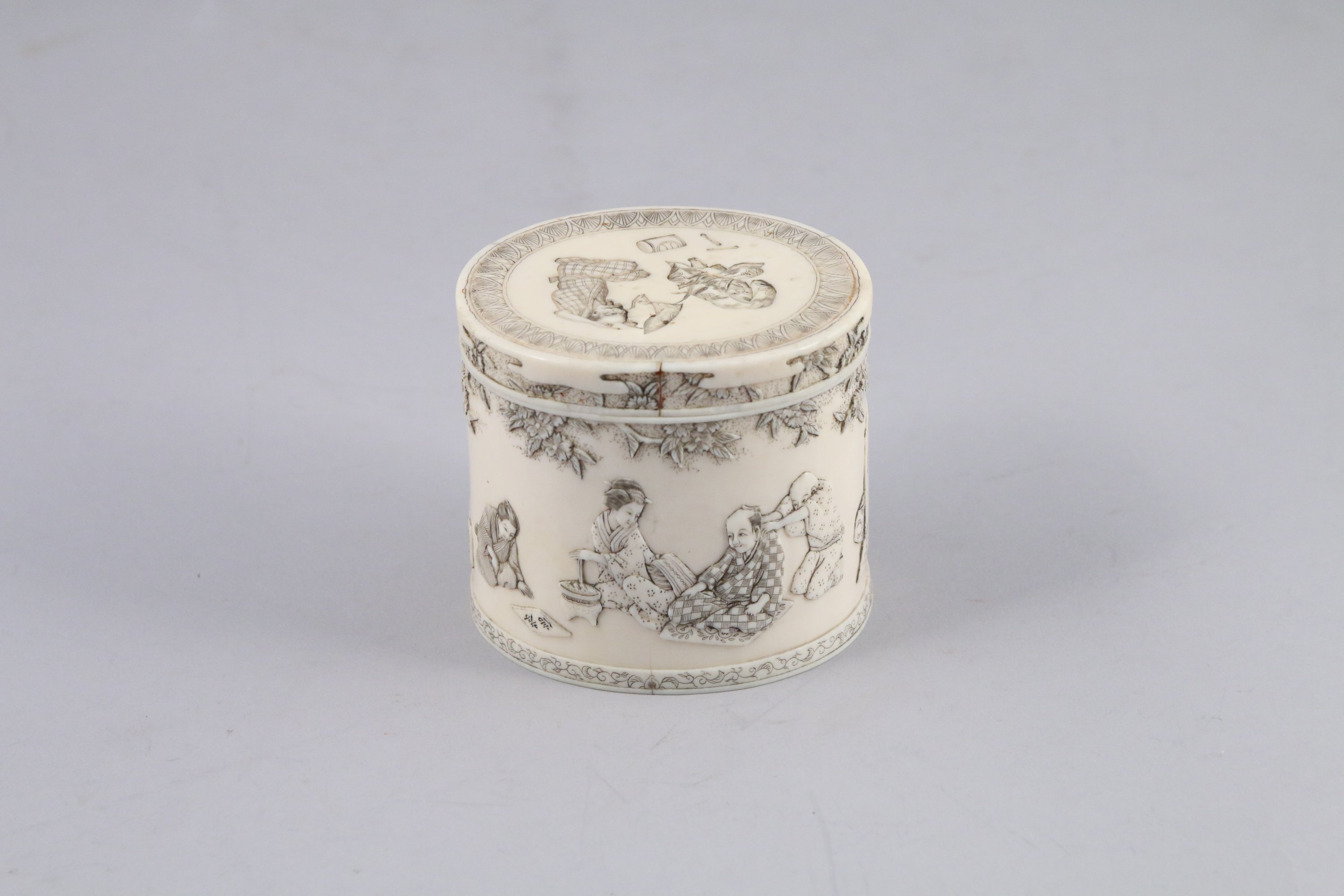 BOÎTE ovale en ivoire à décor en léger relief de personnages préparant des repas, un homme se faisant masser le dos derrière un écran.
