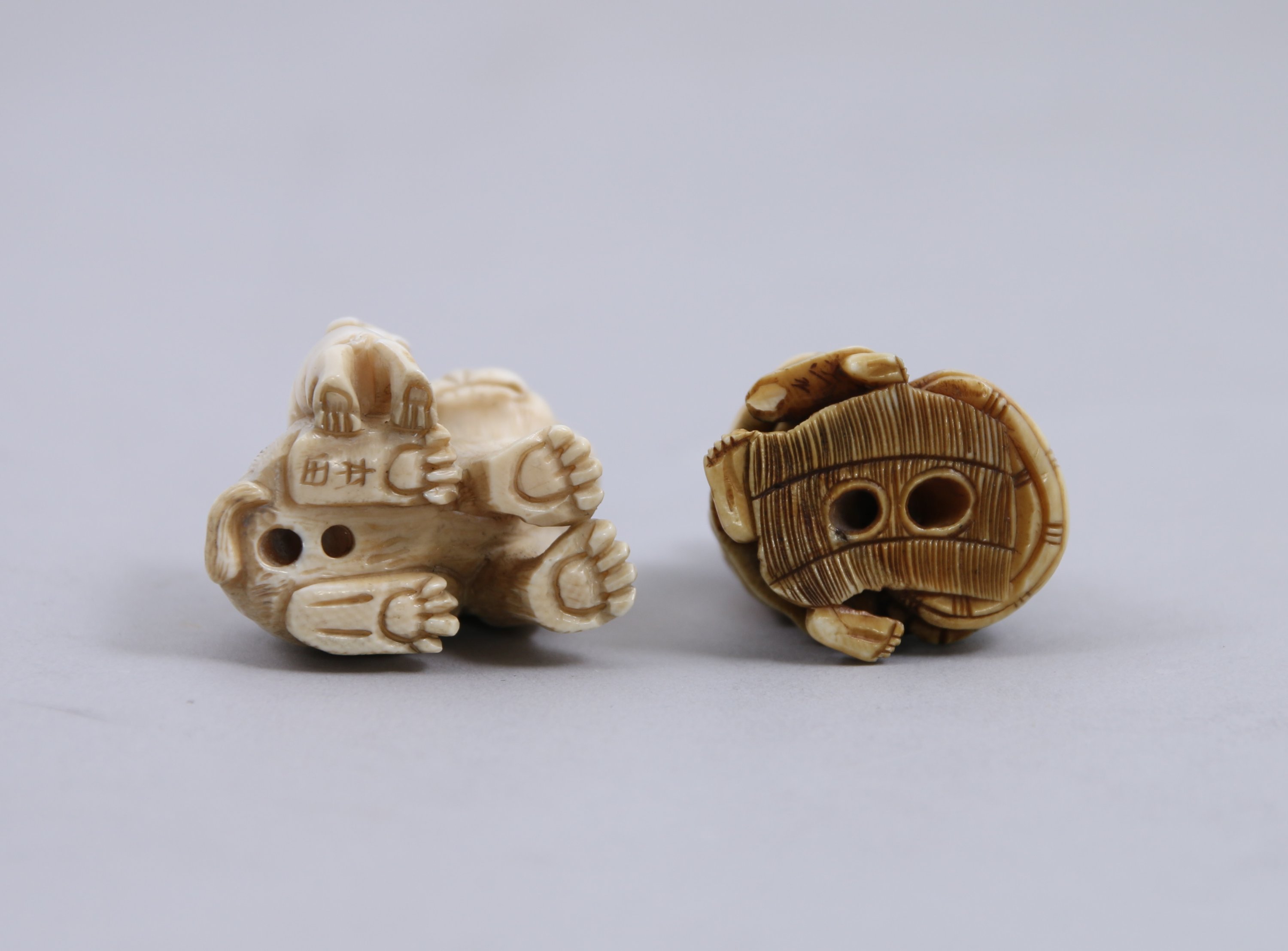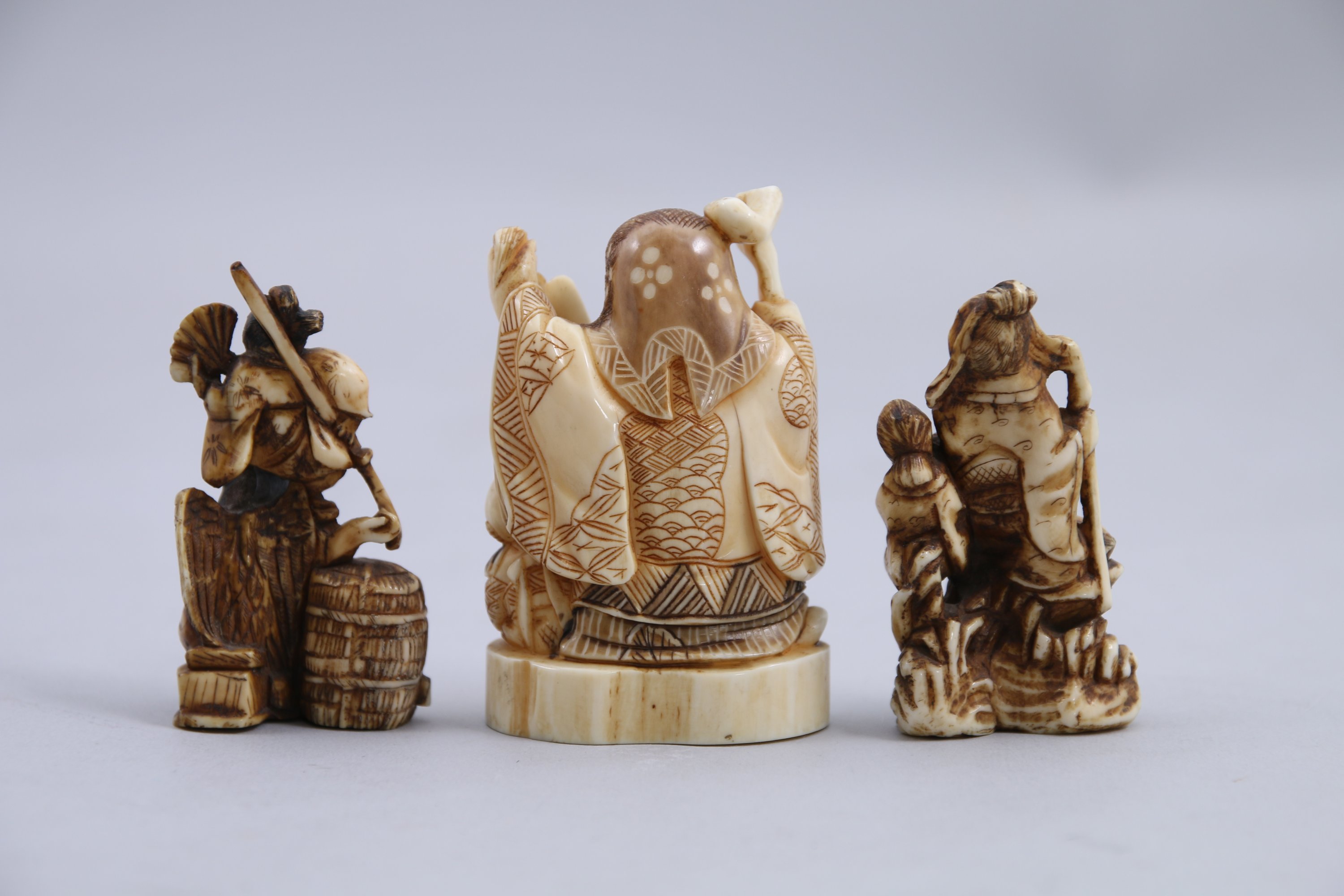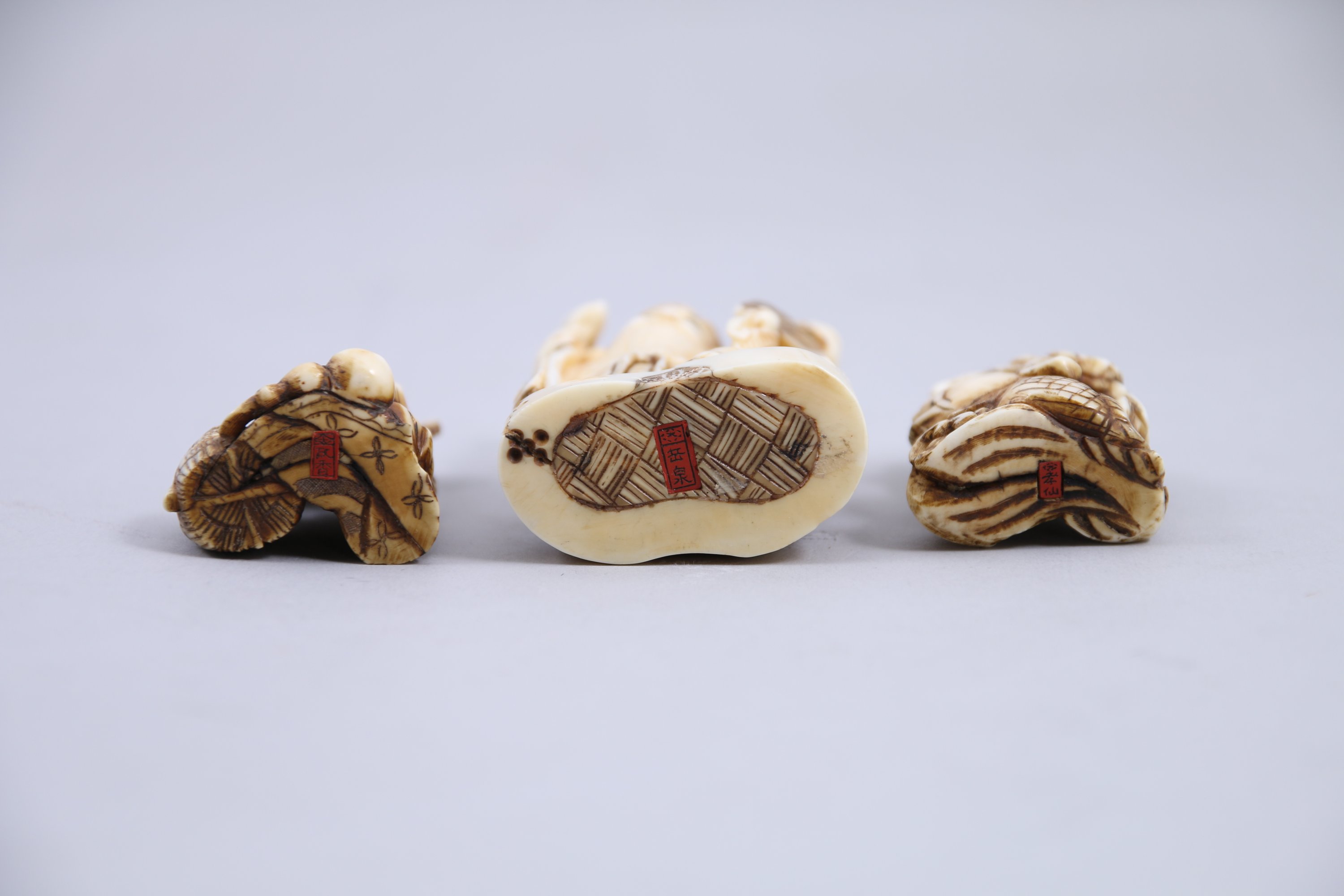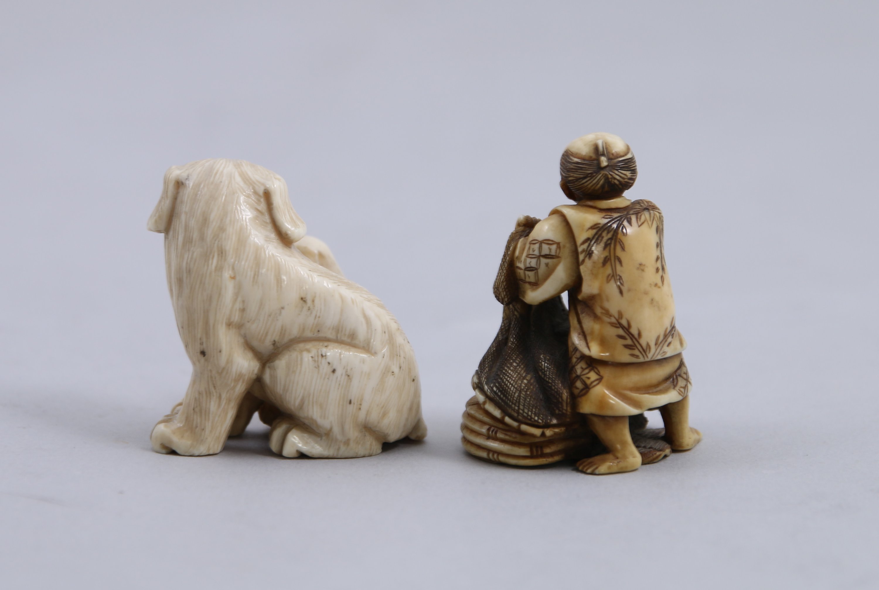 CINQ petits OKIMONOS dans le style des netsuke, dont deux en dent d'hippopotame, un en dent de morse et deux en ivoire, représentant des danseurs, pêcheurs, Jurojin et chiots.