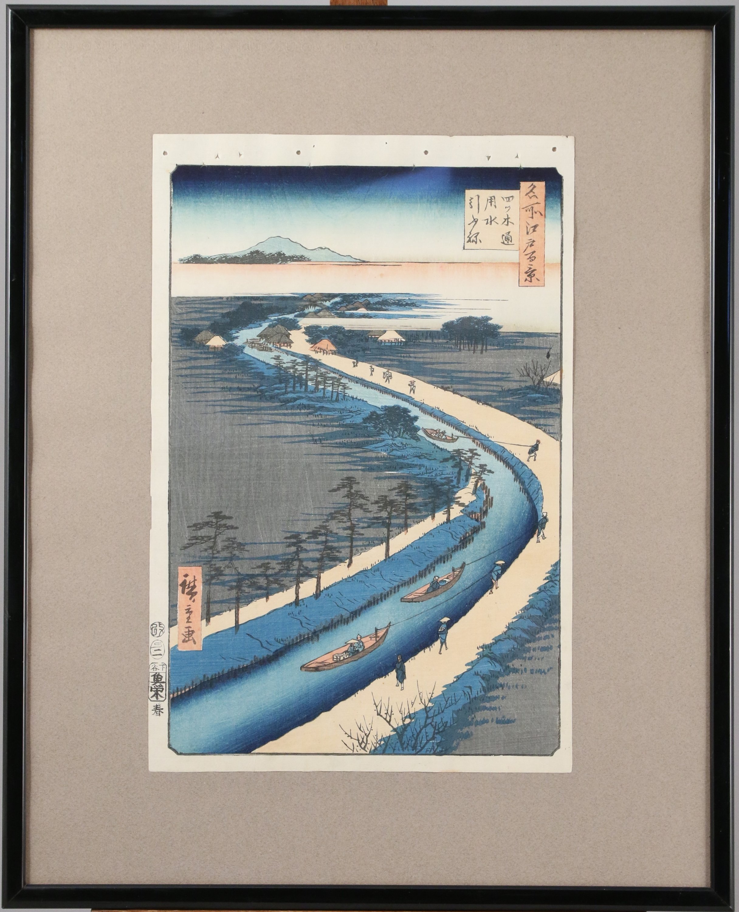 Deux OBAN-TATE-E de la série Meisho Edo hyakkei, les Cent vues d'Edo, le temple d'Azuma et le canal de Yotsugi-dori.
